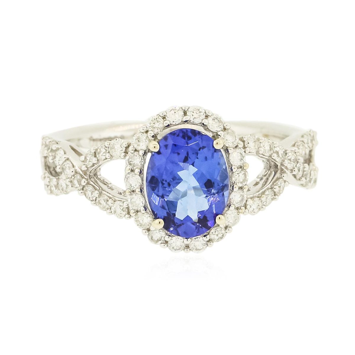 One electronically tested 14KT white gold ladies cast tanzanite and diamond ring with a bright polish finish. The featured tanzanite is set within a diamond bezel supported by intertwining diamond set shoulders, completed by a two millimeter wide band. Trademark is Orianne. Identified with markings of "14K". Condition is new, good workmanship. Containing: One prong set oval mixed cut natural tanzanite, measuring 8.10 x 6.10 x 3.65mm, 6% bulge factor, approximate weight of 1.31ct., clarity is eye clean, type I, medium dark, very slightly grayish, violetish blue color, (GIA vB 6/3), cut is good. Transmitting light with no distortion, transparent. Graded in the setting. Tanzanite is a very rare gemstone that is only found in the country of Tanzania. Originally discovered in 1967. Tiffany & Company, named the stone Tanzanite. It is found in the Usumburu Mountains that border the Umba Valley of northern Tanzania. Tanzanite occurs in gray, brown, violet, blue, reddish-purple, & green. The gem is interesting because of its exceptional pleochroism. Rotated in different directions a tanzanite will exhibit multiple changes of color. Tanzanite has a low tolerance to ultrasonic cleaning, and should not be cleaned using this method. Forty-Six prong set round brilliant cut diamonds, measuring 1.30 - 1.20 x 0.75mm (depth est.) approximate total weight of 46 Stones = 0.42ct. Graded in the setting. Clarity: I-1 to I-2. Color: G - I. Total Weight of Colored Stones 1.31ct. Total Weight of Diamonds 0.42ct. Total Weight of Ring 3.42 grams. AIG Appraised at $4,310.00.