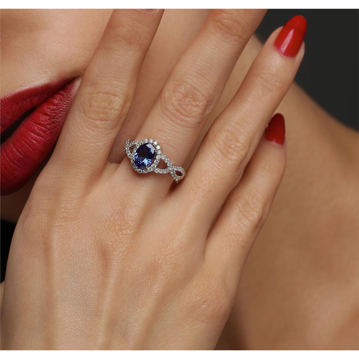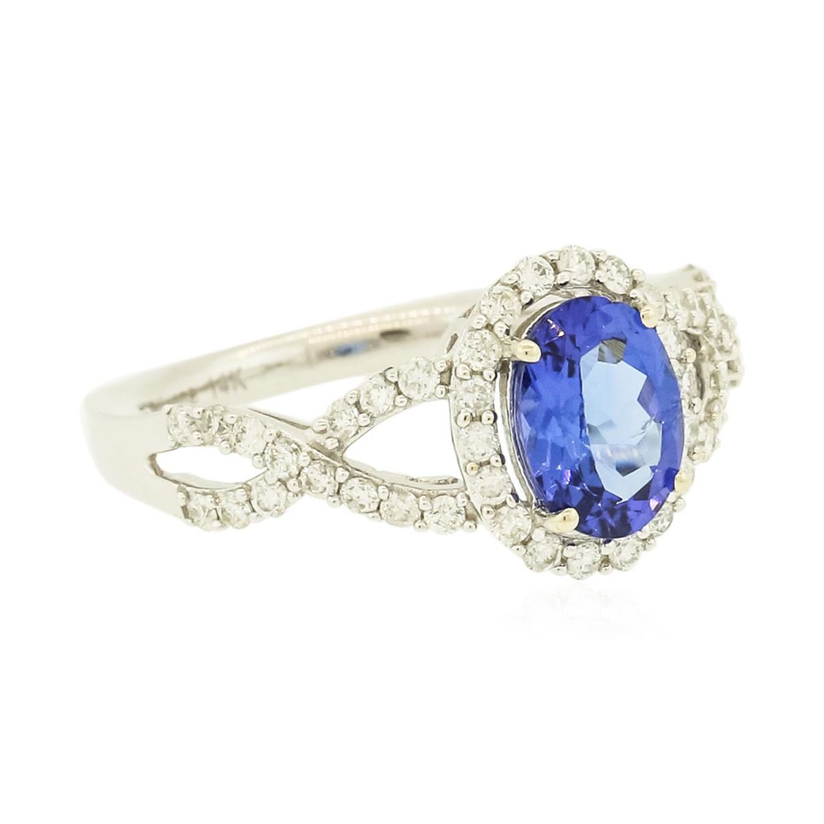 One electronically tested 14KT white gold ladies cast tanzanite and diamond ring with a bright polish finish. The featured tanzanite is set within a diamond bezel supported by intertwining diamond set shoulders, completed by a two millimeter wide band. Trademark is Orianne. Identified with markings of "14K". Condition is new, good workmanship. Containing: One prong set oval mixed cut natural tanzanite, measuring 8.10 x 6.10 x 3.65mm, 6% bulge factor, approximate weight of 1.31ct., clarity is eye clean, type I, medium dark, very slightly grayish, violetish blue color, (GIA vB 6/3), cut is good. Transmitting light with no distortion, transparent. Graded in the setting. Tanzanite is a very rare gemstone that is only found in the country of Tanzania. Originally discovered in 1967. Tiffany & Company, named the stone Tanzanite. It is found in the Usumburu Mountains that border the Umba Valley of northern Tanzania. Tanzanite occurs in gray, brown, violet, blue, reddish-purple, & green. The gem is interesting because of its exceptional pleochroism. Rotated in different directions a tanzanite will exhibit multiple changes of color. Tanzanite has a low tolerance to ultrasonic cleaning, and should not be cleaned using this method. Forty-Six prong set round brilliant cut diamonds, measuring 1.30 - 1.20 x 0.75mm (depth est.) approximate total weight of 46 Stones = 0.42ct. Graded in the setting. Clarity: I-1 to I-2. Color: G - I. Total Weight of Colored Stones 1.31ct. Total Weight of Diamonds 0.42ct. Total Weight of Ring 3.42 grams. AIG Appraised at $4,310.00.
