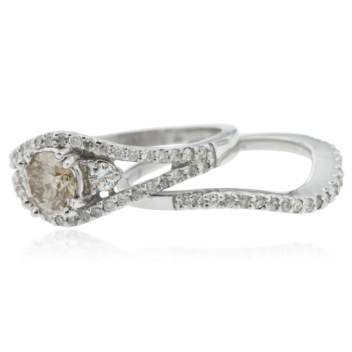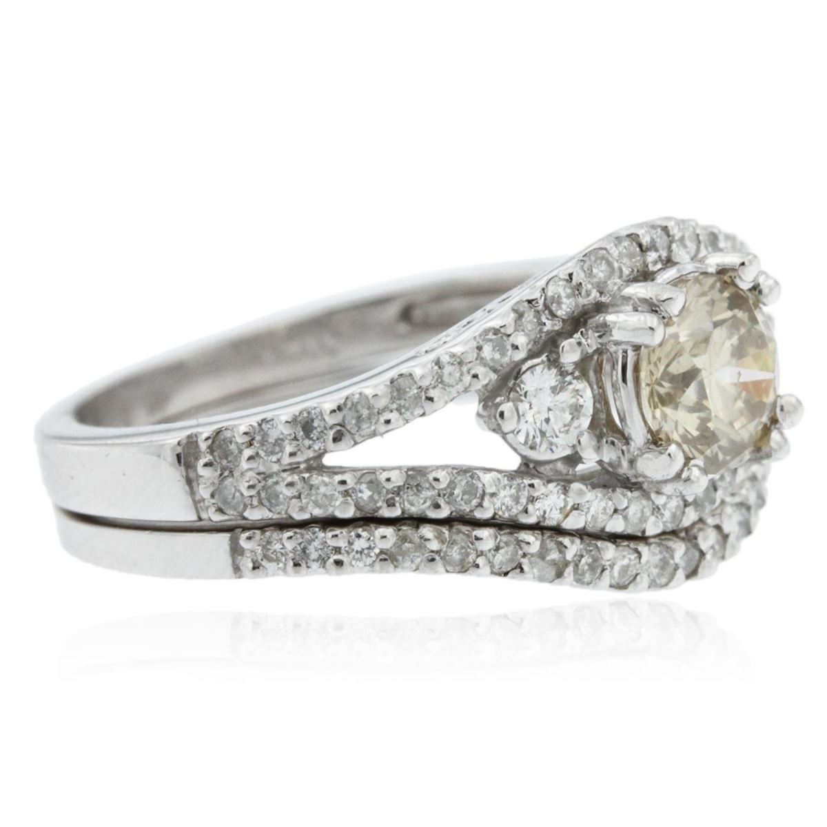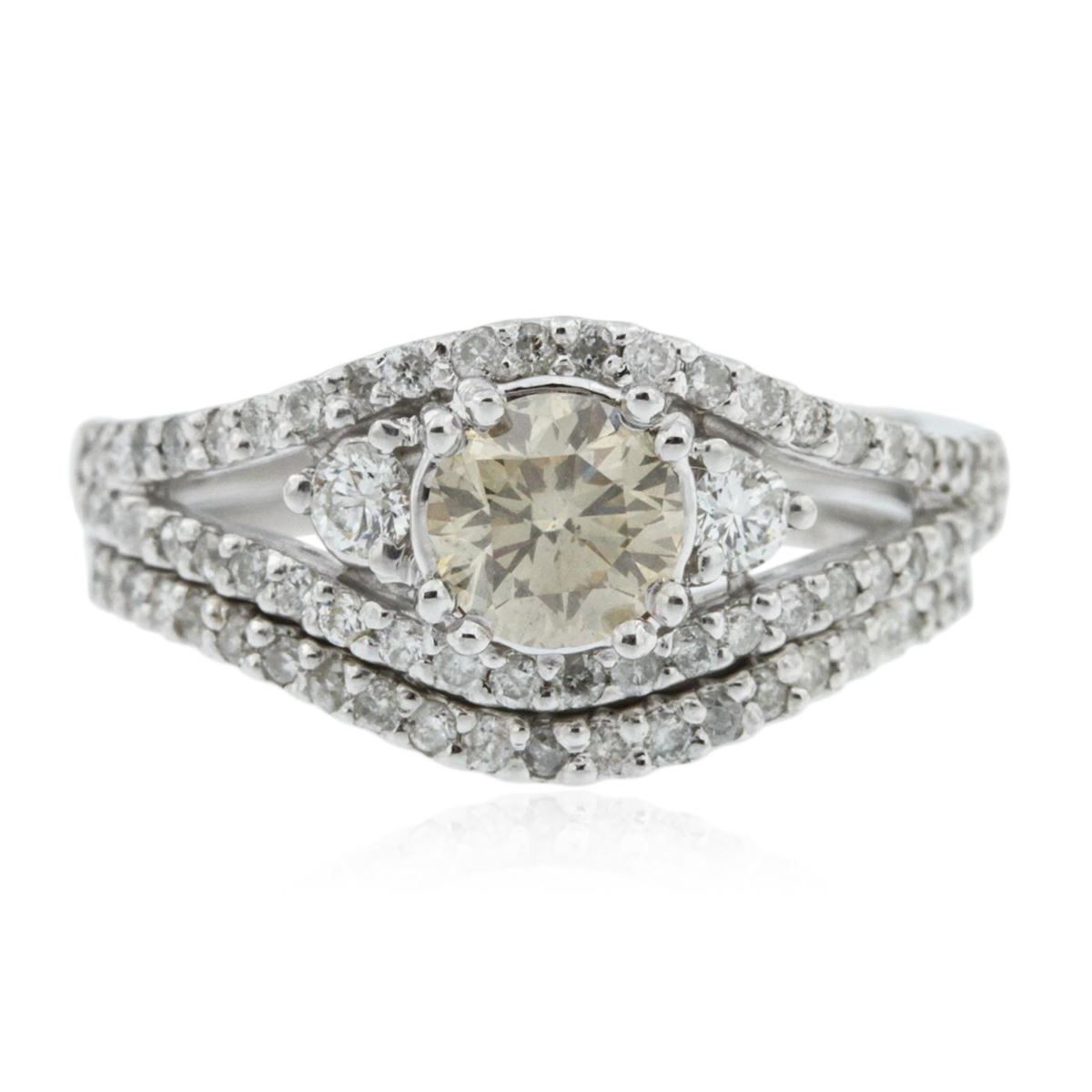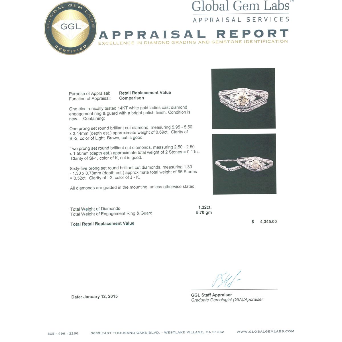 One electronically tested 14KT white gold ladies cast diamond engagement ring & guard with a bright polish finish. Condition is new. Containing: One prong set round brilliant cut diamond, measuring 5.95 - 5.50 x 3.44mm (depth est.) approximate weight of 0.69ct. Clarity: SI-2, Cut is Good. Two prong set round brilliant cut diamonds, measuring 2.50 - 2.50 x 1.50mm (depth est.) approximate total weight of 2 Stones = 0.11ct. Clarity: SI-1. Color: K, Cut is Good. Sixty-Five prong set round brilliant cut diamonds, measuring 1.30 - 1.30 x 0.78mm (depth est.) approximate total weight of 65 Stones = 0.52ct. Clarity: I-2. Color: J - K. All diamonds are graded in the mounting, unless otherwise stated. Total Weight of Diamonds 1.32ct. Total Weight of Engagement Ring & Guard 5.70 grams. GGL Appraised at $4,345.00.