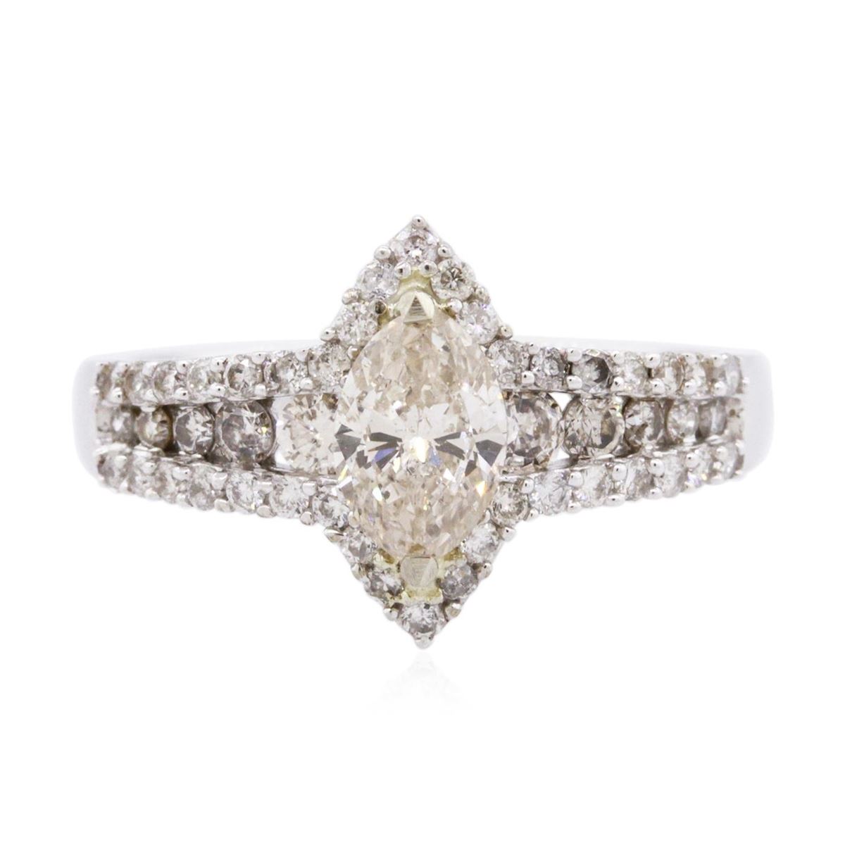 One electronically tested 14KT white gold ladies cast & assembled diamond unity ring with a bright polish finish. The featured diamond is set within mirroring diamond ribbons supported by diamond set shoulders, completed by a two millimeter wide band. Trademark is Orianne. Identified with markings of "14K". Condition is new, good workmanship. Containing: One prong set marquise shaped cut diamond, measuring 7.30 x 4.85 x 3.20mm (depth est.), 5.00.%. GTCF approximate weight of 0.79ct with a faint blue fluorescence. Graded in the setting. Clarity: I-1. Depth: 66.0%. Table 63.9%. Forty-Eight prong set round brilliant cut diamonds (depth est.) approximate total weight of 48 Stones = 0.53ct. Faint brown secondary color throughout. Graded in the setting. Clarity: SI-1 to I-1. Color: H - J. Total Weight of Diamonds 1.32ct. Total Weight of Unity Ring 2.78 grams. AIG Appraised at $5,080.00.