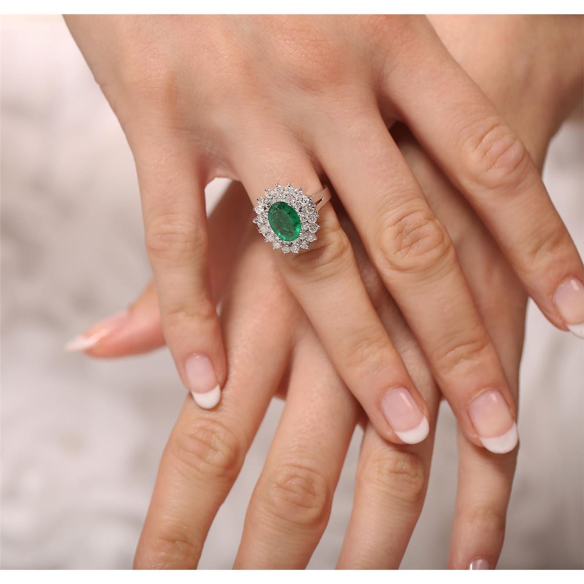 One electronically tested 14KT white gold ladies cast emerald and diamond ring with a bright polish finish. Condition is new, good workmanship. The featured emerald is set within a diamond bezel, supported by split shoulders and completed by a two and one-half millimeter wide band. Identified with markings of "14K". Containing: One prong set oval mixed cut natural emerald, measuring 9.70 x 6.90 x 3.10mm, approximate weight of 1.32ct., clarity is heavily included, type III, medium dark, moderately strong, very slightly bluish green color, (GIA vslbG 6/4), cut is good. Transmitting light with a minimum of distortion, transparent to translucent. Naturally occurring internal & external characteristics are present. Indications of oil residue. Graded in the setting. Thirty-two prong set round brilliant cut diamonds, measuring 2.20 - 1.90 x 1.23mm (depth est.) approximate total weight of 32 Stones = 1.10ct. Graded in the setting. Clarity I-1 to I-2. Color F - H. Total Weight of Colored Stones 1.32ct. Total Weight of Diamonds 1.10ct. Total Weight of Ring 5.30gm. AIG Appraised at $5,370.00.