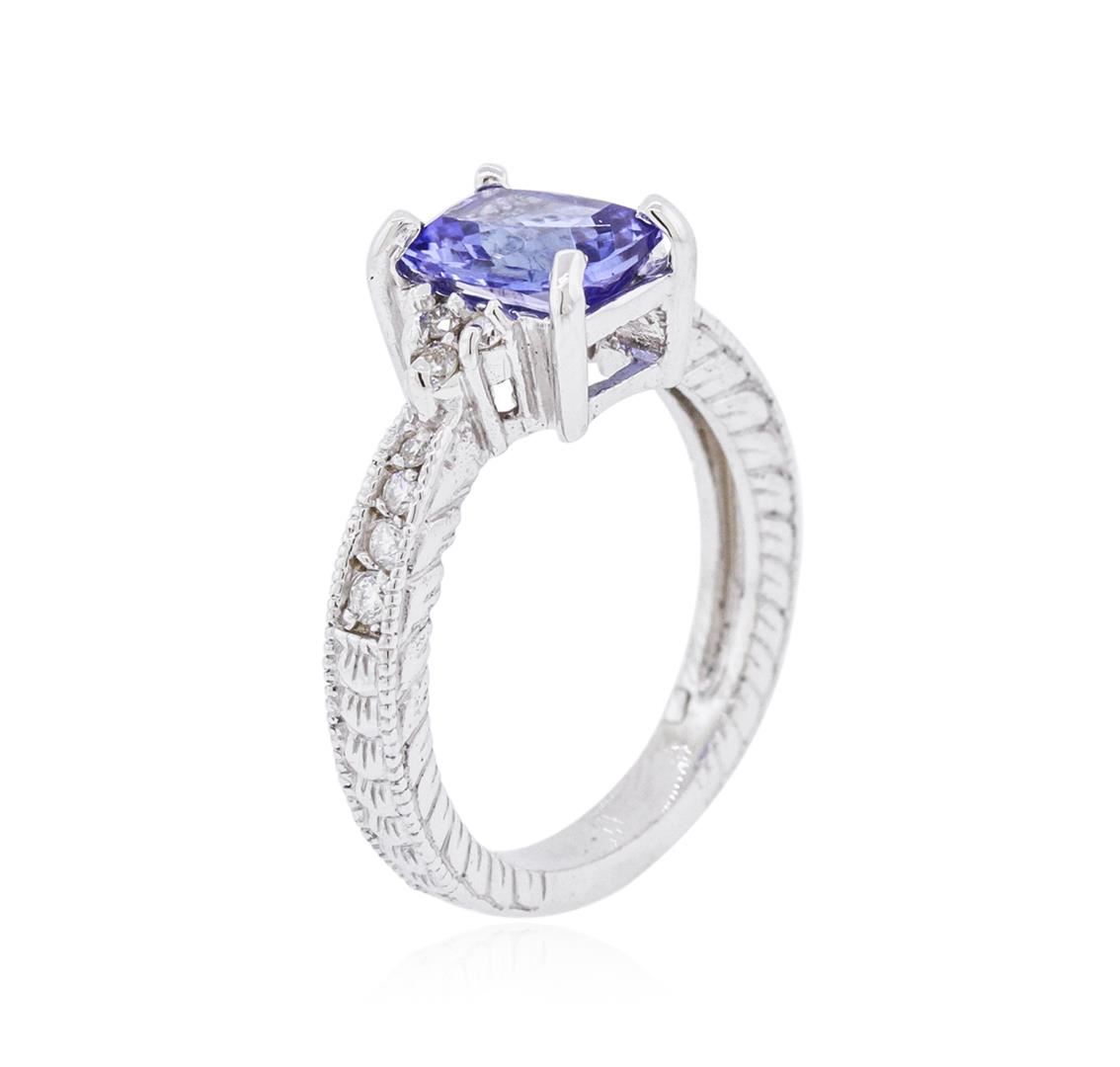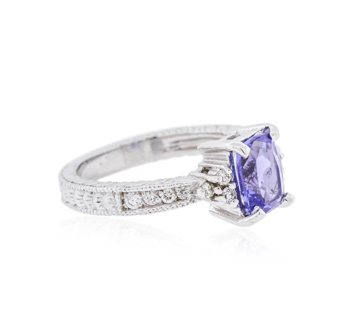 One electronically tested 14KT white gold ladies cast tanzanite and diamond ring with a bright polish finish. Condition is new. Containing: One prong set oval modified brilliant cut natural tanzanite, measuring 8.00 x 6.00 x 3.90mm, approximate weight of 1.32ct., clarity is eye clean, type I, medium light, very slightly grayish, violet color, (GIA V 4/3), cut is good. Fourteen prong set round brilliant cut diamonds, measuring 1.70 - 1.10 x 0.84mm (depth est.) approximate total weight of 14 Stones = 0.14ct. Clarity: SI-1 to I-1. Color: I - J, Cut is Good. Colored gemstones are presumed to have been subjected to commonly used enhancement processes. All diamonds and colored gemstones are graded in the mounting, unless otherwise stated. Total Weight of Colored Stones 1.32ct. Total Weight of Diamonds 0.14ct. Total Weight of Ring 5.10 grams. GGL Appraised at $2,800.00.