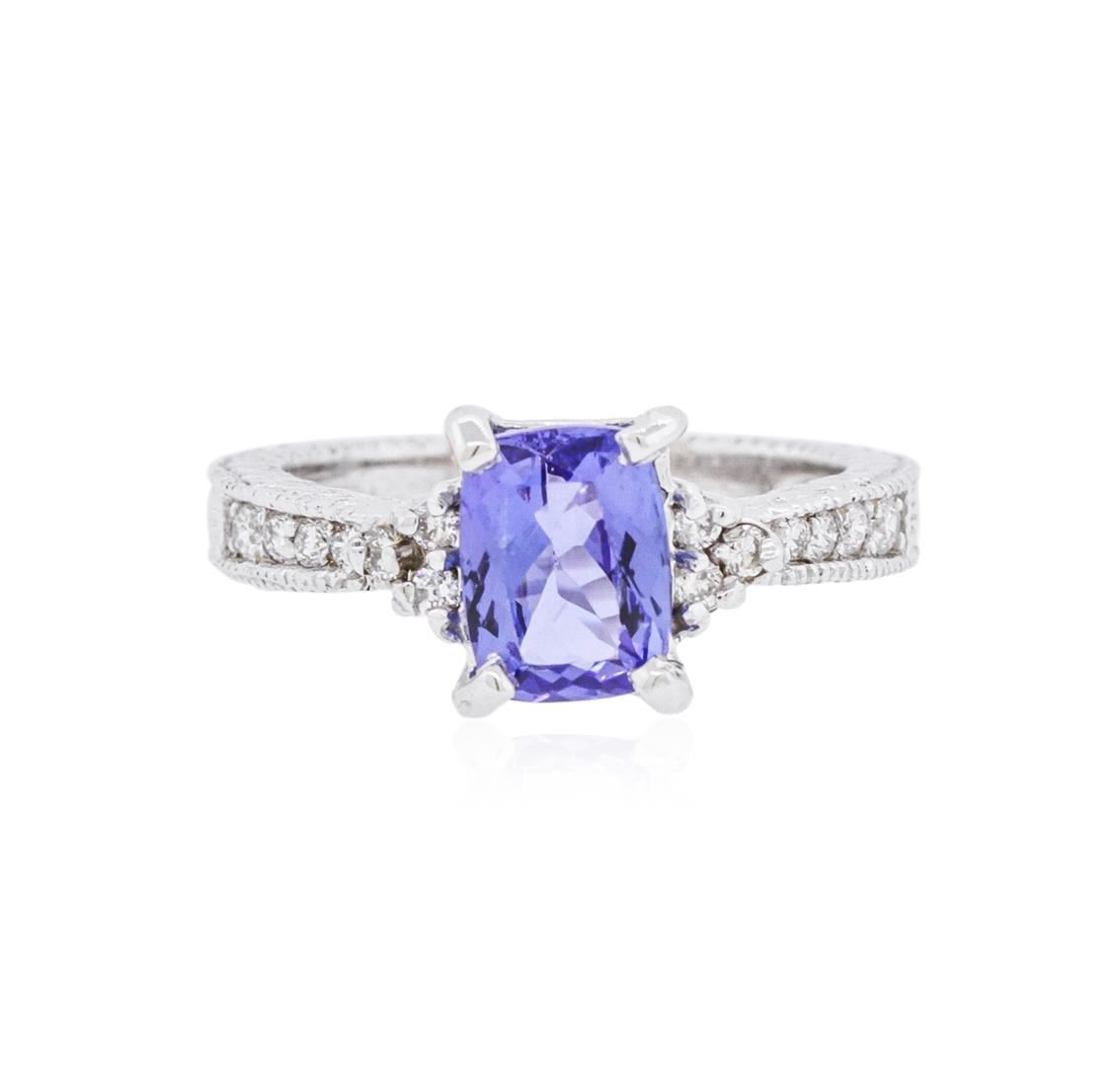 One electronically tested 14KT white gold ladies cast tanzanite and diamond ring with a bright polish finish. Condition is new. Containing: One prong set oval modified brilliant cut natural tanzanite, measuring 8.00 x 6.00 x 3.90mm, approximate weight of 1.32ct., clarity is eye clean, type I, medium light, very slightly grayish, violet color, (GIA V 4/3), cut is good. Fourteen prong set round brilliant cut diamonds, measuring 1.70 - 1.10 x 0.84mm (depth est.) approximate total weight of 14 Stones = 0.14ct. Clarity: SI-1 to I-1. Color: I - J, Cut is Good. Colored gemstones are presumed to have been subjected to commonly used enhancement processes. All diamonds and colored gemstones are graded in the mounting, unless otherwise stated. Total Weight of Colored Stones 1.32ct. Total Weight of Diamonds 0.14ct. Total Weight of Ring 5.10 grams. GGL Appraised at $2,800.00.