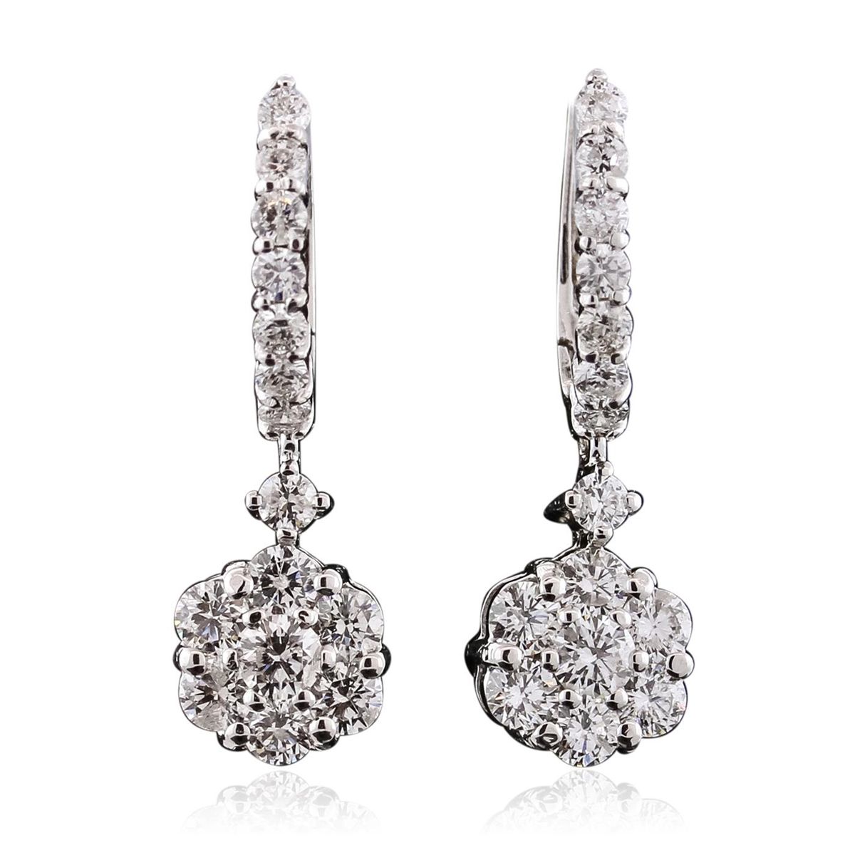 One pair electronically tested 14KT white gold ladies combination cast & assembled diamond dangle earrings with hinged clip backs with a bright polish finish. Identified with markings of "14K". Condition is new. Containing: Twelve prong set round brilliant cut diamonds, measuring 2.60 - 2.60 x 1.56mm (depth est.) approximate total weight of 12 Stones = 0.77ct. Clarity: SI-2. Color: G, Cut is Good. Two prong set round brilliant cut diamonds, measuring 3.00 - 3.00 x 1.80mm (depth est.) approximate total weight of 2 Stones = 0.20ct. Clarity: SI-1. Color: G, Cut is Very Good. Fourteen prong set round brilliant cut diamonds, measuring 1.90 - 1.90 x 1.14mm (depth est.) approximate total weight of 14 Stones = 0.35ct. Clarity: I-1 to I-2. Color: H - I, Cut is Good. All diamonds are graded in the mounting, unless otherwise stated. Total Weight of Diamonds 1.32ct. Total Weight of Earrings 4.20 grams. GGL Appraised at $5,315.00.