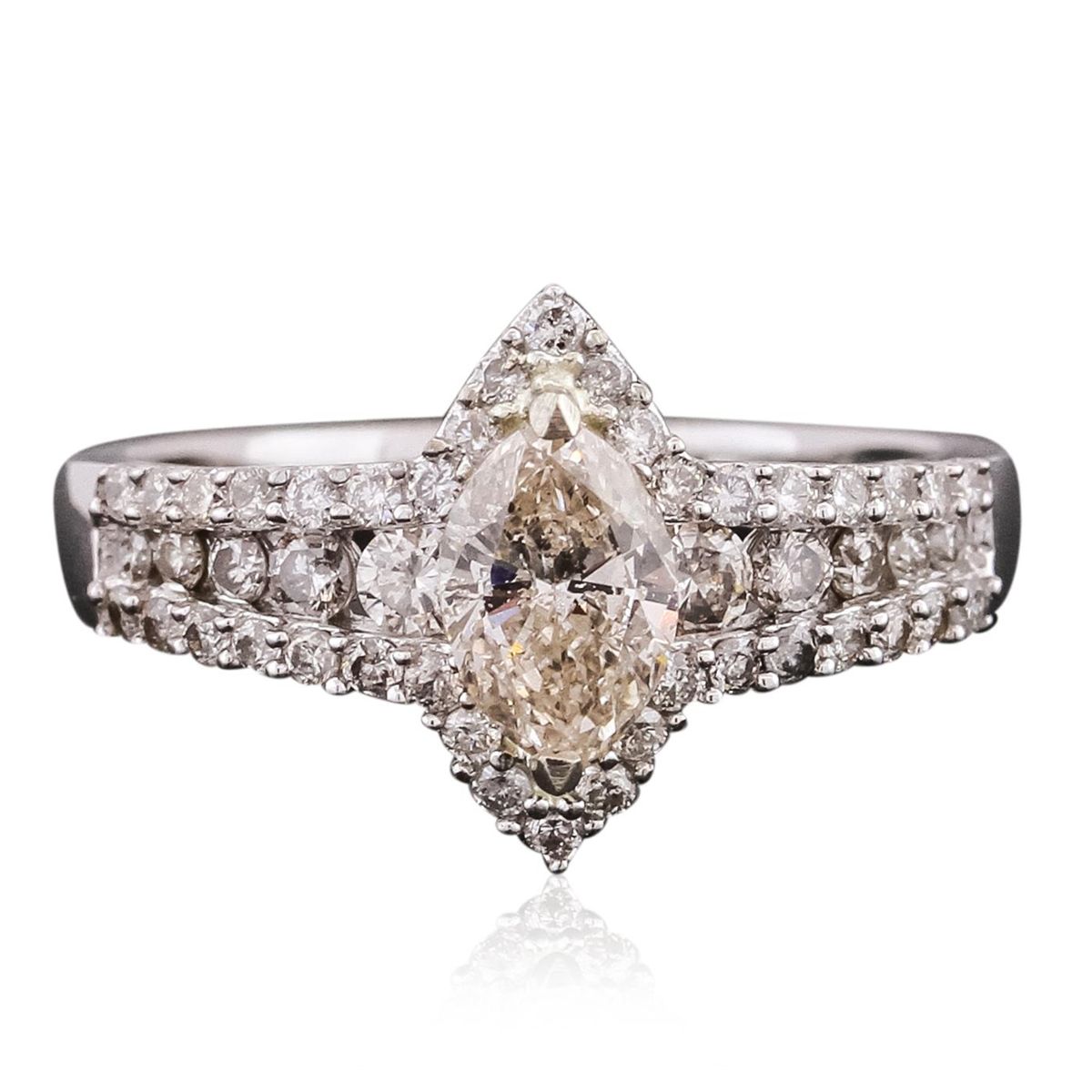 One electronically tested 14KT white gold ladies cast & assembled diamond unity ring with a bright polish finish. The featured diamond is set within mirroring diamond ribbons supported by diamond set shoulders, completed by a two millimeter wide band. Trademark is Orianne. Identified with markings of "14K". Condition is new, good workmanship. Containing: One prong set marquise shaped cut diamond, measuring 7.30 x 4.85 x 3.20mm (depth est.), 5.00.%. GTCF approximate weight of 0.79ct with a faint blue fluorescence. Graded in the setting. Clarity: I-1. Depth: 66.0%. Table 63.9%. Forty-Eight prong set round brilliant cut diamonds (depth est.) approximate total weight of 48 Stones = 0.53ct. Faint brown secondary color throughout. Graded in the setting. Clarity: SI-1 to I-1. Color: H - J. Total Weight of Diamonds 1.32ct. Total Weight of Unity Ring 2.78 grams. AIG Appraised at $5,080.00.