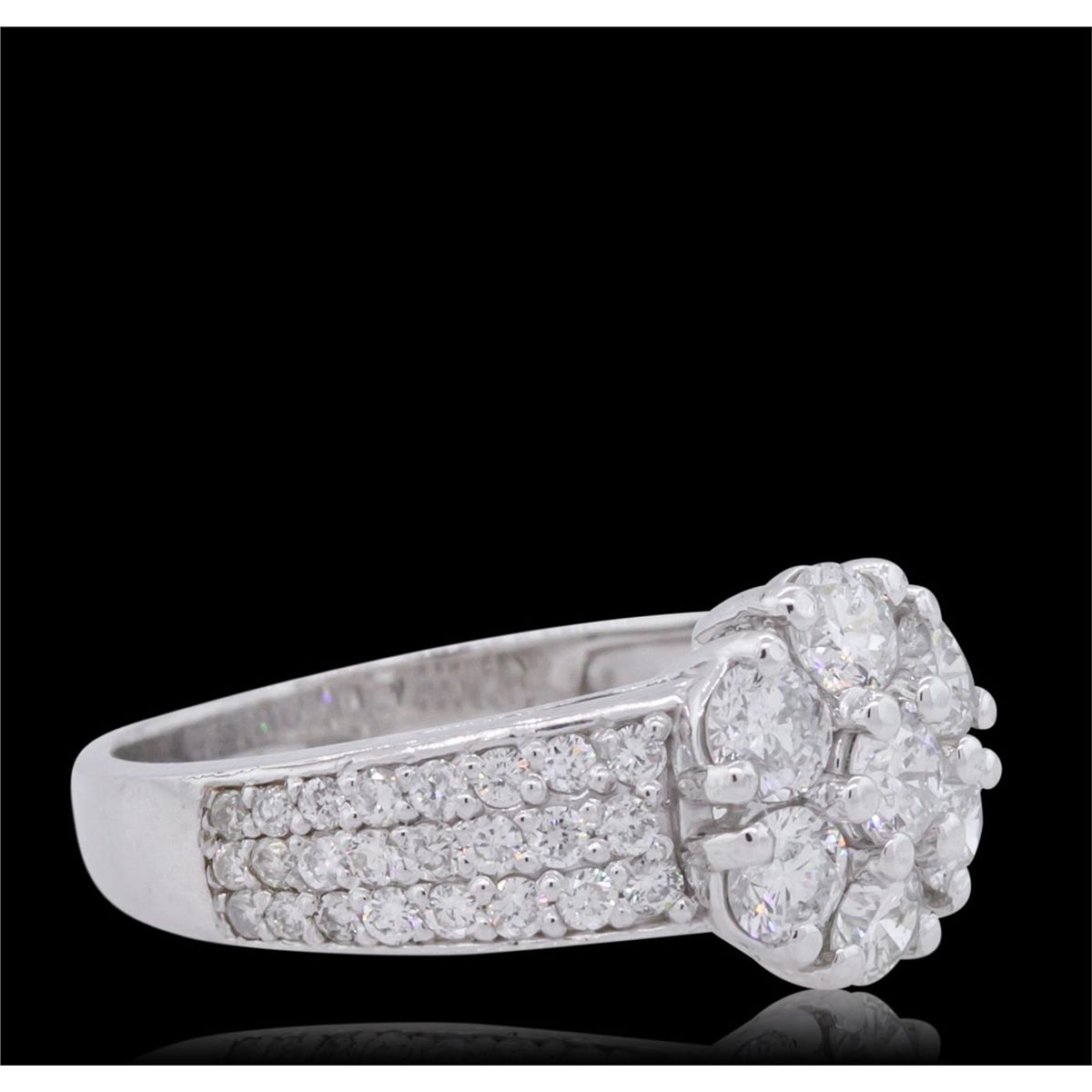 One electronically tested 14KT white gold ladies combination cast & assembled diamond ring with a flat shank with a bright polish finish. Identified with markings of "K14". Condition is new. Containing: Seven prong set round brilliant cut diamonds, measuring 3.20 - 3.20 x 1.92mm (depth est.) approximate total weight of 7 Stones = 0.84ct. Clarity: SI-2. Color: I - J, Cut is Good. Forty-Eight prong set round brilliant cut diamonds, measuring 1.40 - 1.40 x 0.84mm (depth est.) approximate total weight of 48 Stones = 0.48ct. Clarity: SI-2 to I-2. Color: H - I, Cut is Good. All diamonds are graded in the mounting, unless otherwise stated. Total Weight of Diamonds 1.32ct. Total Weight of Ring 4.00 grams. GGL Appraised at $4,645.00.
