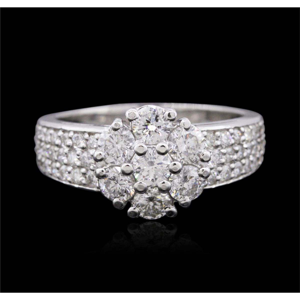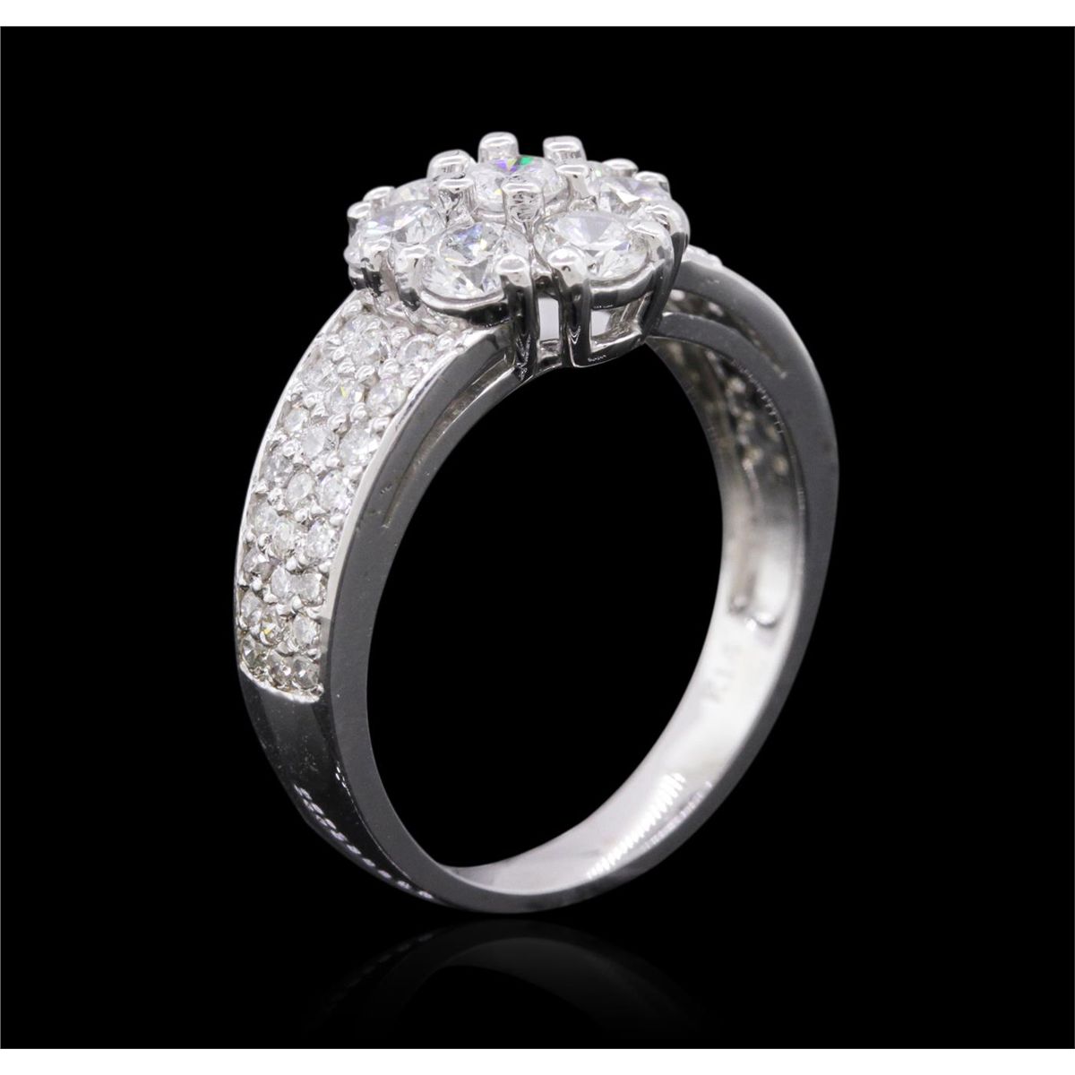 One electronically tested 14KT white gold ladies combination cast & assembled diamond ring with a flat shank with a bright polish finish. Identified with markings of "K14". Condition is new. Containing: Seven prong set round brilliant cut diamonds, measuring 3.20 - 3.20 x 1.92mm (depth est.) approximate total weight of 7 Stones = 0.84ct. Clarity: SI-2. Color: I - J, Cut is Good. Forty-Eight prong set round brilliant cut diamonds, measuring 1.40 - 1.40 x 0.84mm (depth est.) approximate total weight of 48 Stones = 0.48ct. Clarity: SI-2 to I-2. Color: H - I, Cut is Good. All diamonds are graded in the mounting, unless otherwise stated. Total Weight of Diamonds 1.32ct. Total Weight of Ring 4.00 grams. GGL Appraised at $4,645.00.