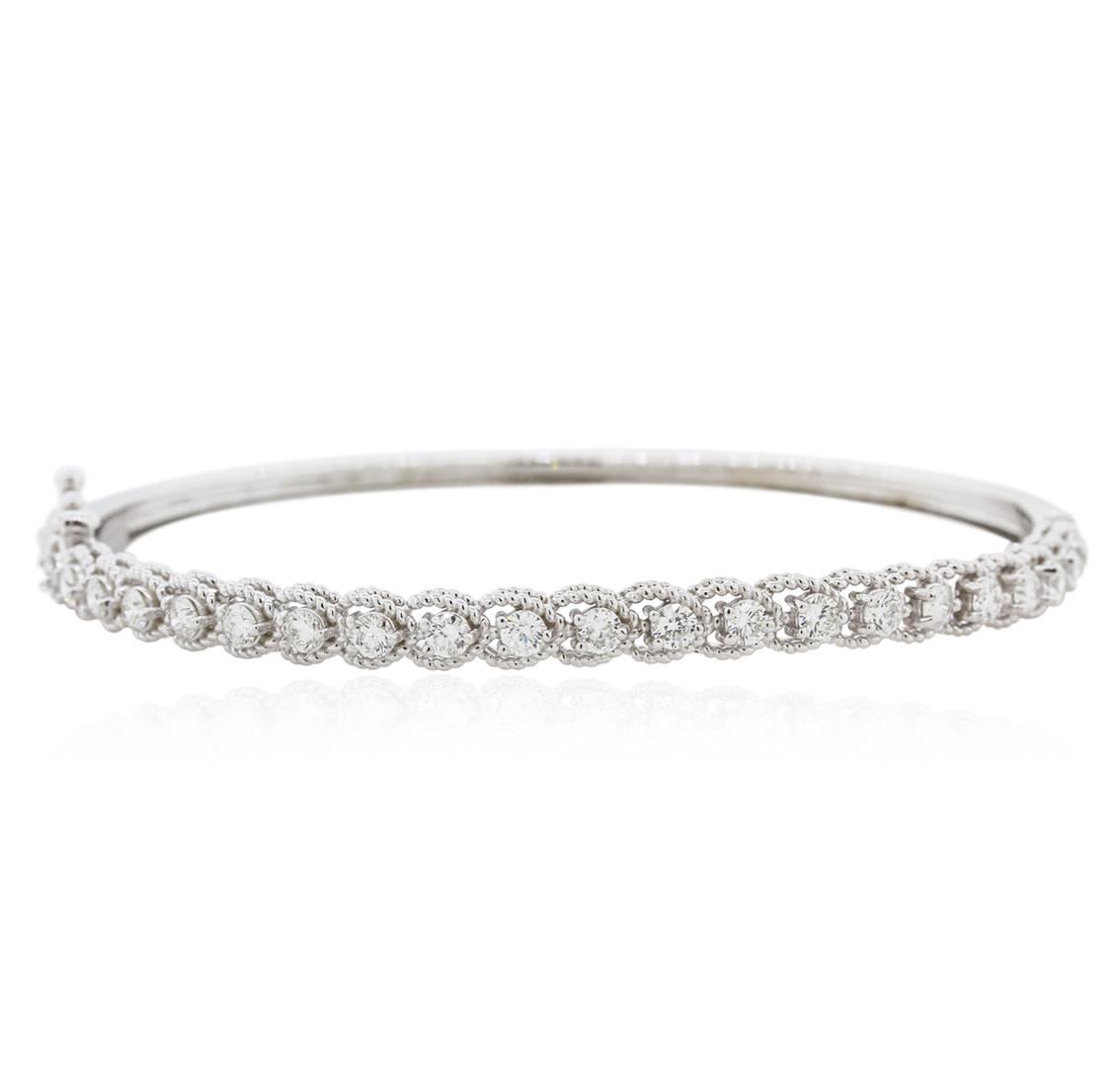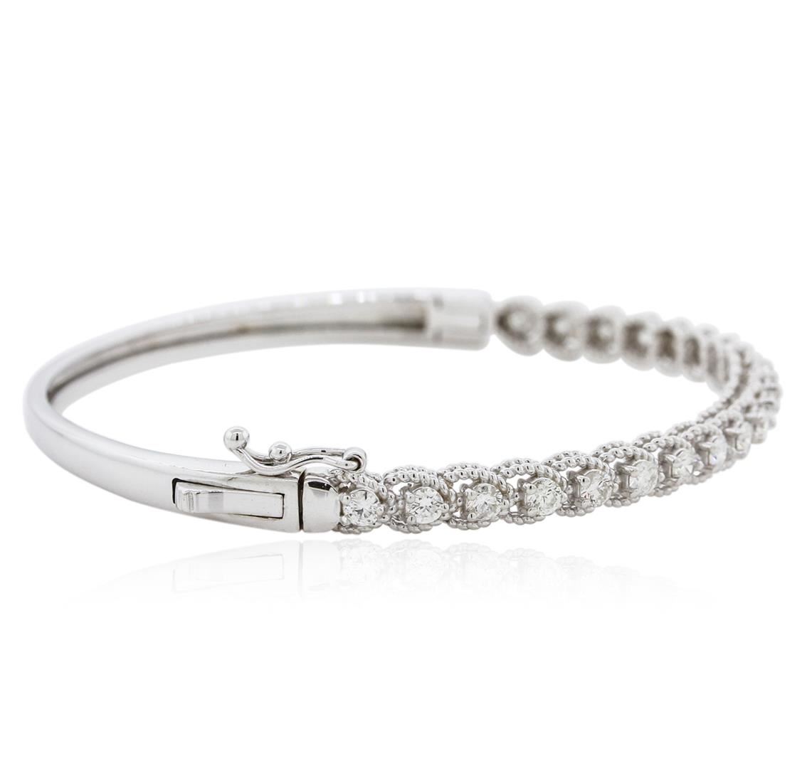One electronically tested 14KT white gold ladies cast diamond bangle bracelet with a hidden box clasp with safety closer with a bright polish finish. Identified with markings of "14K". Condition is new. Containing: Twenty-One prong set round brilliant cut diamonds, measuring 2.50 - 2.50 x 1.50mm (depth est.) approximate total weight of 21 Stones = 1.33ct. Clarity: SI-1 to SI-2. Color: G - H, Cut is Good. All diamonds are graded in the mounting, unless otherwise stated. Total Weight of Diamonds 1.33ct. Total Weight of Bangle Bracelet 10.40 grams. GGL Appraised at $4,785.00.