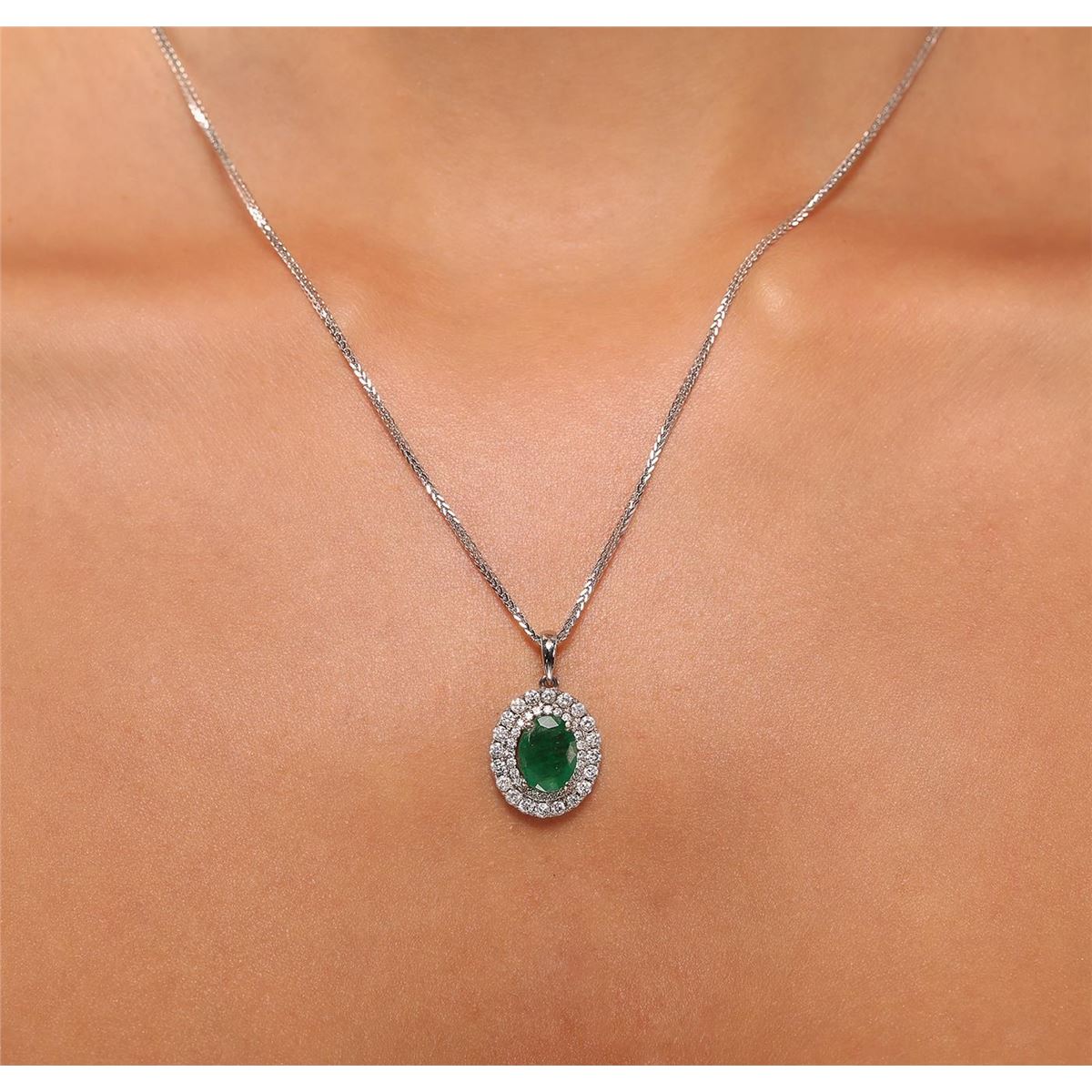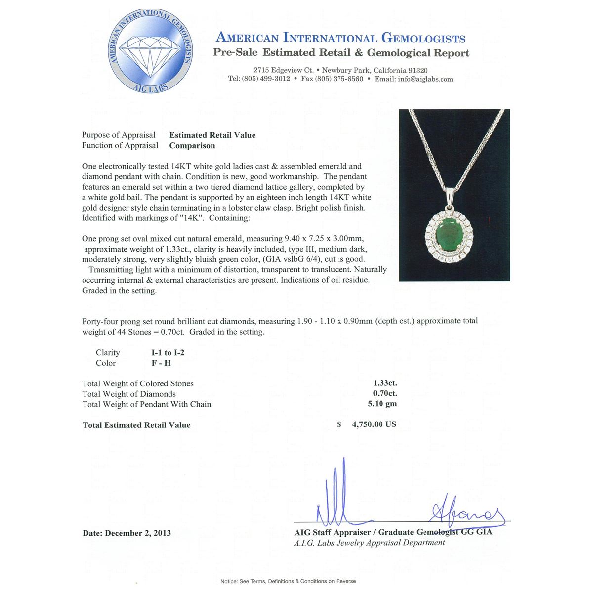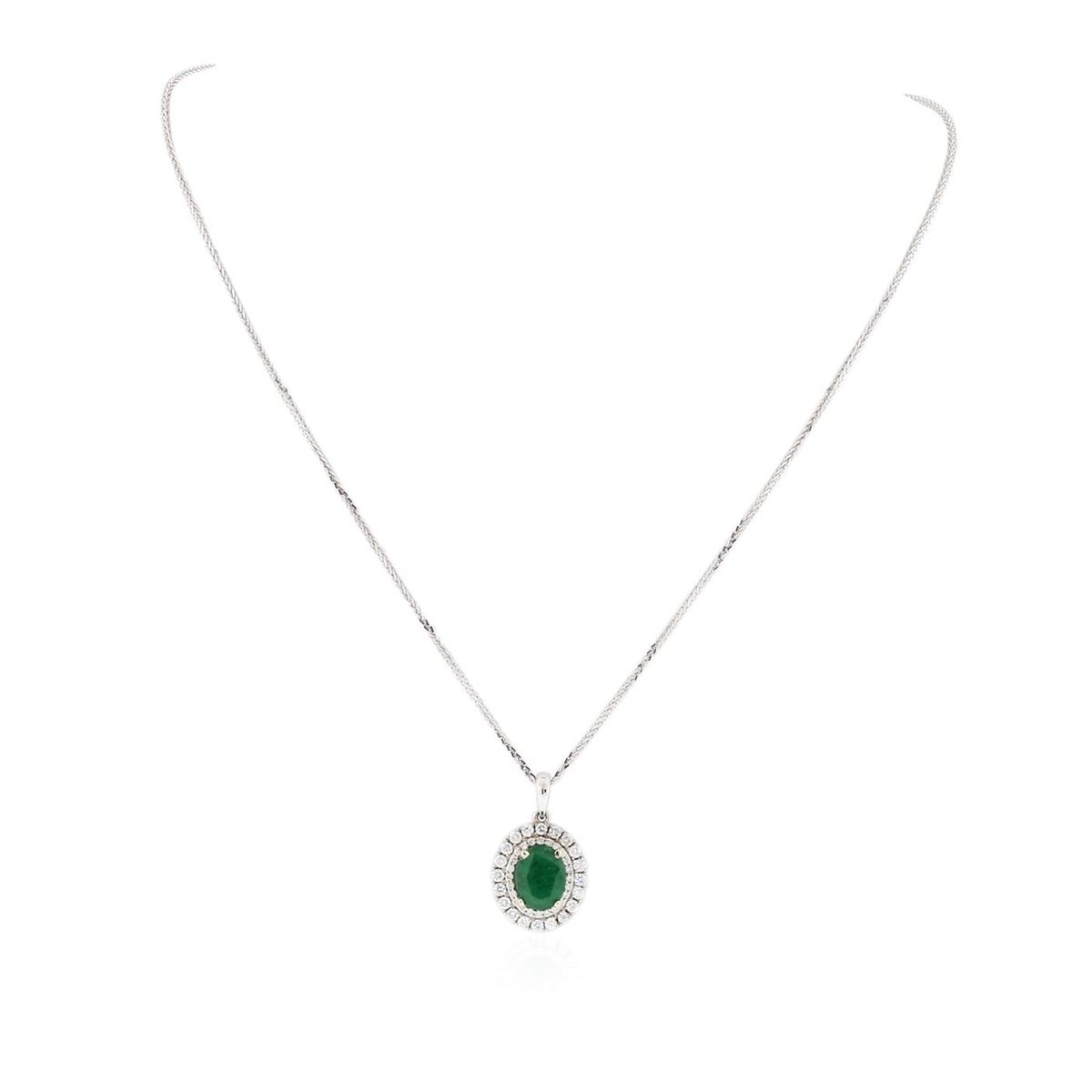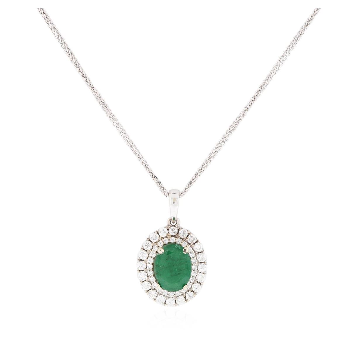 One electronically tested 14KT white gold ladies cast & assembled emerald and diamond pendant with chain. Condition is new, good workmanship. The pendant features an emerald set within a two tiered diamond lattice gallery, completed by a white gold bail. The pendant is supported by an eighteen inch length 14KT white gold designer style chain terminating in a lobster claw clasp. Bright polish finish. Identified with markings of "14K". Containing: One prong set oval mixed cut natural emerald, measuring 9.40 x 7.25 x 3.00mm, approximate weight of 1.33ct., clarity is heavily included, type III, medium dark, moderately strong, very slightly bluish green color, (GIA vslbG 6/4), cut is good. Transmitting light with a minimum of distortion, transparent to translucent. Naturally occurring internal & external characteristics are present. Indications of oil residue. Graded in the setting. Forty-four prong set round brilliant cut diamonds, measuring 1.90 - 1.10 x 0.90mm (depth est.) approximate total weight of 44 Stones = 0.70ct. Graded in the setting. Clarity I-1 to 1-2. Color F - H. Total Weight of Colored Stones 1.33ct. Total Weight of Diamonds 0.70ct. Total Weight of Pendant With Chain 5.10gm. AIG Appraised at $4,750.00.