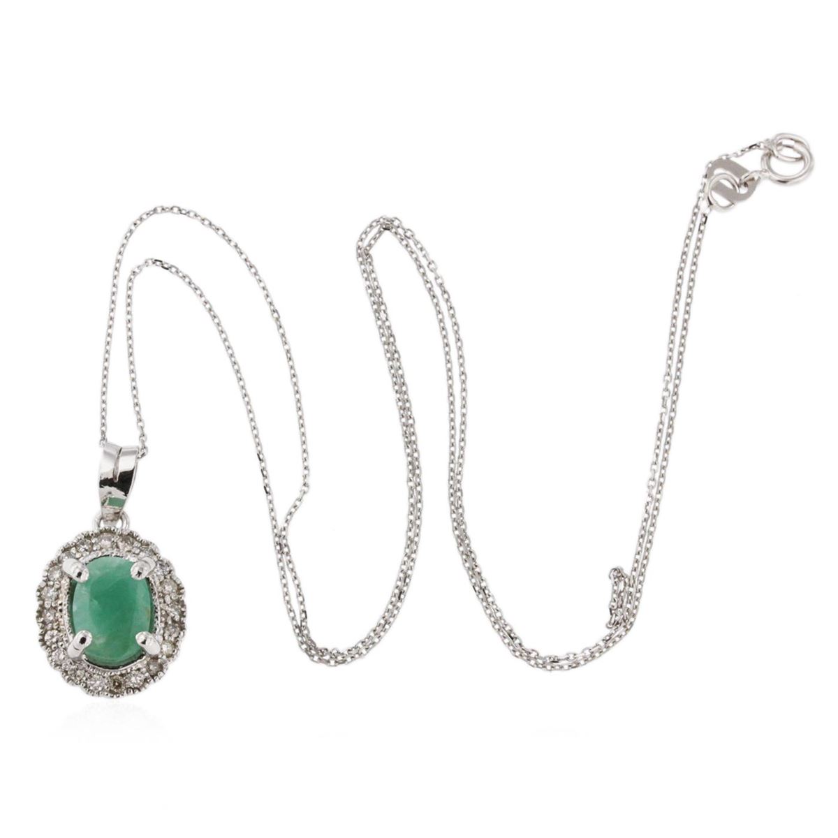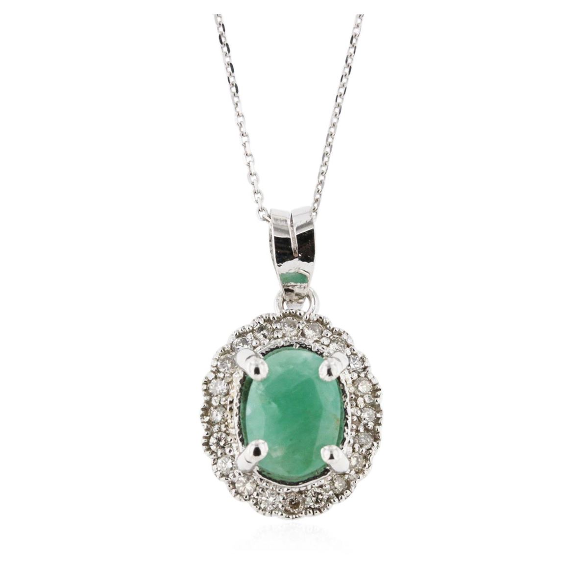 One electronically tested 14KT white gold ladies cast emerald and diamond pendant & chain 16.0" long, cable link with a spring ring clasp with a bright polish finish. Identified with markings of "14K". Condition is new. Containing: One prong set oval modified brilliant cut natural emerald, measuring 7.94 x 6.00 x 4.89mm, approximate weight of 1.33ct., clarity is heavily included, type III, medium, very slightly grayish, green color, (GIA G 5/3), cut is good. Twenty prong set round brilliant cut diamonds, measuring 1.30 - 1.30 x 0.78mm (depth est.) approximate total weight of 20 Stones = 0.16ct. Clarity: SI-1 to SI-2. Color: K - L. Colored gemstones are presumed to have been subjected to commonly used enhancement processes, All diamonds and colored gemstones are graded in the mounting, unless otherwise stated. Total Weight of Colored Stones 1.33ct. Total Weight of Diamonds 0.16ct. Total Weight of Pendant & Chain 3.30 grams. GGL Appraised at $1,890.00.