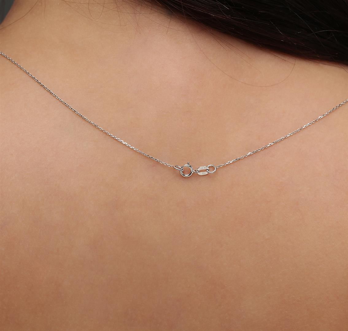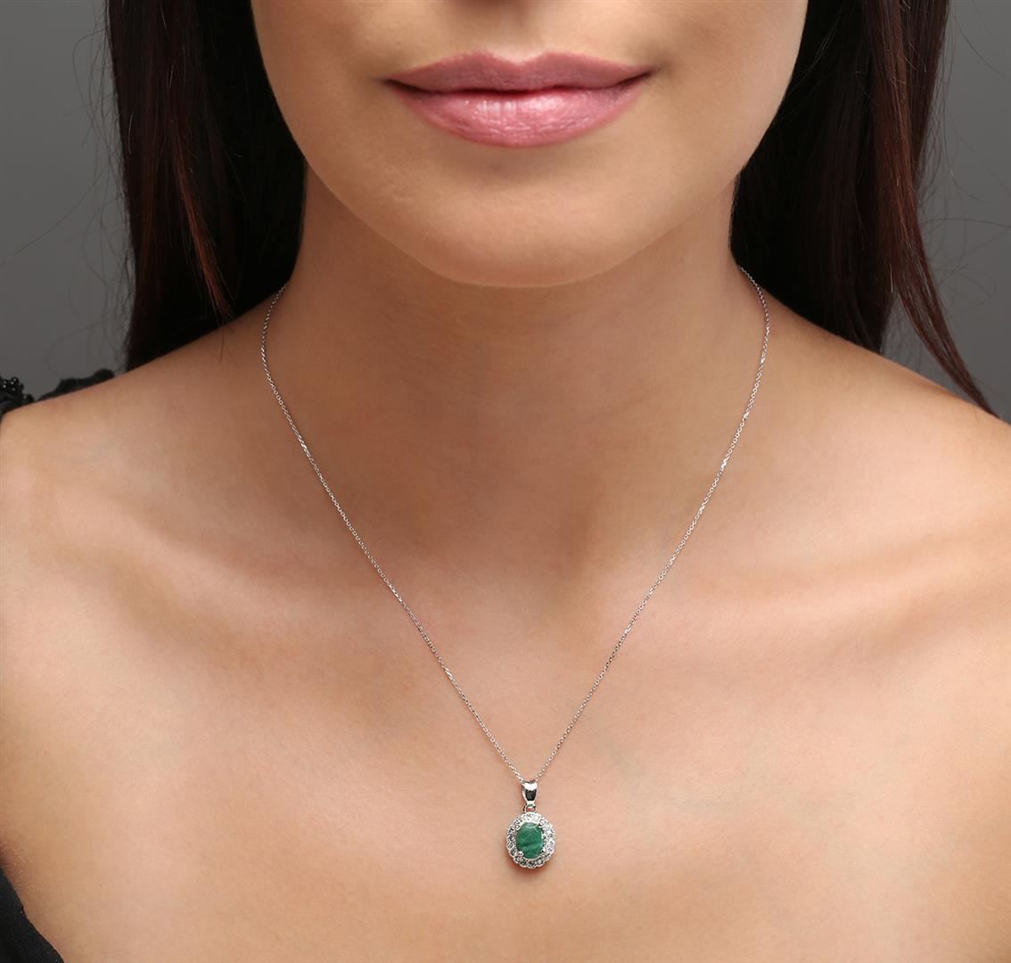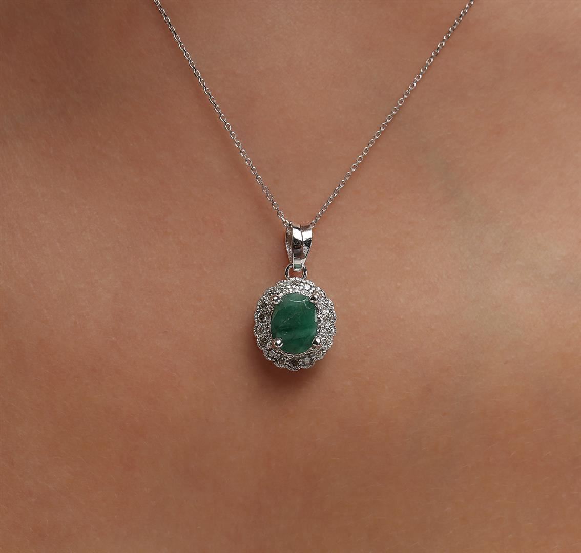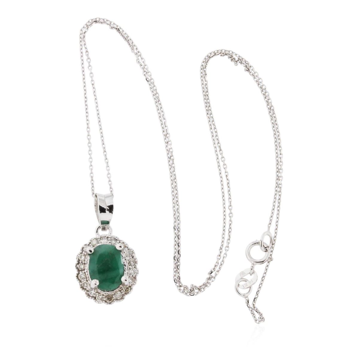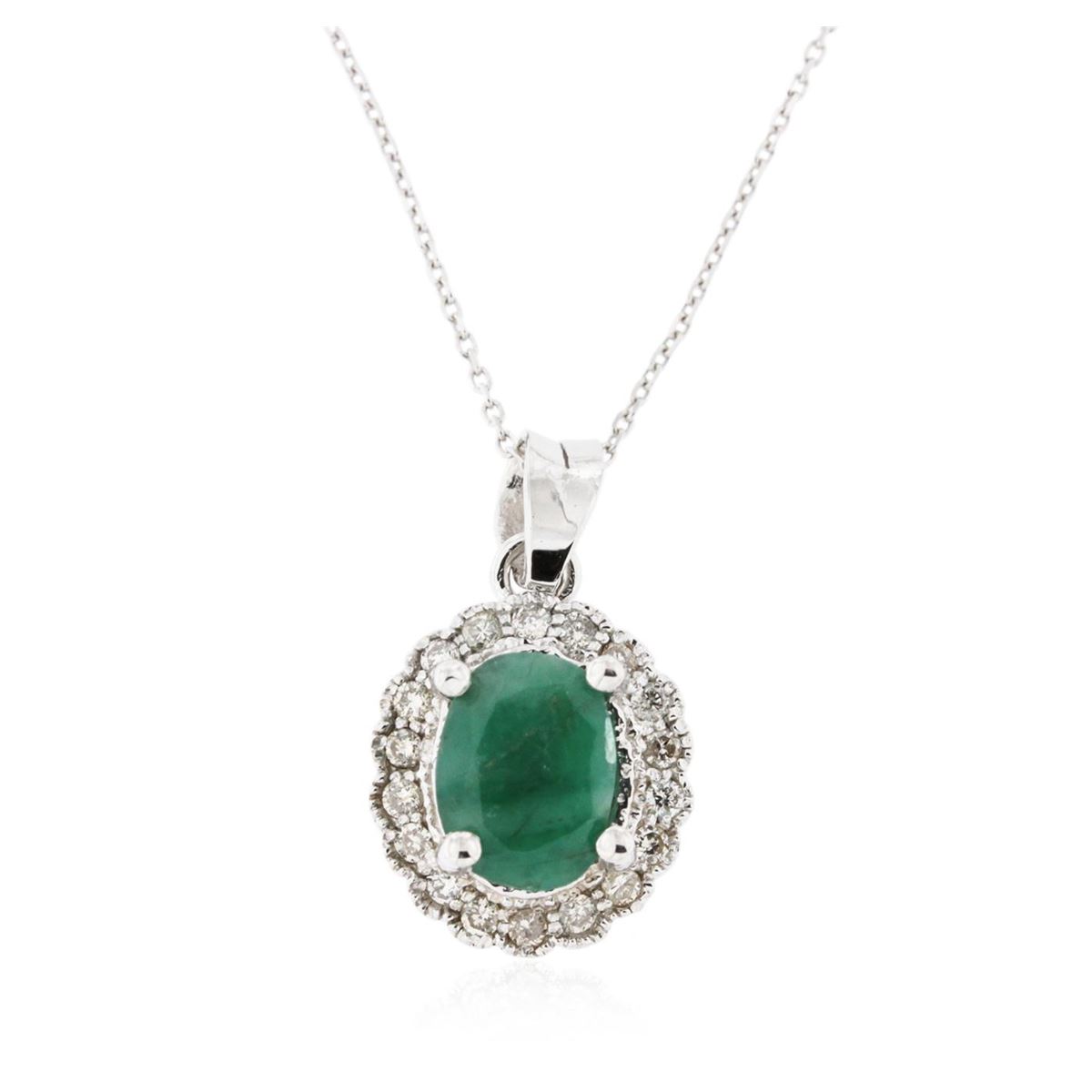 One electronically tested 14KT white gold ladies cast emerald and diamond pendant & chain 16.0" long, cable link with a spring ring clasp with a bright polish finish. Identified with markings of "14K". Condition is new. Containing: One prong set oval modified brilliant cut natural emerald, measuring 7.94 x 6.00 x 4.89mm, approximate weight of 1.33ct., clarity is heavily included, type III, medium, very slightly grayish, green color, (GIA G 5/3), cut is good. Eighteen prong set round brilliant cut diamonds, measuring 1.30 - 1.30 x 0.78mm (depth est.) approximate total weight of 18 Stones = 0.14ct. Clarity: SI-1 to SI-2. Color: K - L. Colored gemstones are presumed to have been subjected to commonly used enhancement processes, All diamonds and colored gemstones are graded in the mounting, unless otherwise stated. Total Weight of Colored Stones 1.33ct. Total Weight of Diamonds 0.14ct. Total Weight of Pendant & Chain 2.80 grams. GGL Appraised at $1,710.00.