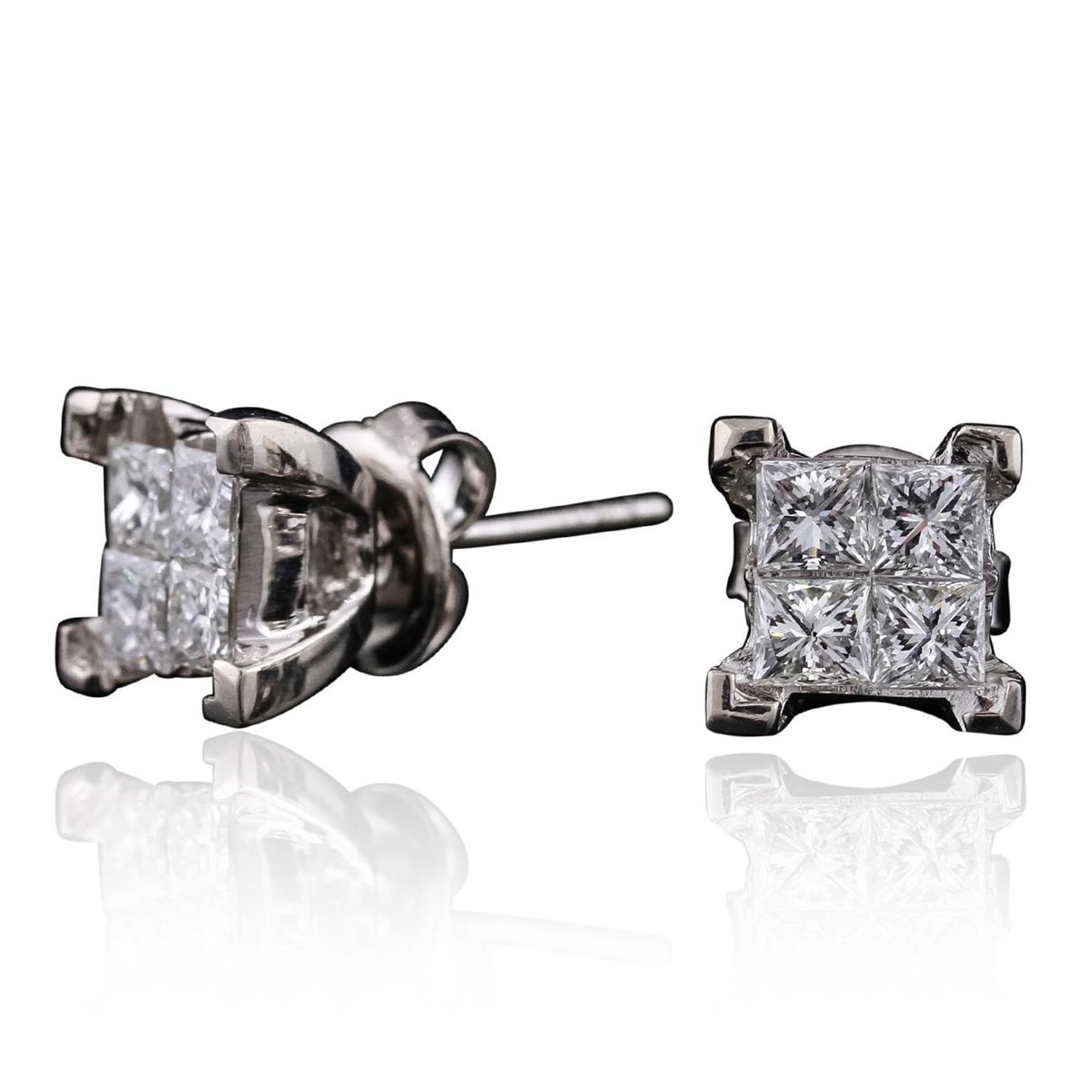One pair electronically tested 14KT white gold ladies combination cast & assembled stud earrings with friction posts with a bright polish finish. Condition is new. Containing: Eight invisible set princess cut diamonds, measuring 3.00 x 3.00 x 2.25mm (depth est.) approximate. Total Weight of 8 Stones = 1.33ct. Clarity: SI-1 to SI-2. Color: I - J, Cut is Good. All diamonds are graded in the mounting, unless otherwise stated. Total Weight of Diamonds 1.33ct. Total Weight of Earrings 4.30 grams. GGL Appraised at $4,315.00.