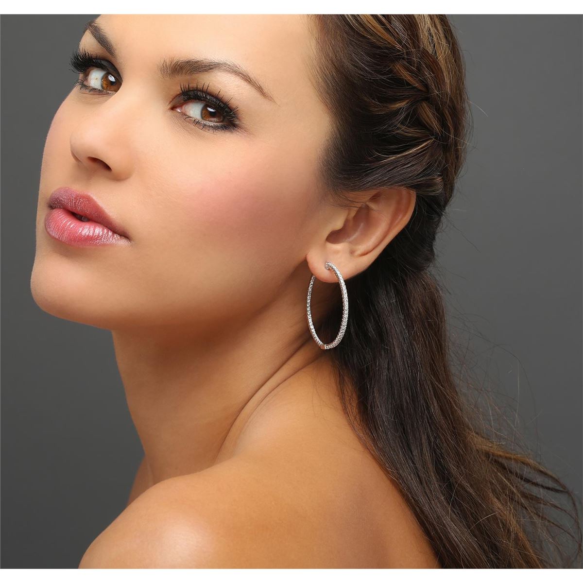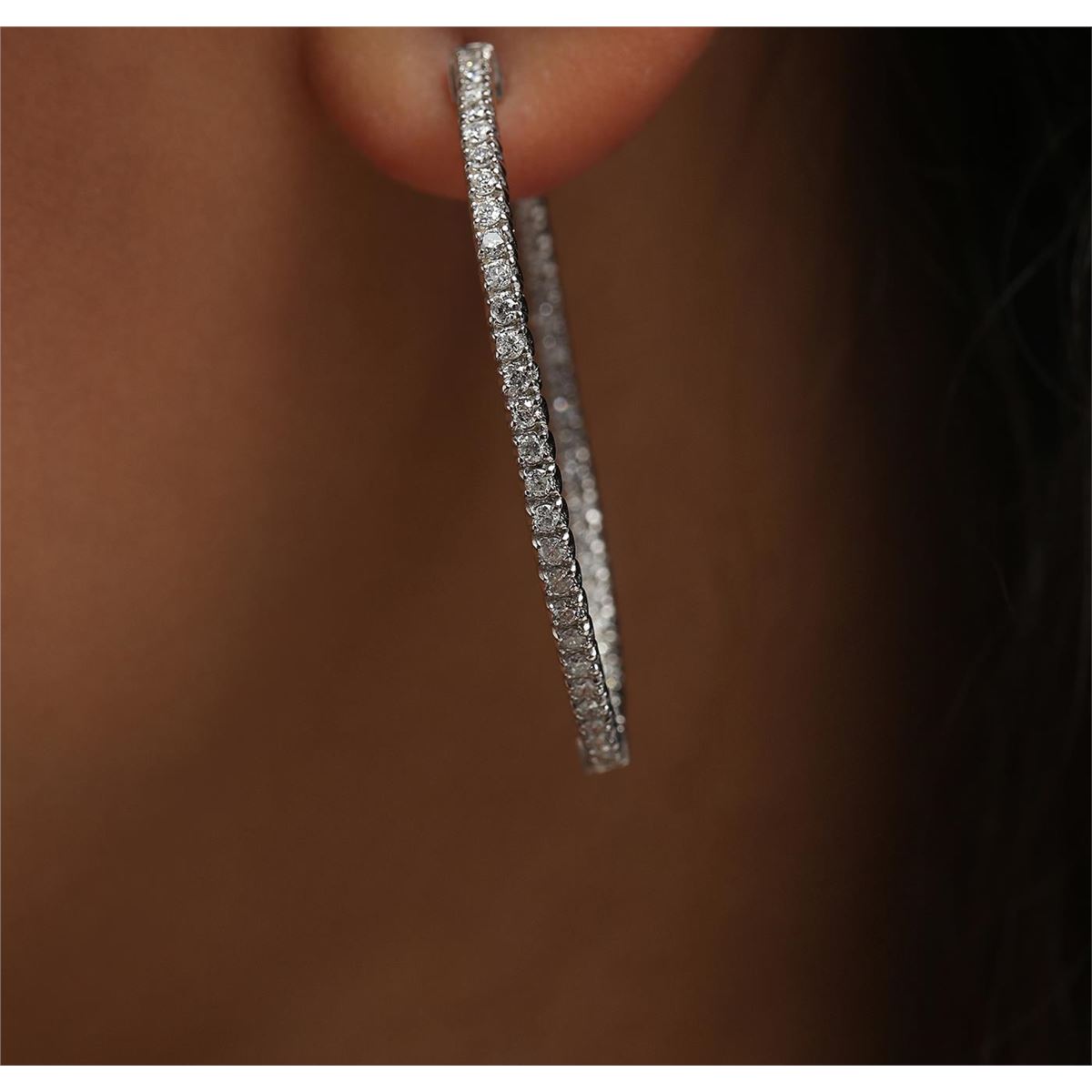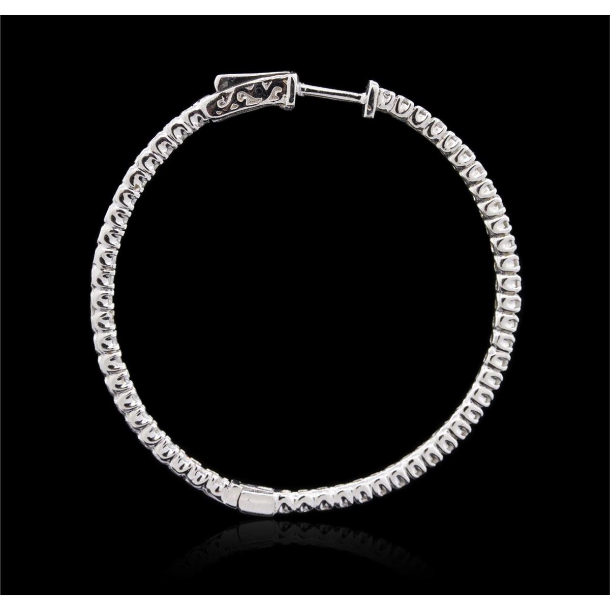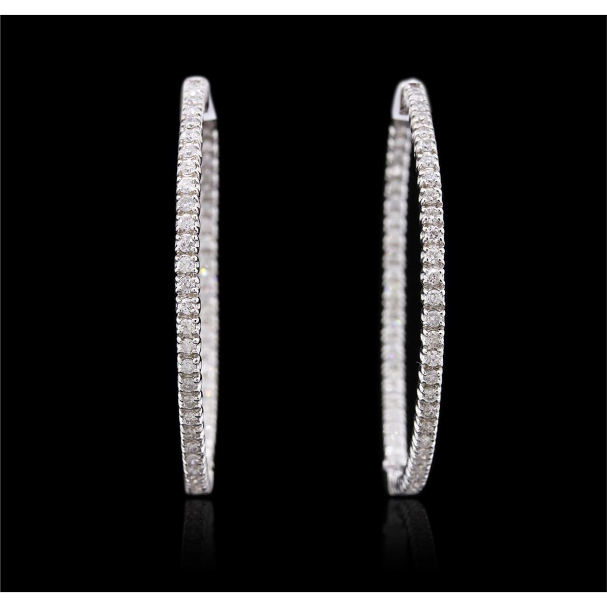 One pair electronically tested 14KT white gold ladies combination cast & assembled hoop earrings with hinged clip backs with a bright polish finish. Identified with markings of "14K". Condition is new. Containing: One Hundred Eight prong set round brilliant cut diamonds, measuring 1.50 - 1.50 x 0.90mm (depth est.) approximate total weight of 108 Stones = 1.33ct. Clarity: I-1 to I-2. Color: I - K, Cut is Good. All diamonds are graded in the mounting, unless otherwise stated. Total Weight of Diamonds 1.33ct. Total Weight of Earrings 9.40 grams. GGL Appraised at $3,935.00.