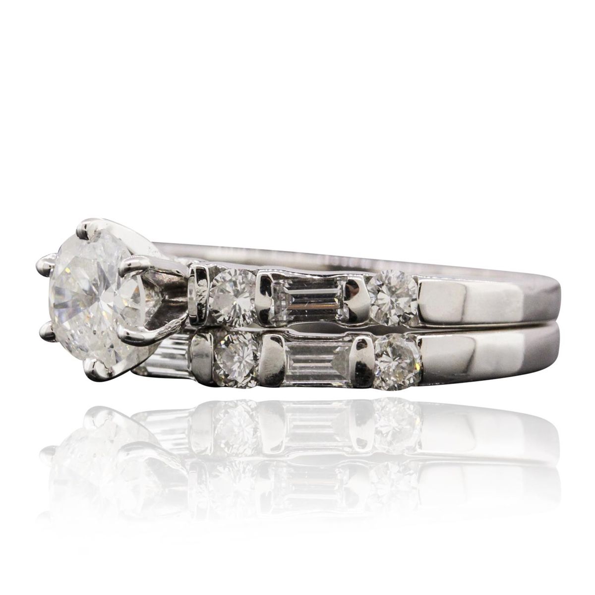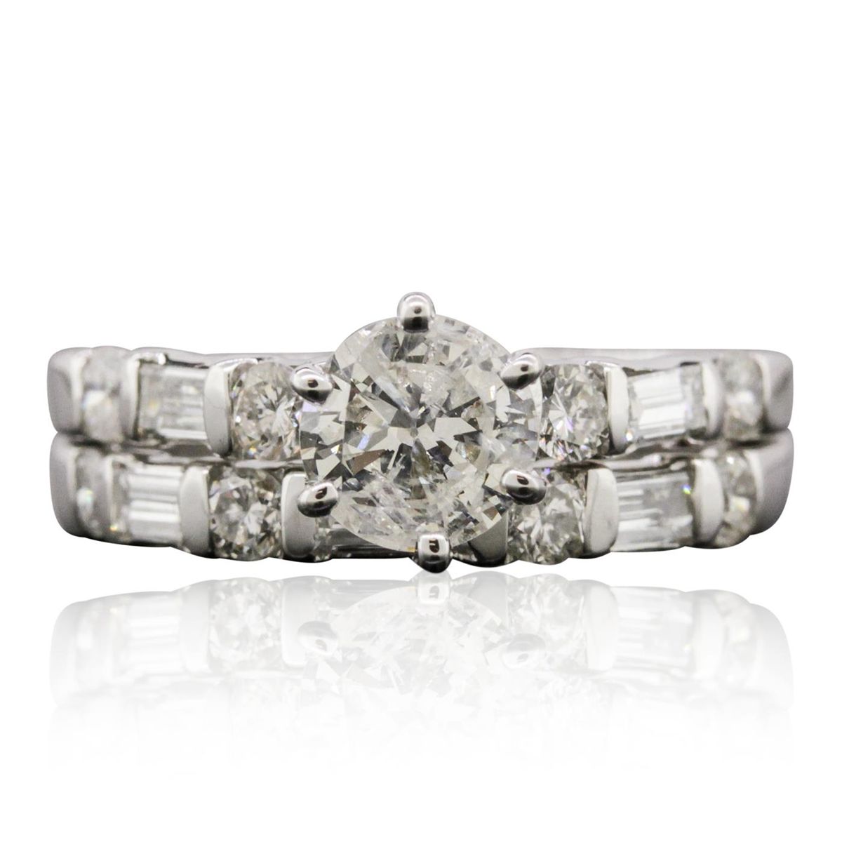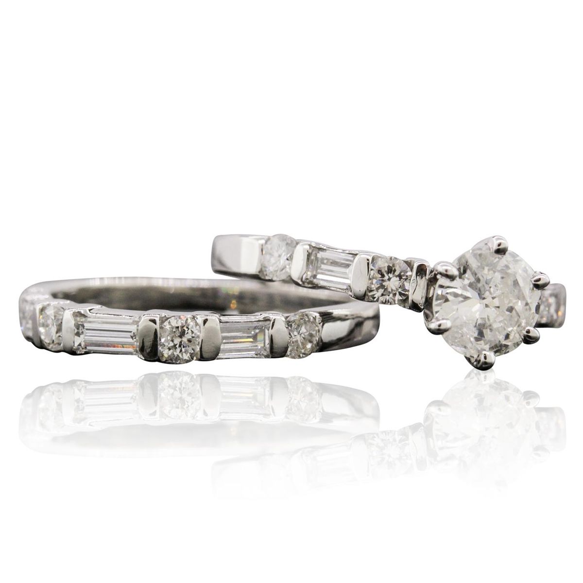 One electronically tested 14KT white gold Ladies combination cast & assembled engagement ring & wedding band with a bright polish finish. Condition is very good. Identified with markings of "14K". Containing: One prong set round brilliant cut diamond, measuring 5.90 - 5.90 x 3.54mm (depth est.) approximate weight of 0.75ct. Clarity: I-2. Color: J, Cut is Good. Eight prong set round brilliant cut diamonds, measuring 2.40 - 2.40 x 1.44mm (depth est.) approximate. Total Weight of 8 Stones = 0.41ct. Clarity: SI-2. Color: I, Cut is Good. Five prong set baguette cut diamonds, measuring 2.00 x 1.50 x 1.28mm (depth est.) approximate. Total Weight of 5 Stones = 0.18ct. Clarity: VS-2 to SI-1. Color: H - I, Cut is Good. All diamonds are graded in the mounting, unless otherwise stated. Total Weight of Diamonds 1.33ct. Total Weight of Engagement Ring & Wedding Band 4.40 grams.. GGL Appraised at $6,145.00.