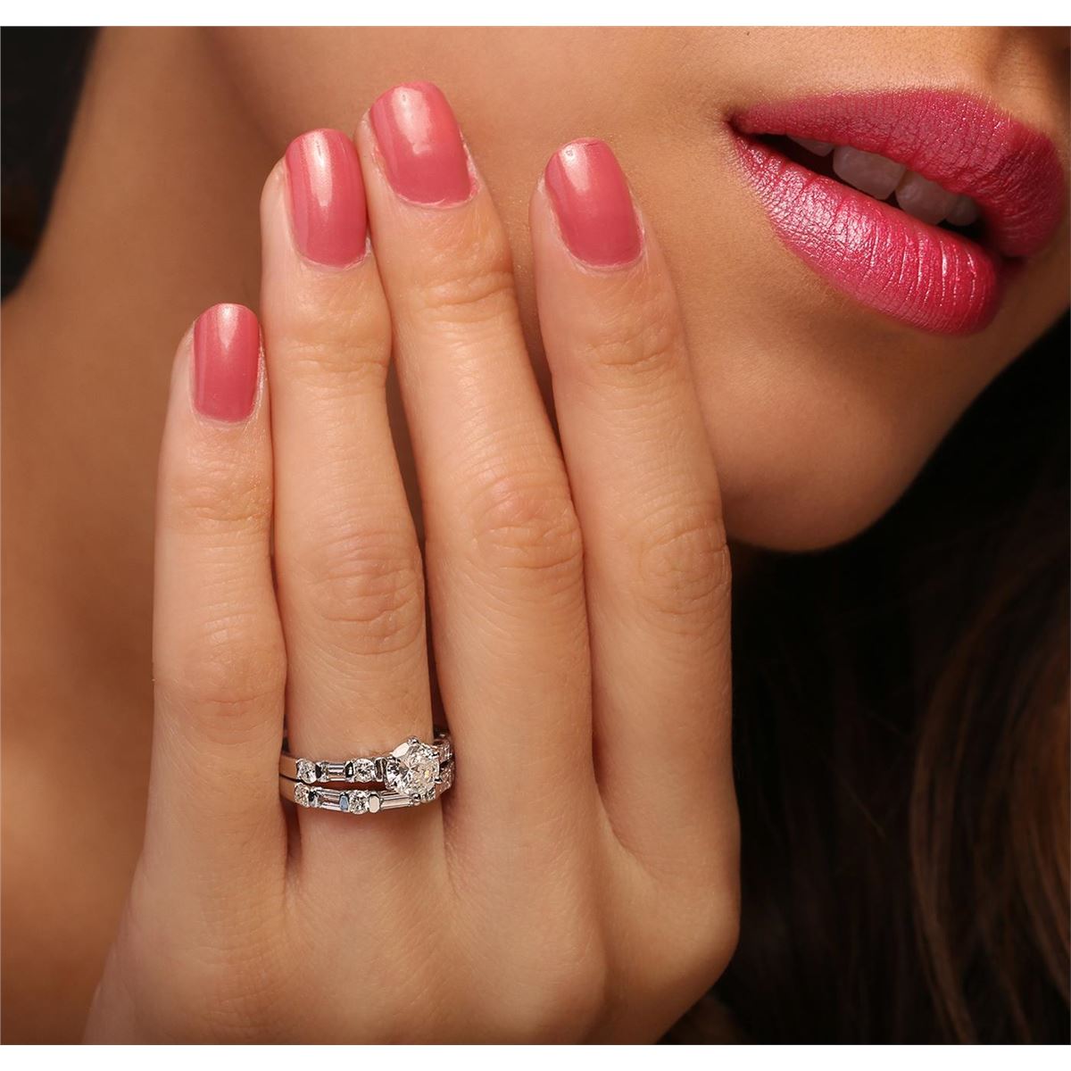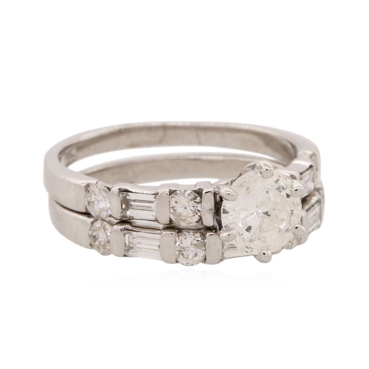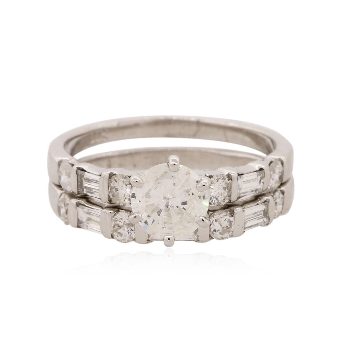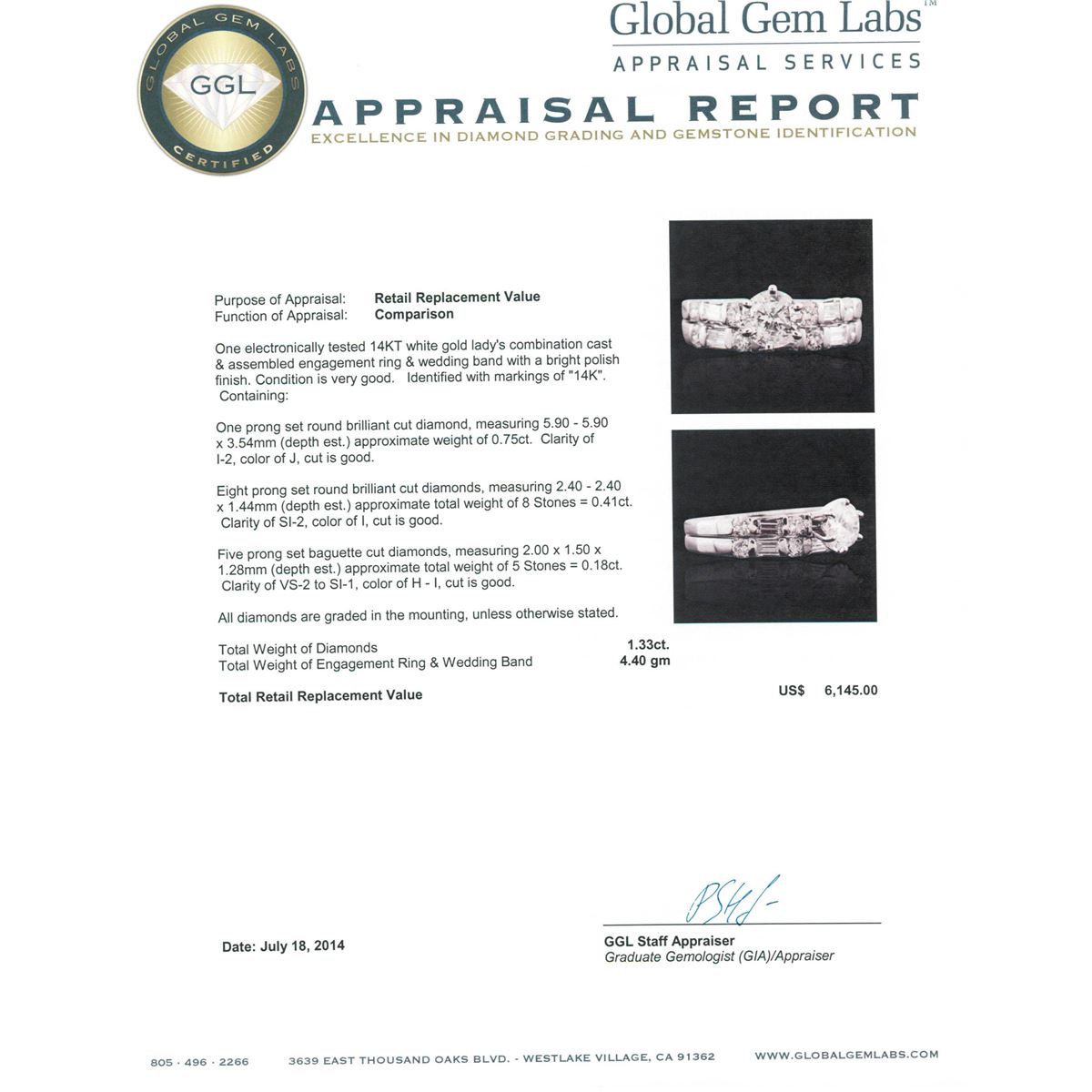 One electronically tested 14KT white gold Ladies combination cast & assembled engagement ring & wedding band with a bright polish finish. Condition is very good. Identified with markings of "14K". Containing: One prong set round brilliant cut diamond, measuring 5.90 - 5.90 x 3.54mm (depth est.) approximate weight of 0.75ct. Clarity: I-2. Color: J, Cut is Good. Eight prong set round brilliant cut diamonds, measuring 2.40 - 2.40 x 1.44mm (depth est.) approximate. Total Weight of 8 Stones = 0.41ct. Clarity: SI-2. Color: I, Cut is Good. Five prong set baguette cut diamonds, measuring 2.00 x 1.50 x 1.28mm (depth est.) approximate. Total Weight of 5 Stones = 0.18ct. Clarity: VS-2 to SI-1. Color: H - I, Cut is Good. All diamonds are graded in the mounting, unless otherwise stated. Total Weight of Diamonds 1.33ct. Total Weight of Engagement Ring & Wedding Band 4.40 grams.. GGL Appraised at $6,145.00.
