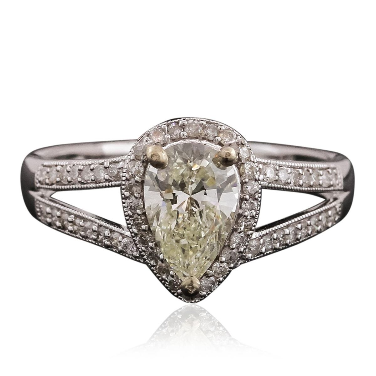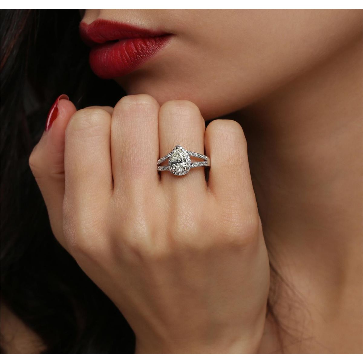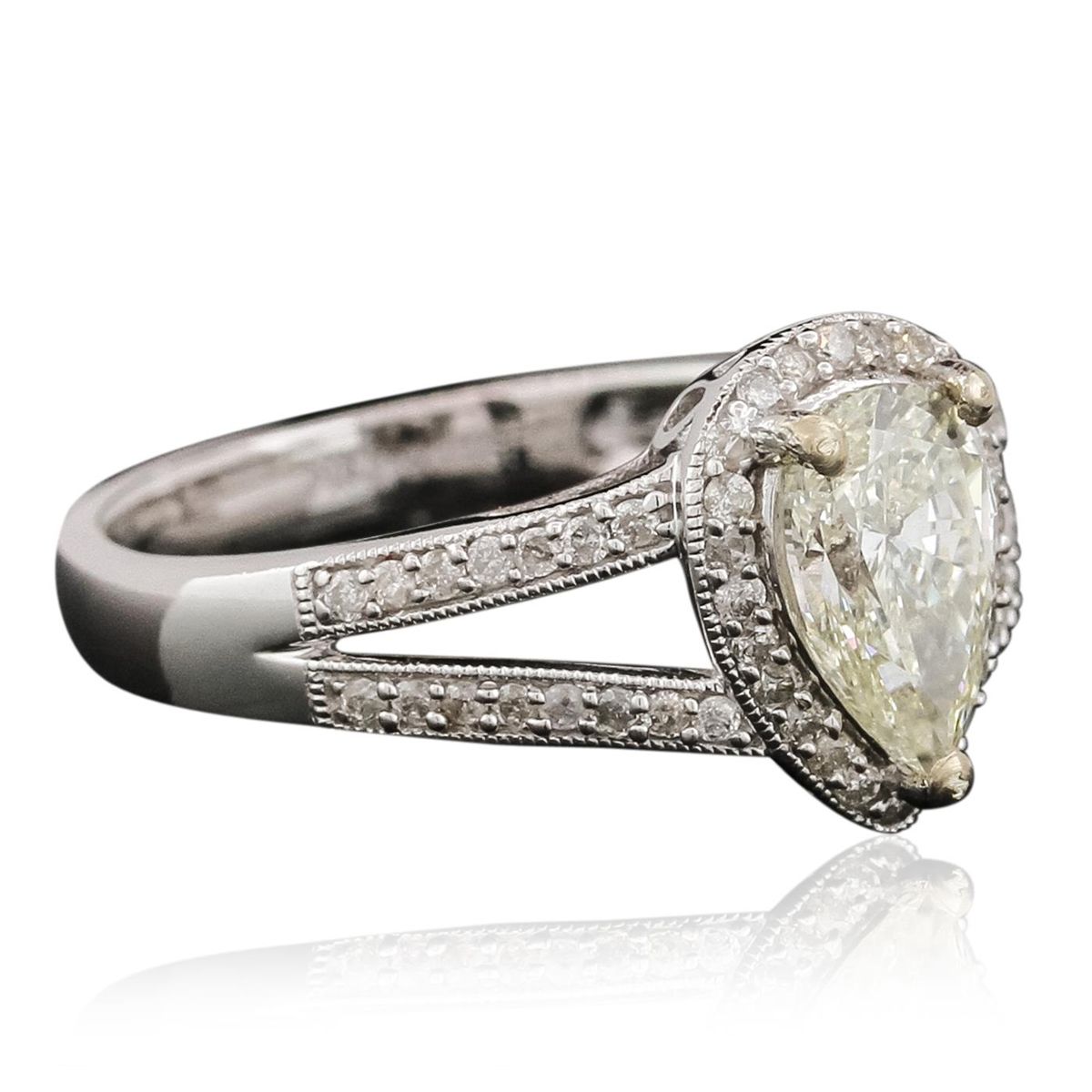 One electronically tested 14KT white gold ladies cast diamond unity ring. The featured diamond is set within a diamond bezel supported by diamond set split shoulders, completed by a two and one-half millimeter wide band. Bright polish finish with milgrain detailing throughout. Trademark is Orianne. Identified with markings of "14K". Condition is new, good workmanship. Containing: One prong set pear shaped cut diamond, measuring 8.50 x 5.50 x 3.30mm (depth est.) approximate weight of 1.01ct with a strong blue fluorescence. Graded in the setting. Clarity: SI-2. Color: L. Depth 60.0%. Table 61.8%. Fifty-Three prong set round brilliant cut diamonds, measuring 1.10 - 1.00 x 0.63mm (depth est.) approximate total weight of 53 Stones = 0.32ct. Graded in the setting. Clarity: I-1 to I-2. Color: G - I. Total Weight of Diamonds 1.33ct. Total Weight of Unity Ring 3.41 grams. AIG Appraised at $11,375.00.
