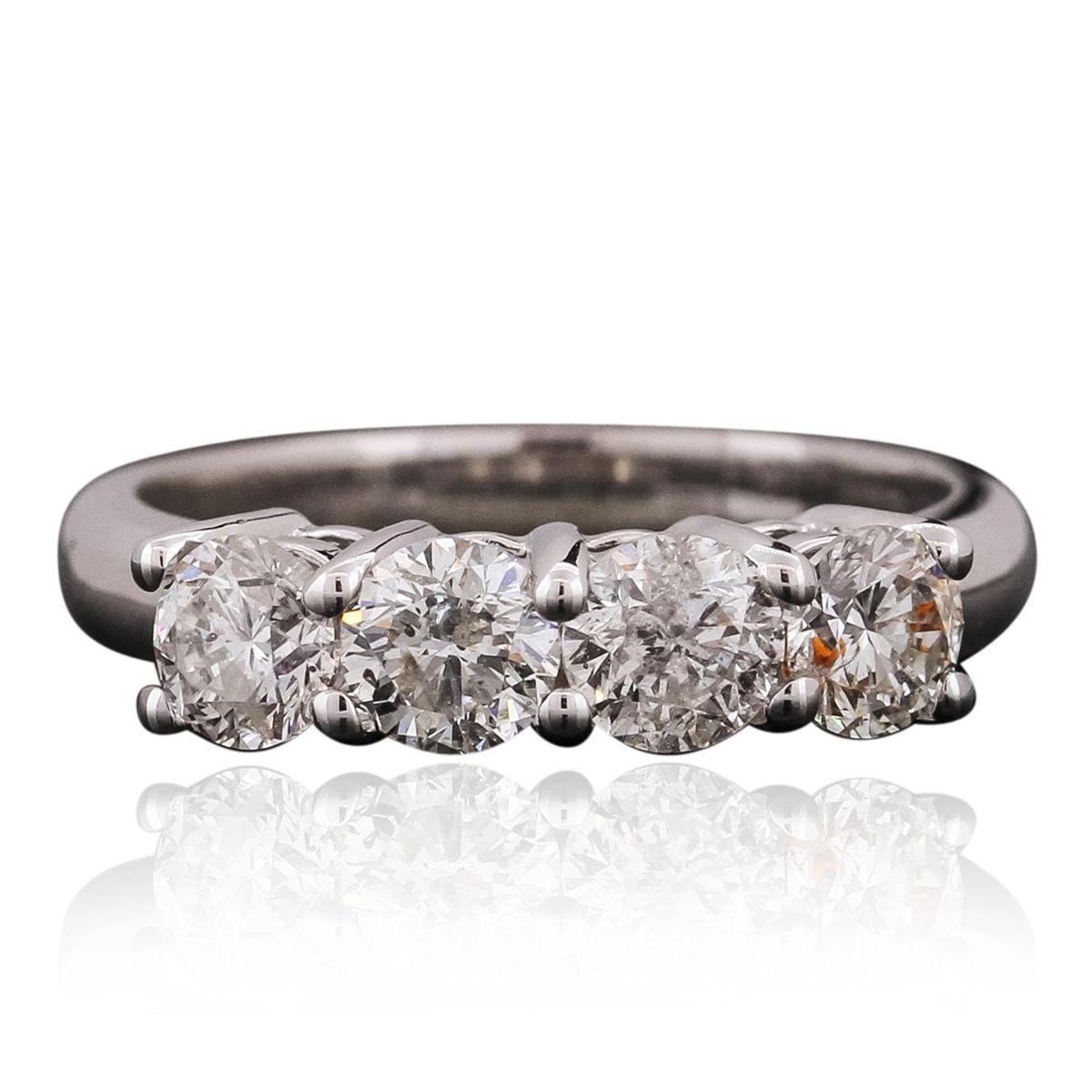 One electronically tested 14KT white gold ladies cast anniversary ring with a bright polish finish. Identified with markings of "14K". Condition is new. Containing: Four prong set round brilliant cut diamonds, measuring 4.50 - 4.50 x 2.70mm (depth est.) approximate total weight of 4 Stones = 1.33ct. Clarity: I-1 to I-2. Color: H - J, Cut is Good. All diamonds are graded in the mounting, unless otherwise stated. Total Weight of Diamonds 1.33ct. Total Weight of Ring 4.30 grams. GGL Appraised at $6,100.00.