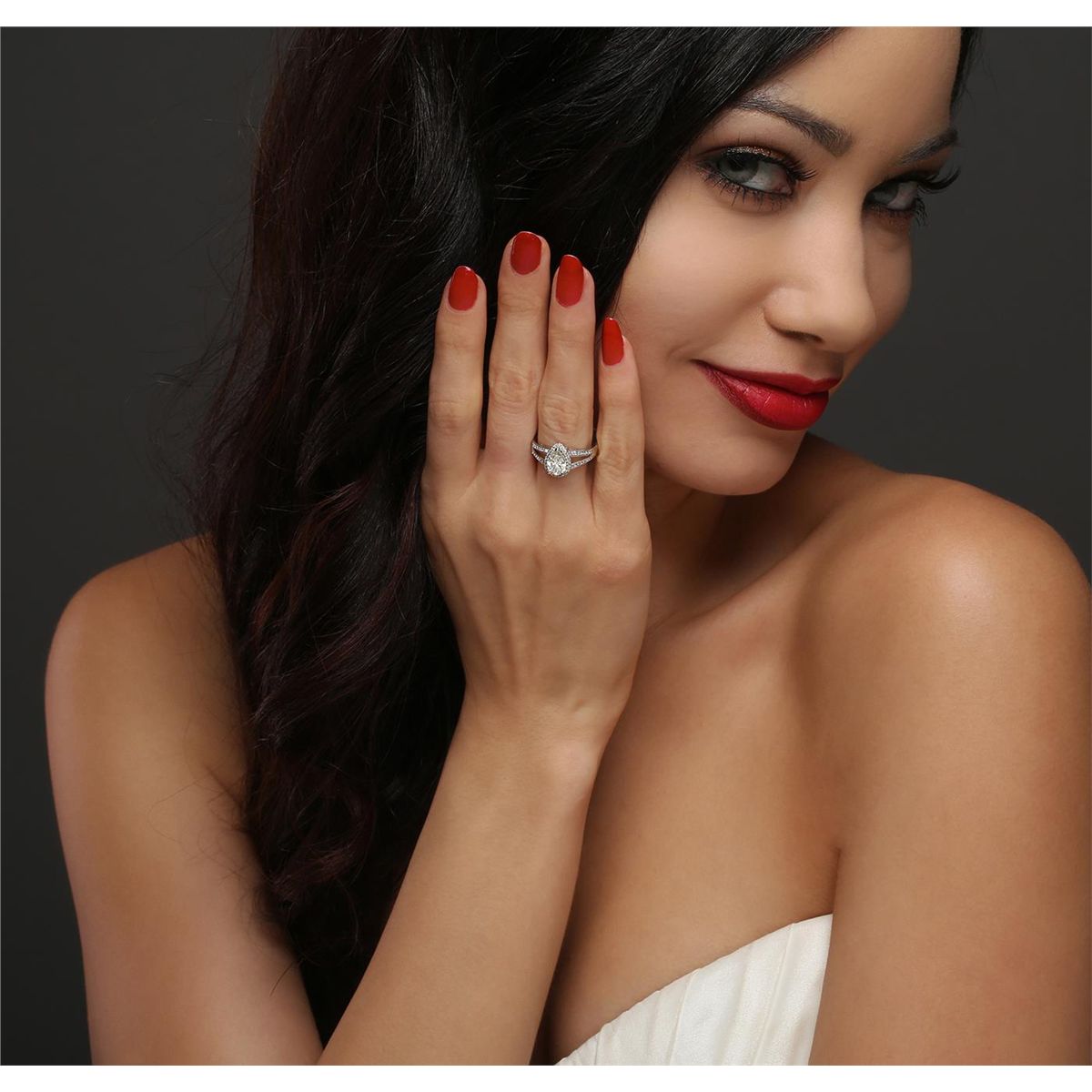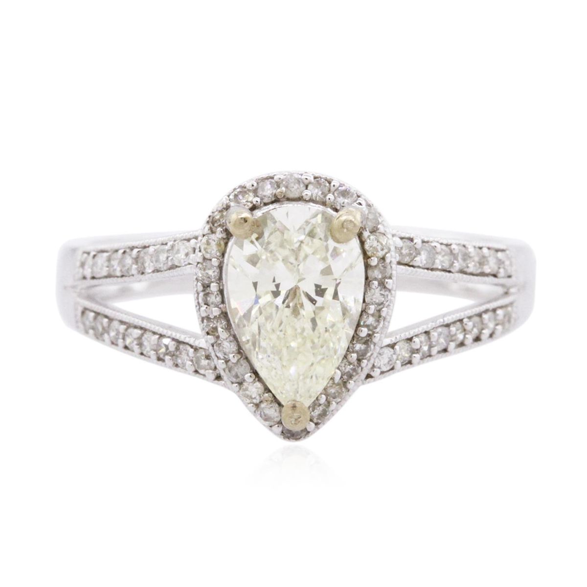 One electronically tested 14KT white gold ladies cast diamond unity ring. The featured diamond is set within a diamond bezel supported by diamond set split shoulders, completed by a two and one-half millimeter wide band. Bright polish finish with milgrain detailing throughout. Trademark is Orianne. Identified with markings of "14K". Condition is new, good workmanship. Containing: One prong set pear shaped cut diamond, measuring 8.50 x 5.50 x 3.30mm (depth est.) approximate weight of 1.01ct with a strong blue fluorescence. Graded in the setting. Clarity: SI-2. Color: L. Depth 60.0%. Table 61.8%. Fifty-Three prong set round brilliant cut diamonds, measuring 1.10 - 1.00 x 0.63mm (depth est.) approximate total weight of 53 Stones = 0.32ct. Graded in the setting. Clarity: I-1 to I-2. Color: G - I. Total Weight of Diamonds 1.33ct. Total Weight of Unity Ring 3.41 grams. AIG Appraised at $11,375.00.