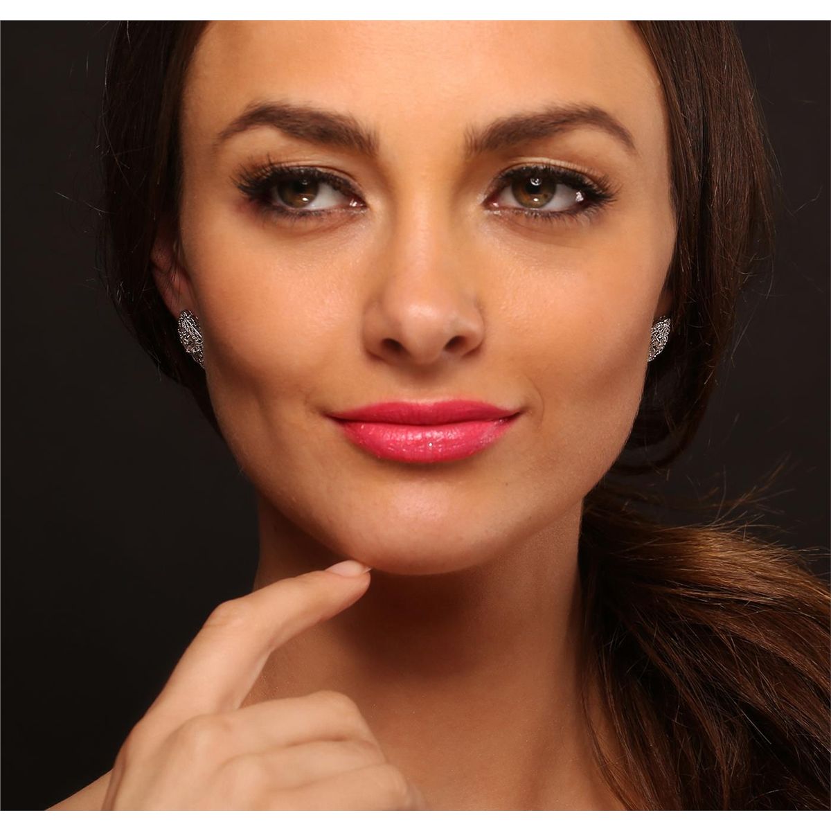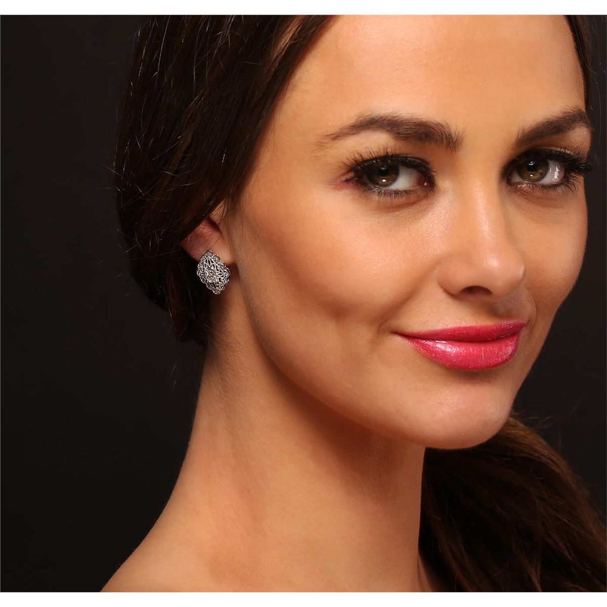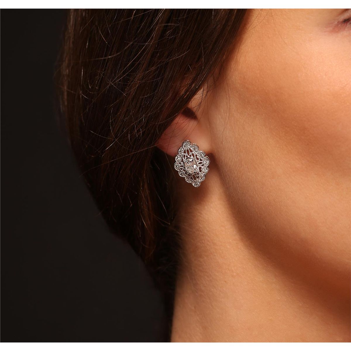 One pair electronically tested 14KT white gold Ladies combination cast & assembled earrings with friction posts with a bright polish finish. Condition is new. Identified with markings of "14K". Containing: Two prong set oval shaped cut diamonds, measuring 5.40 x 4.40 x 3.00mm (depth est.) approximate total weight of 2 Stones = 1.10ct. Clarity of I-2, Color of J, Cut is Good. Twenty-Four prong set round brilliant cut diamonds, measuring 1.40 - 1.40 x 0.84mm (depth est.) approximate total weight of 24 Stones = 0.24ct. Clarity of SI-2, Color of I - J, Cut is Good. Total Weight of Diamonds 1.34ct. Total Weight of Earrings 4.30gm. GGL Appraised at $7,315.00.
