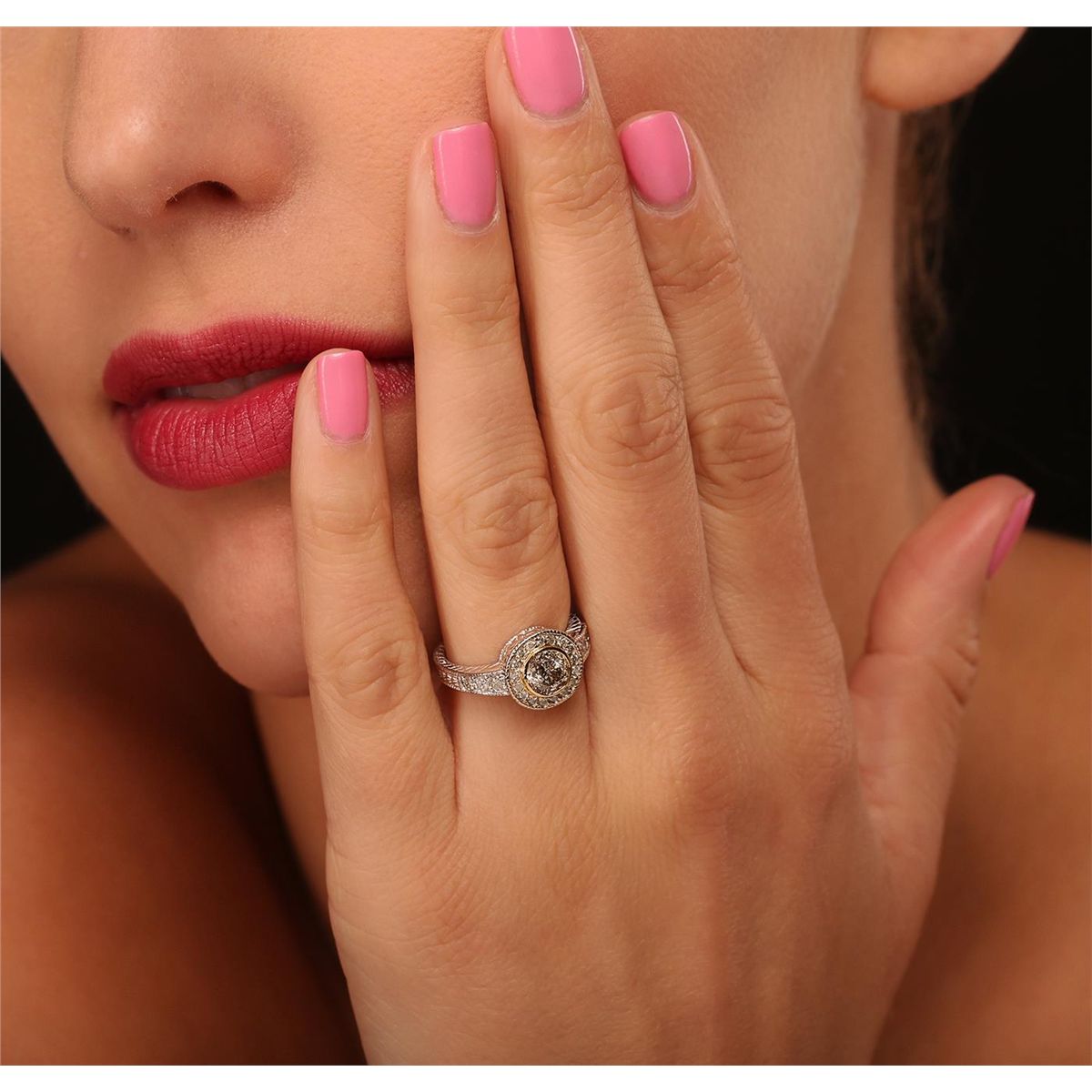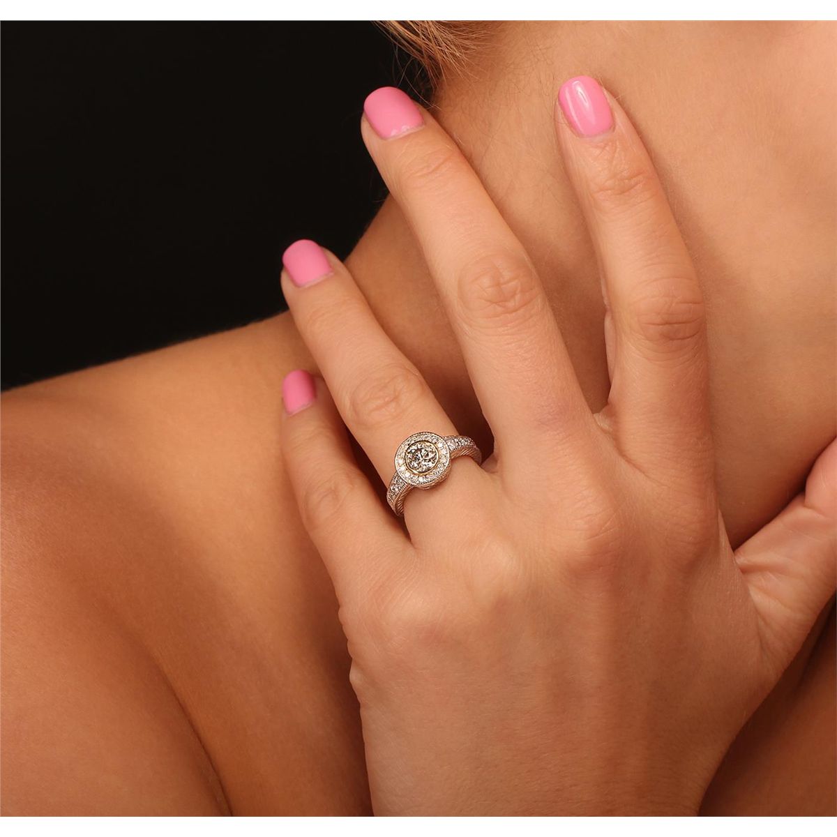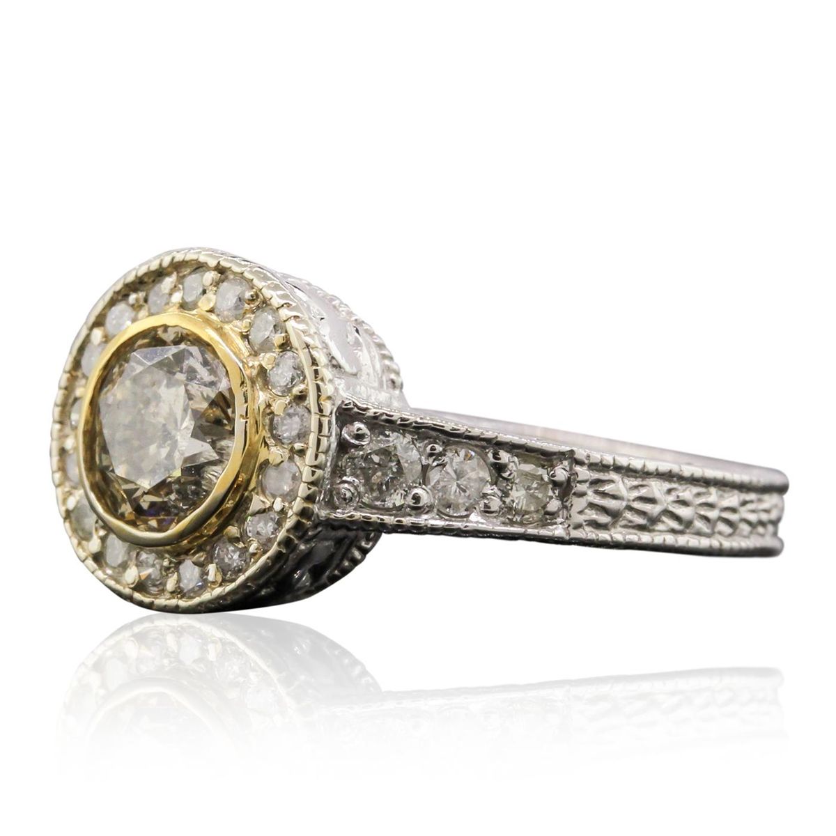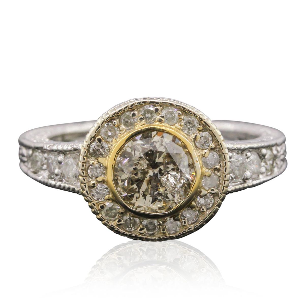 One electronically tested 14KT white gold ladies cast diamond unity ring. Condition is new, good workmanship. The feature diamond is set within an inner yellow gold bezel and an outer diamond bezel supported by diamond set shoulders, completed by a two and one-half millimeter wide band. Bright and patterned finish with milgrain detailing. Identified with markings of "14K". Containing: One bezel set round brilliant cut diamond, measuring 6.10 - 6.00 x 4.00mm (depth est) approximate total weight of 1.02ct. Graded in the setting. Clarity I-1 Color Very Light Brown. Twenty-two bead set round brilliant cut diamonds, measuring 2.20 - 1.50 x 1.11mm (depth est.) approximate total weight of 22 Stones = 0.32ct. Graded in the setting. Clarity I-1 to I-2. Color H-I. Total Weight of Diamonds 1.34ct. Total Weight of Ring 4.71 grams. AIG Appraised at $10,280.00.
