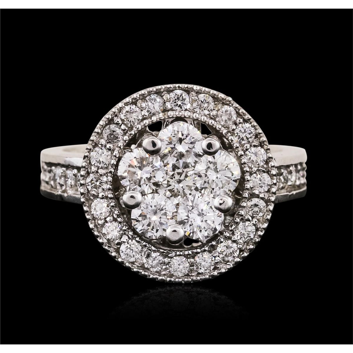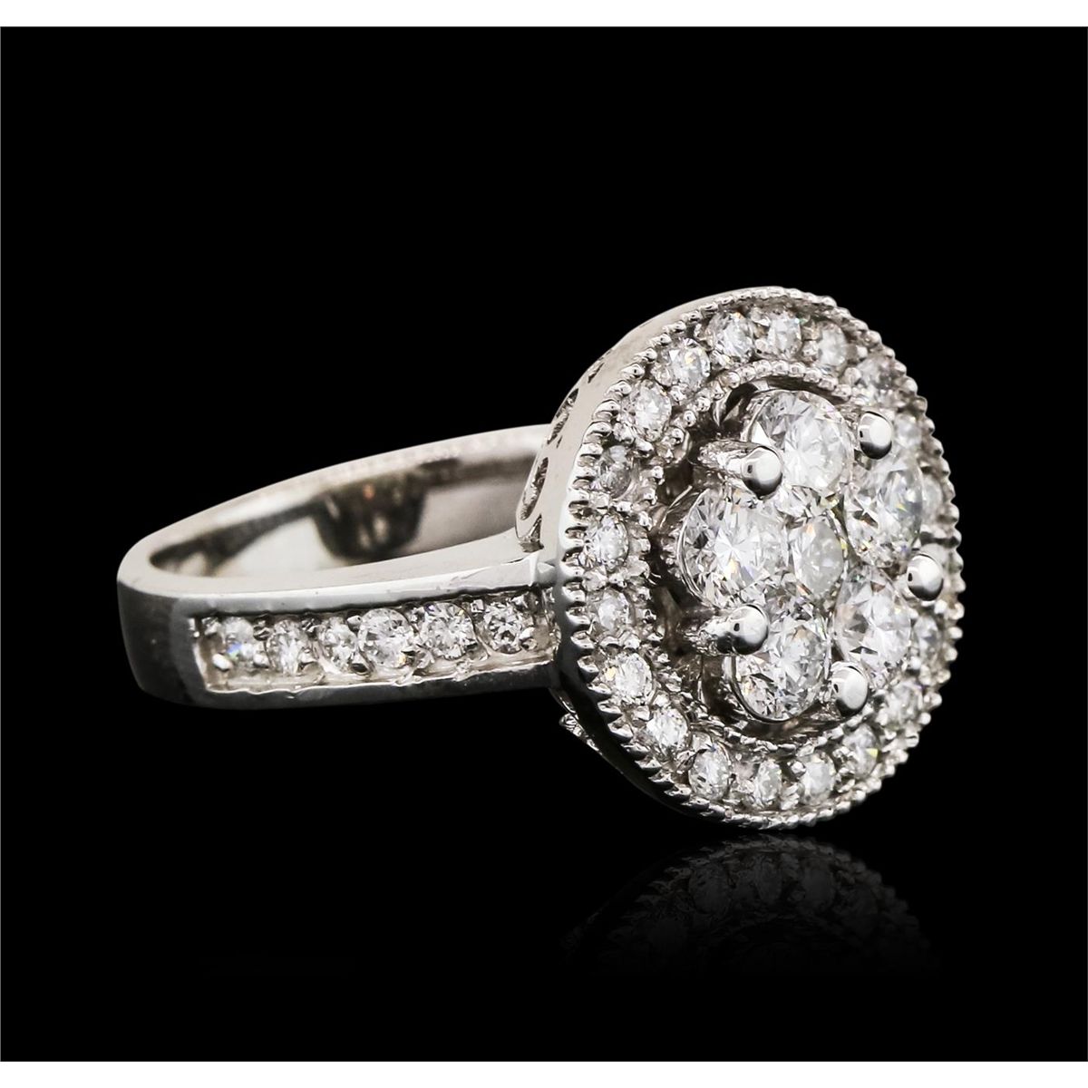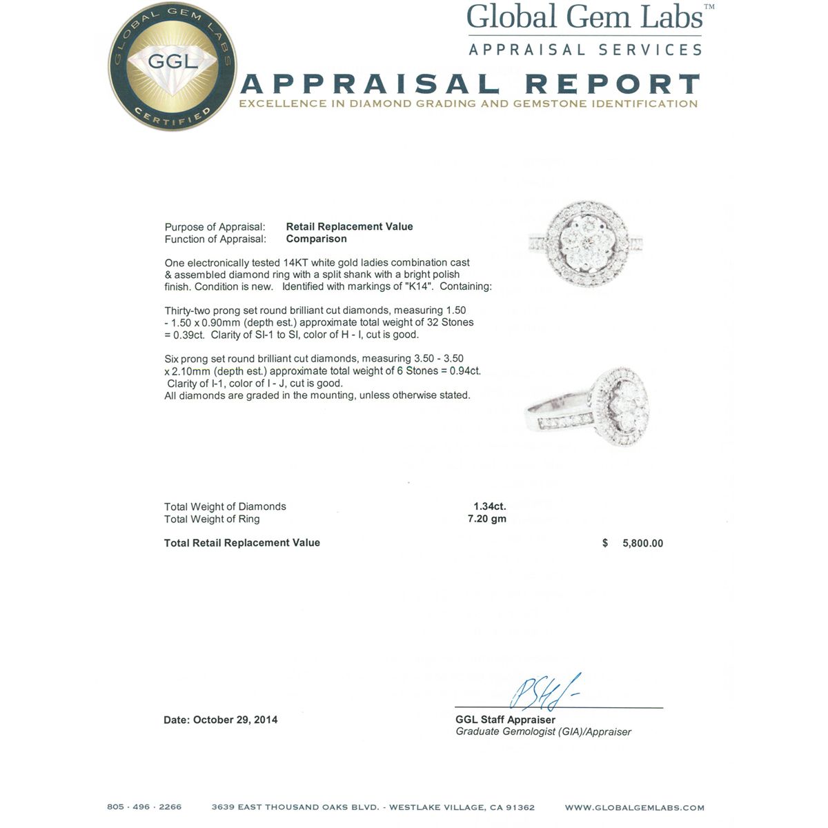 One electronically tested 14KT white gold ladies combination cast & assembled diamond ring with a split shank with a bright polish finish. Identified with markings of K14. Condition is new. Containing: Thirty-Two prong set round brilliant cut diamonds, measuring 1.50 - 1.50 x 0.90mm (depth est.) approximate total weight of 32 Stones = 0.39ct. Clarity: SI-1 to SI. Color: H - I, Cut is Good. Six prong set round brilliant cut diamonds, measuring 3.50 - 3.50 x 2.10mm (depth est.) approximate total weight of 6 Stones = 0.94ct. Clarity: I-1. Color: I - J, Cut is Good. All diamonds are graded in the mounting, unless otherwise stated. Total Weight of Diamonds 1.34ct. Total Weight of Ring 7.20 grams. GGL Appraised at $5,800.00.