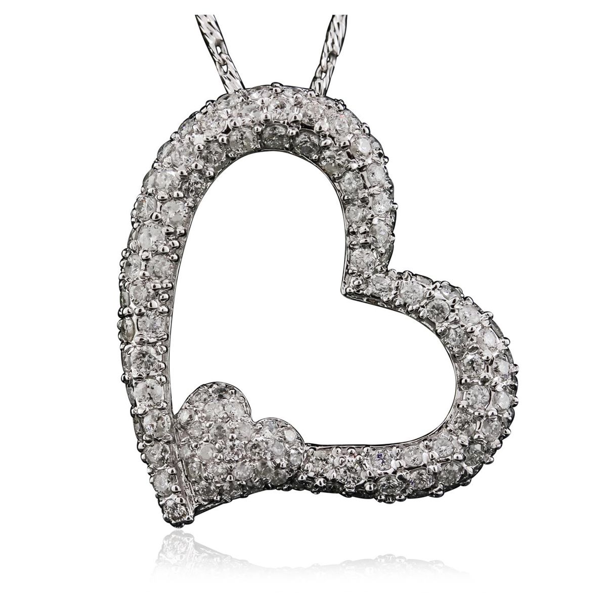 One electronically tested 14KT white gold ladies cast & assembled diamond " heart " pendant with chain. The pendant is completed by an eighteen inch 14KT white gold designer style chain, terminating in a lobster clasp. Bright polish finish Condition is new, good workmanship. Containing: One Hundred Eleven bead set round brilliant cut diamonds, measuring 1.60 - 1.30 x 0.87mm (depth est.) approximate total weight of 111 Stones = 1.35ct. The below listed clarity & color grade reflect an overall range for the group. Graded in the setting. Clarity: SI-1 to I-2. Color: F - I. Total Weight of Diamonds 1.35ct. Total Weight of Pendant With Chain 7.74 grams. AIG Appraised at $5,210.00.