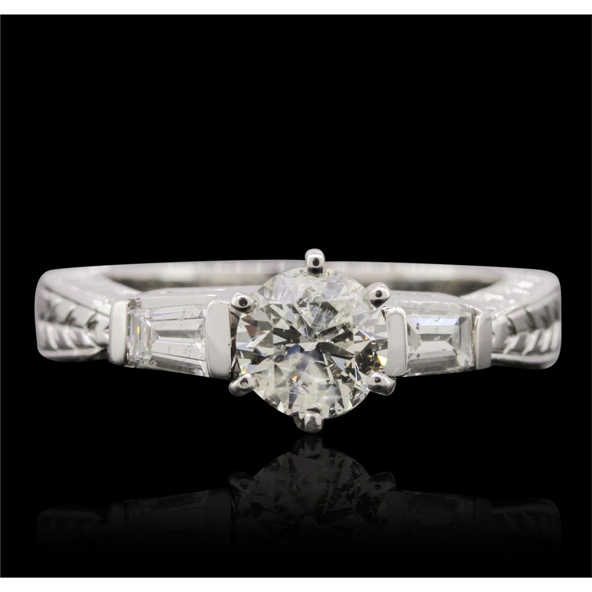 One electronically tested 14KT white gold ladies cast diamond unity ring with a bright polish finish. Condition is new, good workmanship. The featured diamond is accented by a single diamond on either side supported by patterned shoulders, completed by a two and one-half millimeter wide band. Identified with markings of "14K". Containing: One prong set round brilliant cut diamond, measuring 5.95 - 5.90 x 4.00mm (depth est.) approximate weight of 0.96ct. Graded in the setting. Clarity: I-1 . Color: 67.5%. Table 59.0%. Two channel set baguette cut (tapered) diamonds, measuring from 4.50 x 2.50 x 1.75mm (depth est.) to 4.60 x 2.70 x 1.89mm (depth est.) approximate. Total Weight of 2 Stones = 0.39ct. Color & clarity grade are an average for the pair. Graded in the setting. Clarity: SI-2 . Color: H. Total Weight of Diamonds 1.35ct.. Total Weight of Ring 5.94 grams. AIG Appraised at $11,335.00.