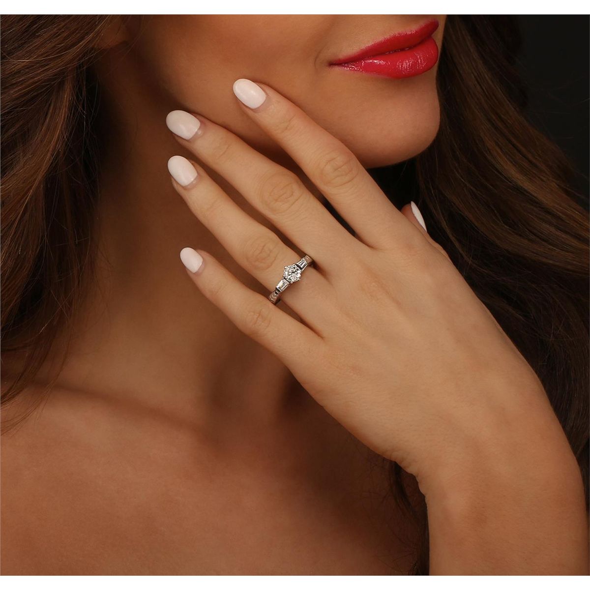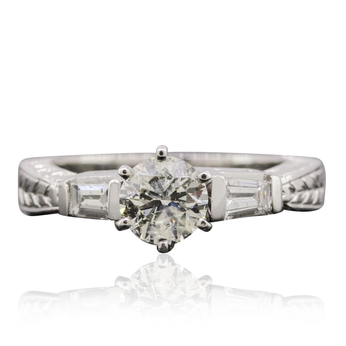 One electronically tested 14KT white gold ladies cast diamond unity ring with a bright polish finish. Condition is new, good workmanship. The featured diamond is accented by a single diamond on either side supported by patterned shoulders, completed by a two and one-half millimeter wide band. Identified with markings of "14K". Containing: One prong set round brilliant cut diamond, measuring 5.95 - 5.90 x 4.00mm (depth est.) approximate weight of 0.96ct. Graded in the setting. Clarity: I-1 . Color: 67.5%. Table 59.0%. Two channel set baguette cut (tapered) diamonds, measuring from 4.50 x 2.50 x 1.75mm (depth est.) to 4.60 x 2.70 x 1.89mm (depth est.) approximate. Total Weight of 2 Stones = 0.39ct. Color & clarity grade are an average for the pair. Graded in the setting. Clarity: SI-2 . Color: H. Total Weight of Diamonds 1.35ct.. Total Weight of Ring 5.94 grams. AIG Appraised at $11,335.00.