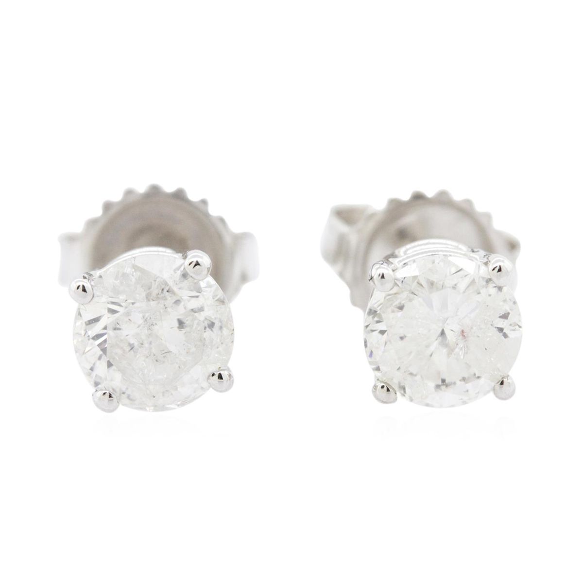 One pair electronically tested 14KT white gold ladies cast stud earrings with friction posts with a bright polish finish. Identified with markings of "14K". Condition is new. Containing: One prong set round brilliant cut diamond, measuring 5.68 - 5.63 x 3.39mm (depth est.) approximate weight of 0.66ct. Clarity: I-3. Color: I, Cut is Good. One prong set round brilliant cut diamond, measuring 5.73 - 5.72 x 3.45mm (depth est.) approximate weight of 0.69ct. Clarity: I-3. Color: I, Cut is Good. All diamonds are graded in the mounting, unless otherwise stated total weight of Diamonds 1.35ct. Total Weight of Earrings 1.60 grams. GGL Appraised at $4,800.00.