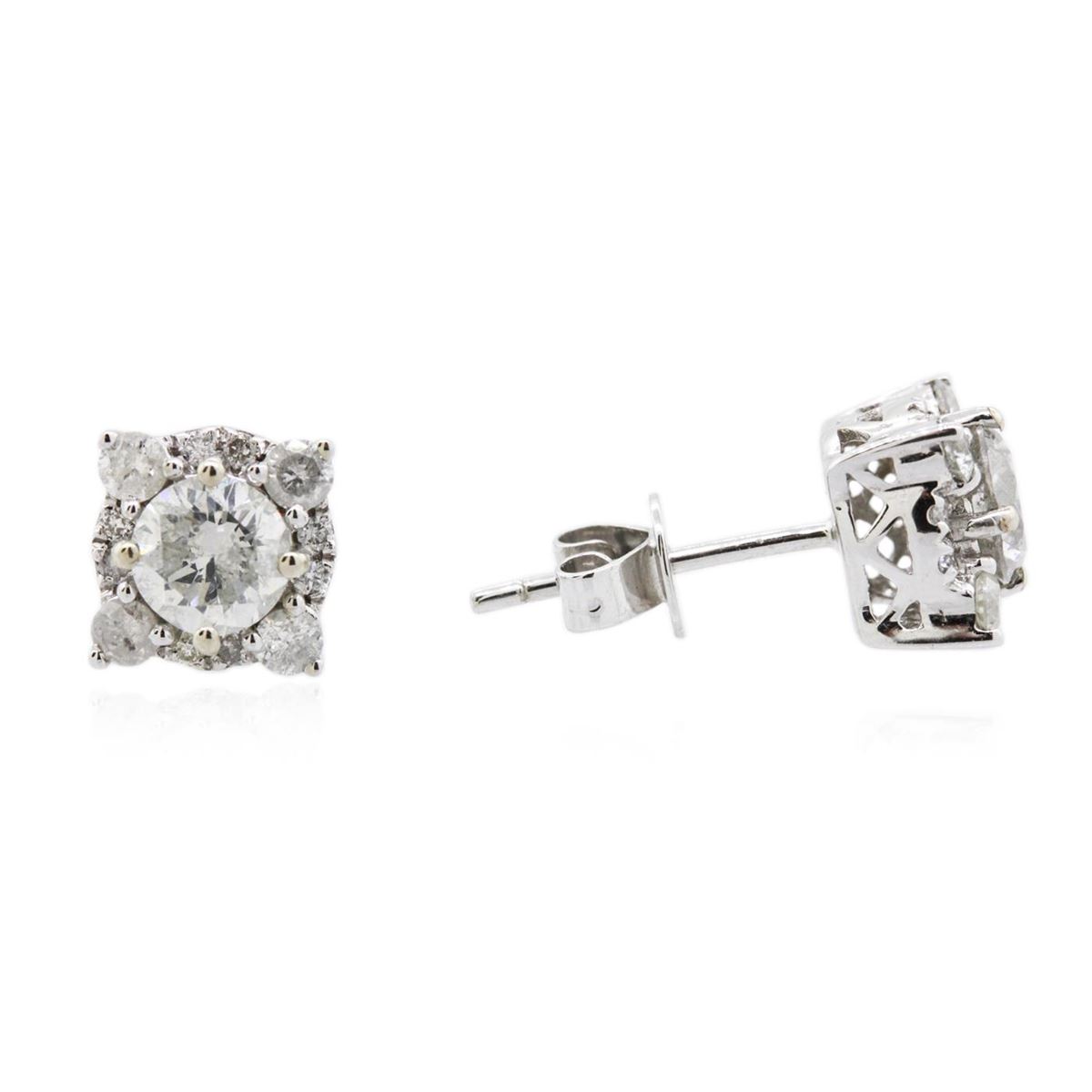 One pair electronically tested 14KT white gold ladies cast & assembled diamond cluster earrings with standard backs. Each earring features a round brilliant center set with four smaller diamonds, above a gallery of small round brilliants. Condition is new, good workmanship. Containing: Two prong set round brilliant cut diamonds, measuring 5.10 - 5.00 x 3.08mm (depth est.) approximate total weight of 2 Stones = 1.00ct. Graded in the setting. Clarity: I-2. Color: I - J Eight prong set round brilliant cut diamonds, measuring 2.20 - 2.10 x 1.31mm (depth est.) approximate total weight of 8 Stones = 0.30ct. Graded in the setting. Clarity: I-1 to I-2. Color: I - J Sixteen prong set round brilliant cut diamonds, measuring 1.00 - 1.00 x 0.60mm (depth est.) approximate total weight of 16 Stones = 0.06ct. Graded in the setting. Clarity: I-1 to I-2. Color: H - I. Total Weight of Diamonds 1.36ct. Total Weight of Earrings 2.38gm. AIG Appraised at $5,300.00.