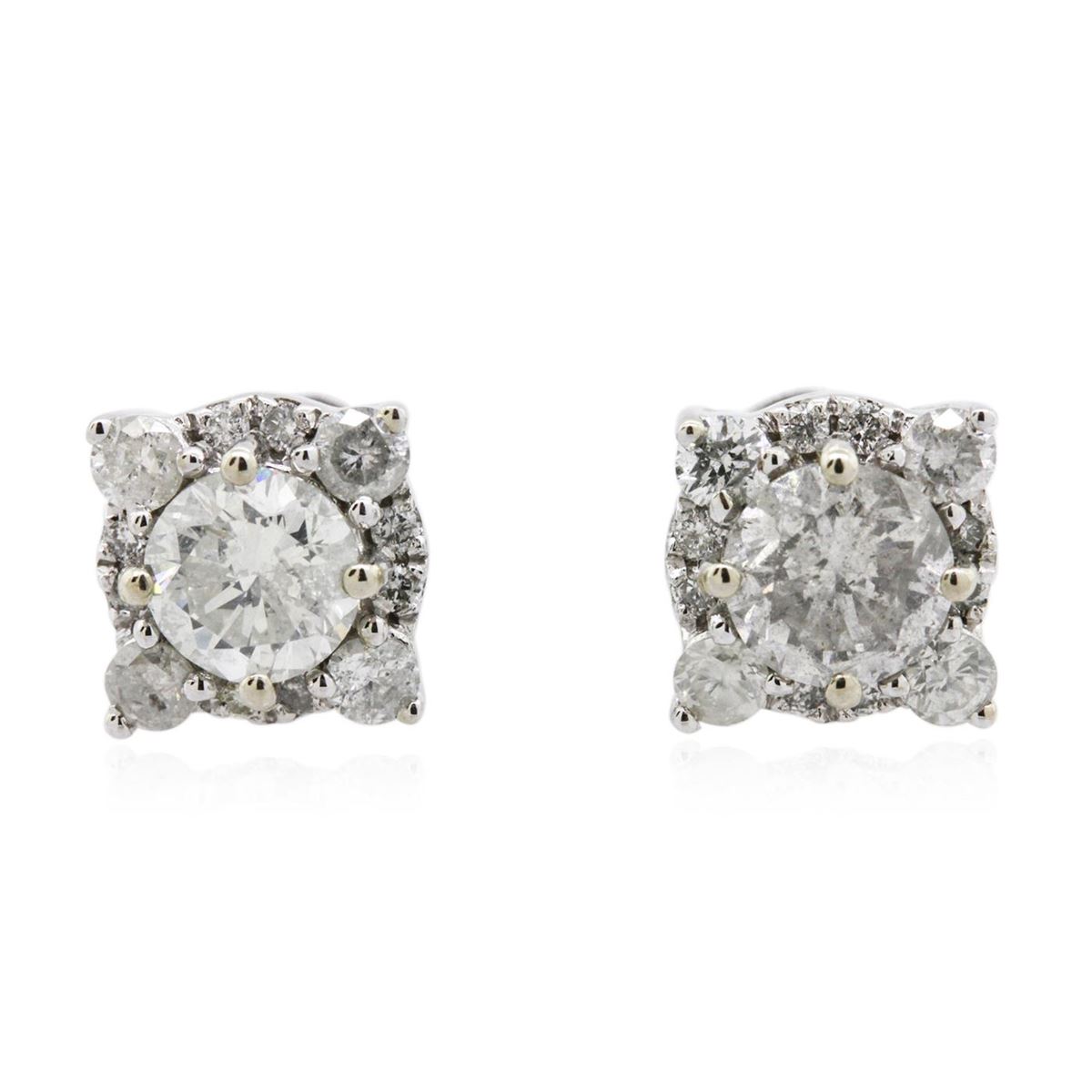 One pair electronically tested 14KT white gold ladies cast & assembled diamond cluster earrings with standard backs. Each earring features a round brilliant center set with four smaller diamonds, above a gallery of small round brilliants. Condition is new, good workmanship. Containing: Two prong set round brilliant cut diamonds, measuring 5.10 - 5.00 x 3.08mm (depth est.) approximate total weight of 2 Stones = 1.00ct. Graded in the setting. Clarity: I-2. Color: I - J Eight prong set round brilliant cut diamonds, measuring 2.20 - 2.10 x 1.31mm (depth est.) approximate total weight of 8 Stones = 0.30ct. Graded in the setting. Clarity: I-1 to I-2. Color: I - J Sixteen prong set round brilliant cut diamonds, measuring 1.00 - 1.00 x 0.60mm (depth est.) approximate total weight of 16 Stones = 0.06ct. Graded in the setting. Clarity: I-1 to I-2. Color: H - I. Total Weight of Diamonds 1.36ct. Total Weight of Earrings 2.38gm. AIG Appraised at $5,300.00.
