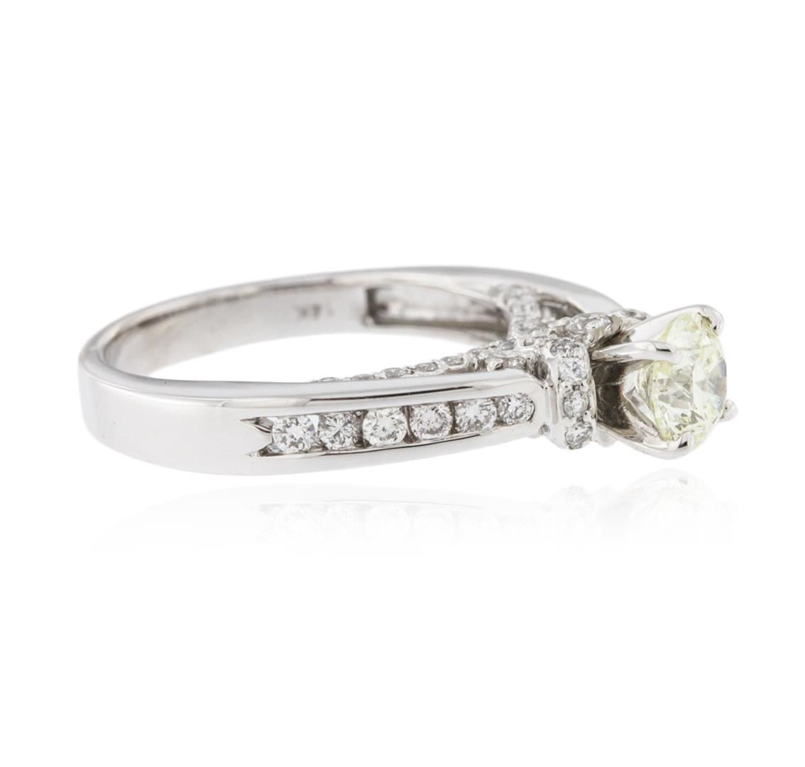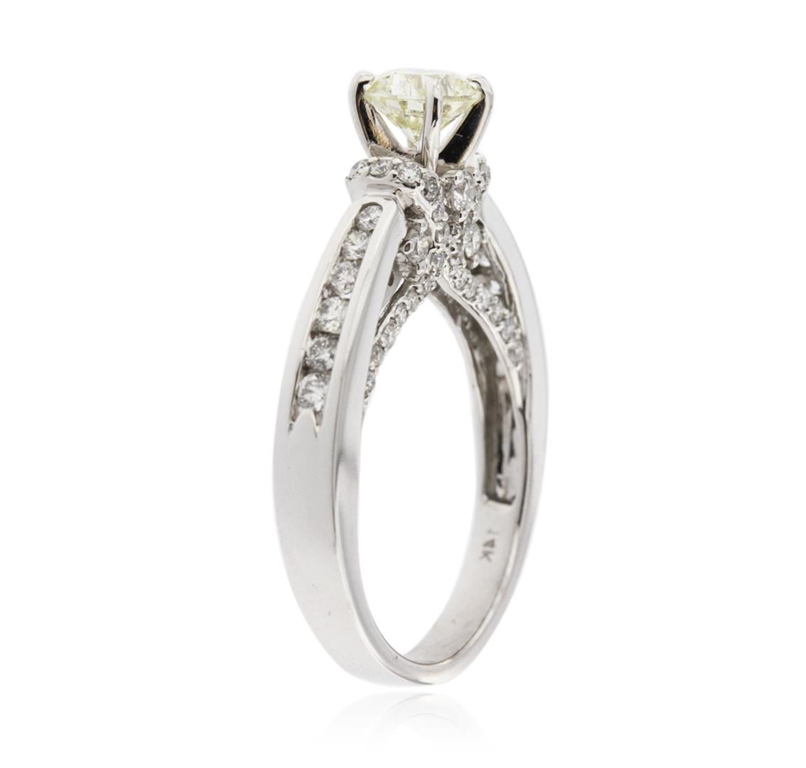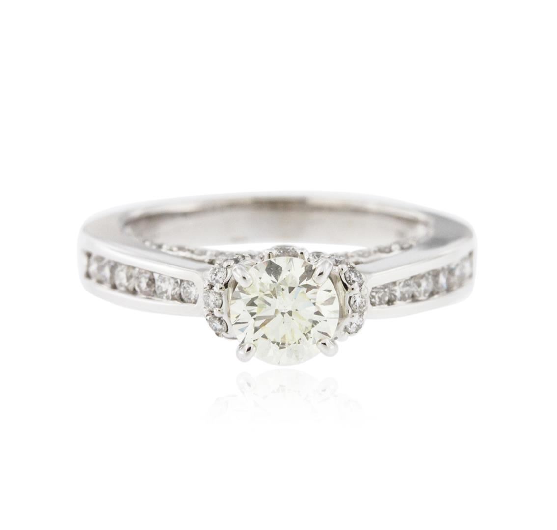 One electronically tested 14KT white gold ladies cast diamond engagement ring with a bright polish finish. Identified with markings of "14K". Condition is new. Containing: One prong set round brilliant cut diamond, measuring 5.66 - 5.59 x 3.38mm (depth est.) approximate weight of 0.65ct. Clarity: SI-2, Cut is Good. Sixty-Four channel set round brilliant cut diamonds, measuring 1.80 - 1.10 x 0.87mm (depth est.) approximate total weight of 64 Stones = 0.71ct. Clarity: SI-1 to I-1. Color: I - J, Cut is Good. All diamonds are graded in the mounting, unless otherwise stated. Total Weight of Diamonds 1.36ct. Total Weight of Engagement Ring 5.10 grams. GGL Appraised at $5,490.00.