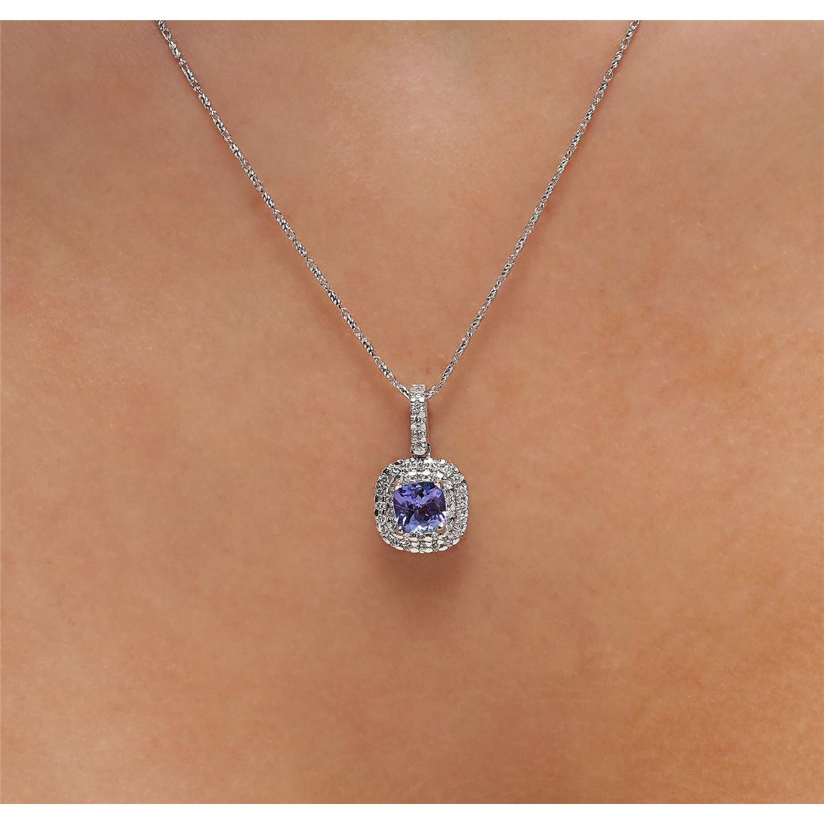 One electronically tested 14KT white gold ladies combination cast & assembled tanzanite and diamond pendant & chain 18.3" long, fancy link with a lobster claw clasp with a bright polish finish. Condition is new. Containing: One prong set square cushion modified brilliant cut natural tanzanite, measuring 6.48 x 6.47 x 4.13mm, approximate weight of 1.36ct., clarity is eye clean, type I, medium light, moderately strong, violet color, (GIA V 4/4), cut is good. Forty prong set round brilliant cut diamonds, measuring 1.20 - 1.20 x 0.72mm (depth est.) approximate total weight of 40 Stones = 0.25ct. Clarity: SI-1 to I-1. Color: H - I, Cut is Good. All diamonds and colored gemstones are graded in the mounting, unless otherwise stated. Colored gemstones are presumed to have been subjected to commonly used enhancement processes. Total Weight of Colored Stones 1.36ct. Total Weight of Diamonds 0.25ct. Total Weight of Pendant & Chain 6.40 grams. GGL Appraised at $3,395.00.