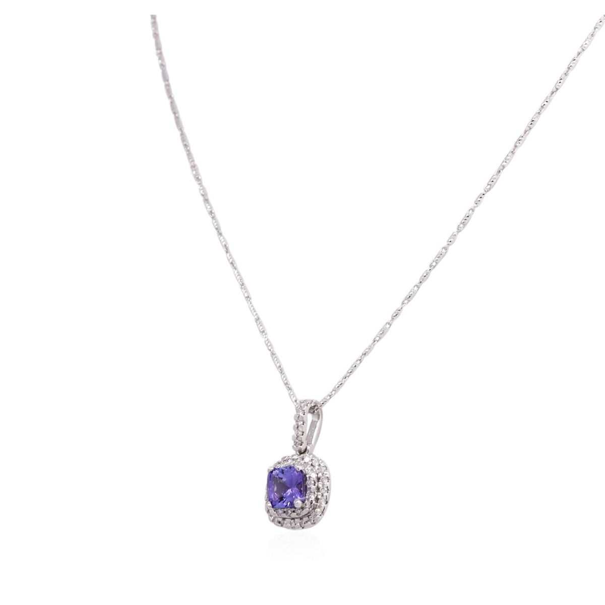 One electronically tested 14KT white gold ladies combination cast & assembled tanzanite and diamond pendant & chain 18.3" long, fancy link with a lobster claw clasp with a bright polish finish. Condition is new. Containing: One prong set square cushion modified brilliant cut natural tanzanite, measuring 6.48 x 6.47 x 4.13mm, approximate weight of 1.36ct., clarity is eye clean, type I, medium light, moderately strong, violet color, (GIA V 4/4), cut is good. Forty prong set round brilliant cut diamonds, measuring 1.20 - 1.20 x 0.72mm (depth est.) approximate total weight of 40 Stones = 0.25ct. Clarity: SI-1 to I-1. Color: H - I, Cut is Good. All diamonds and colored gemstones are graded in the mounting, unless otherwise stated. Colored gemstones are presumed to have been subjected to commonly used enhancement processes. Total Weight of Colored Stones 1.36ct. Total Weight of Diamonds 0.25ct. Total Weight of Pendant & Chain 6.40 grams. GGL Appraised at $3,395.00.