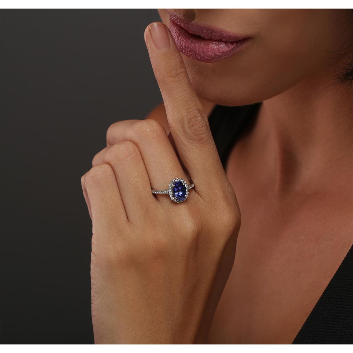 One electronically tested 14KT white gold ladies combination cast & assembled tanzanite and diamond ring with a flat shank with a bright polish finish. Identified with markings of "14K". Condition is new. Containing: One prong set oval modified brilliant cut natural tanzanite, measuring 8.52 x 5.96 x 3.87mm, approximate weight of 1.36ct., clarity is eye clean, type I, medium, moderately strong, bluish violet color, (GIA bV 5/4), cut is good. Forty prong set round brilliant cut diamonds, measuring 1.20 - 1.20 x 0.72mm (depth est.) approximate total weight of 40 Stones = 0.25ct. Clarity: I-1 to I-2. Color: I - J, Cut is Good. Colored gemstones are presumed to have been subjected to commonly used enhancement processes. All diamonds and colored gemstones are graded in the mounting, unless otherwise stated. Total Weight of Colored Stones 1.36ct. Total Weight of Diamonds 0.25ct. Total Weight of Ring 2.80 grams. GGL Appraised at $3,510.00.