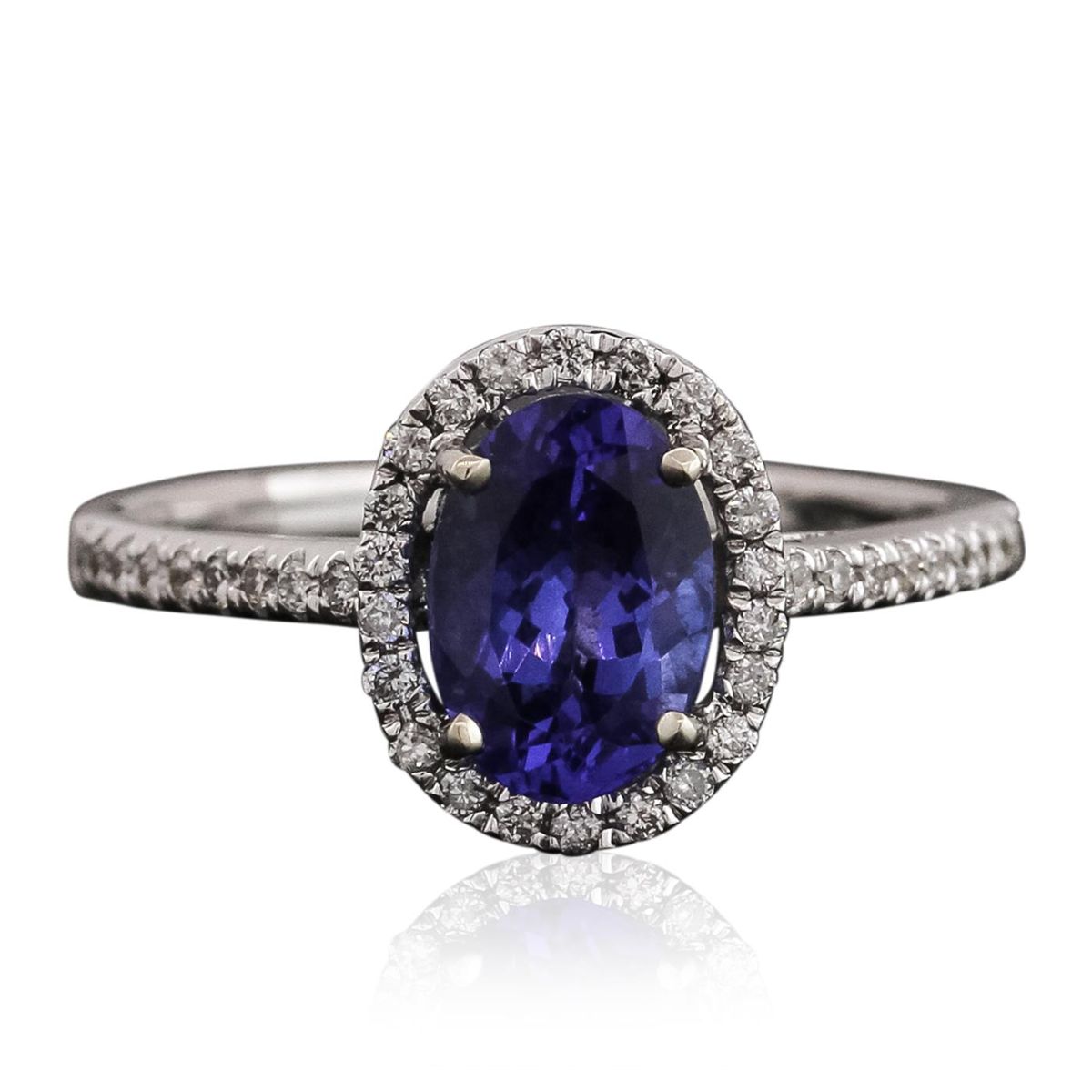 One electronically tested 14KT white gold ladies combination cast & assembled tanzanite and diamond ring with a flat shank with a bright polish finish. Identified with markings of "14K". Condition is new. Containing: One prong set oval modified brilliant cut natural tanzanite, measuring 8.52 x 5.96 x 3.87mm, approximate weight of 1.36ct., clarity is eye clean, type I, medium, moderately strong, bluish violet color, (GIA bV 5/4), cut is good. Forty prong set round brilliant cut diamonds, measuring 1.20 - 1.20 x 0.72mm (depth est.) approximate total weight of 40 Stones = 0.25ct. Clarity: I-1 to I-2. Color: I - J, Cut is Good. Colored gemstones are presumed to have been subjected to commonly used enhancement processes. All diamonds and colored gemstones are graded in the mounting, unless otherwise stated. Total Weight of Colored Stones 1.36ct. Total Weight of Diamonds 0.25ct. Total Weight of Ring 2.80 grams. GGL Appraised at $3,510.00.