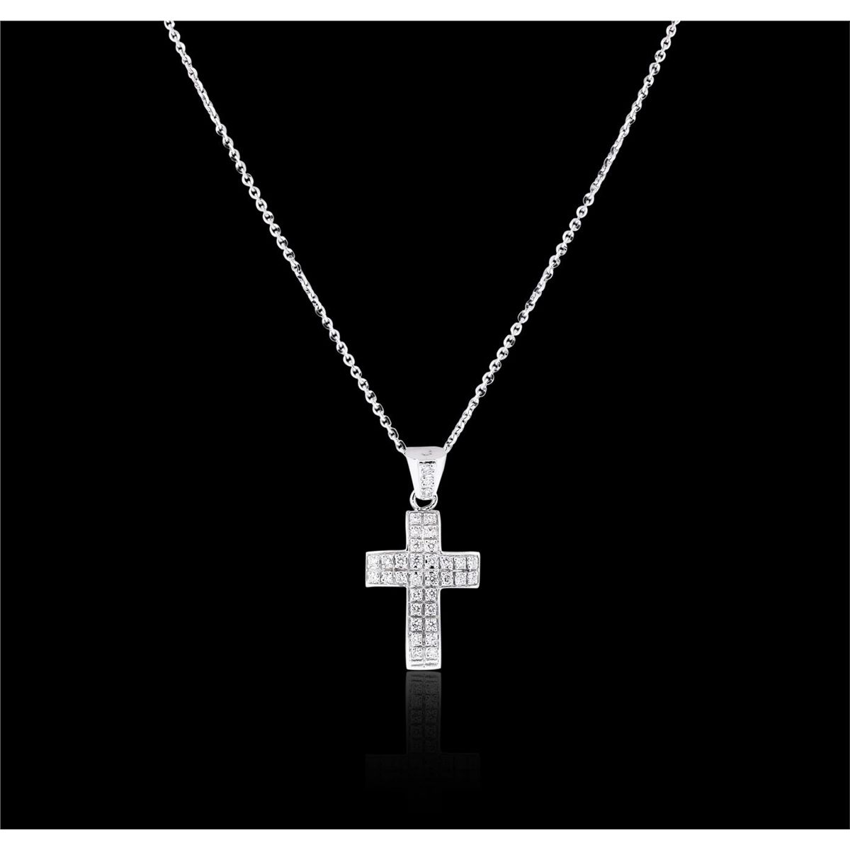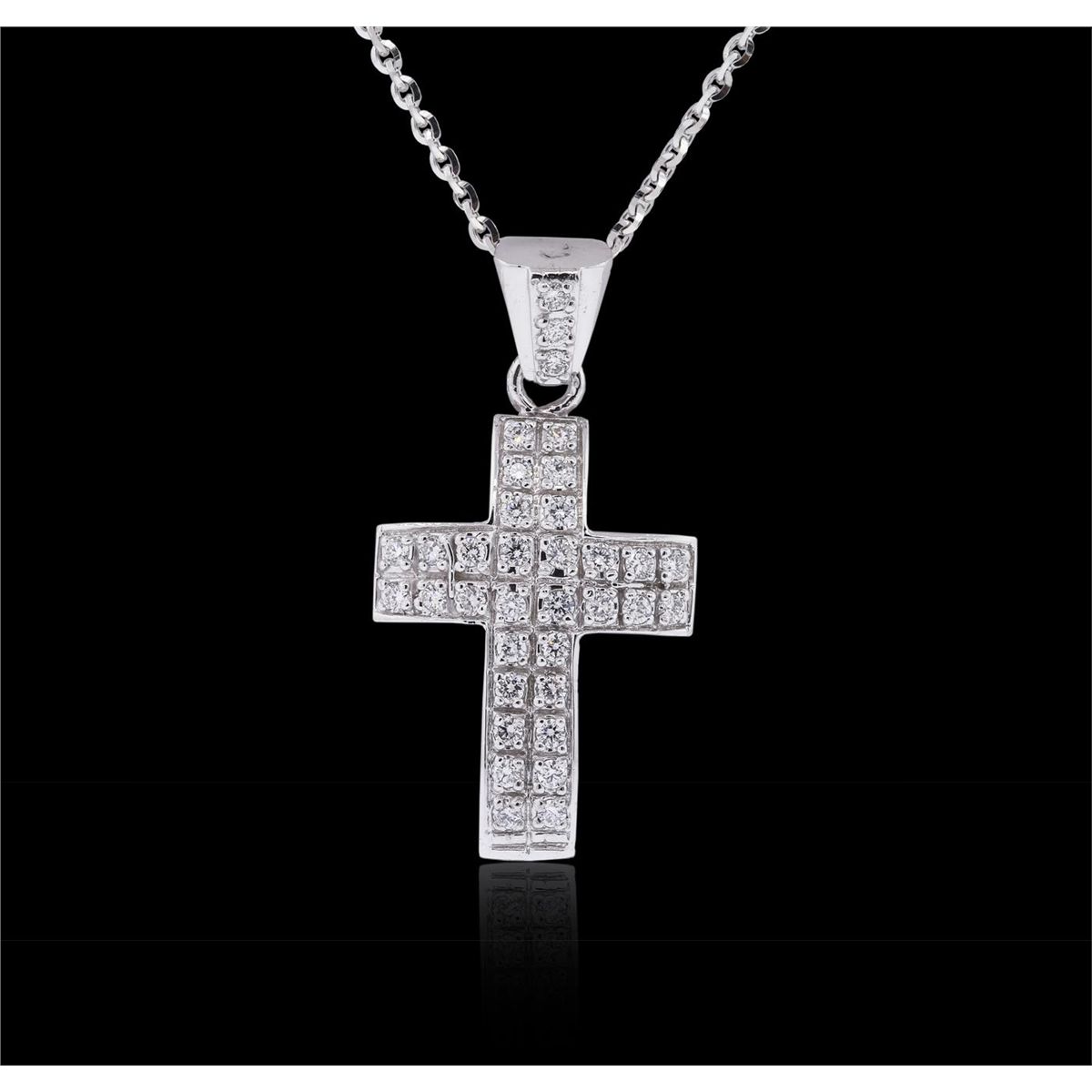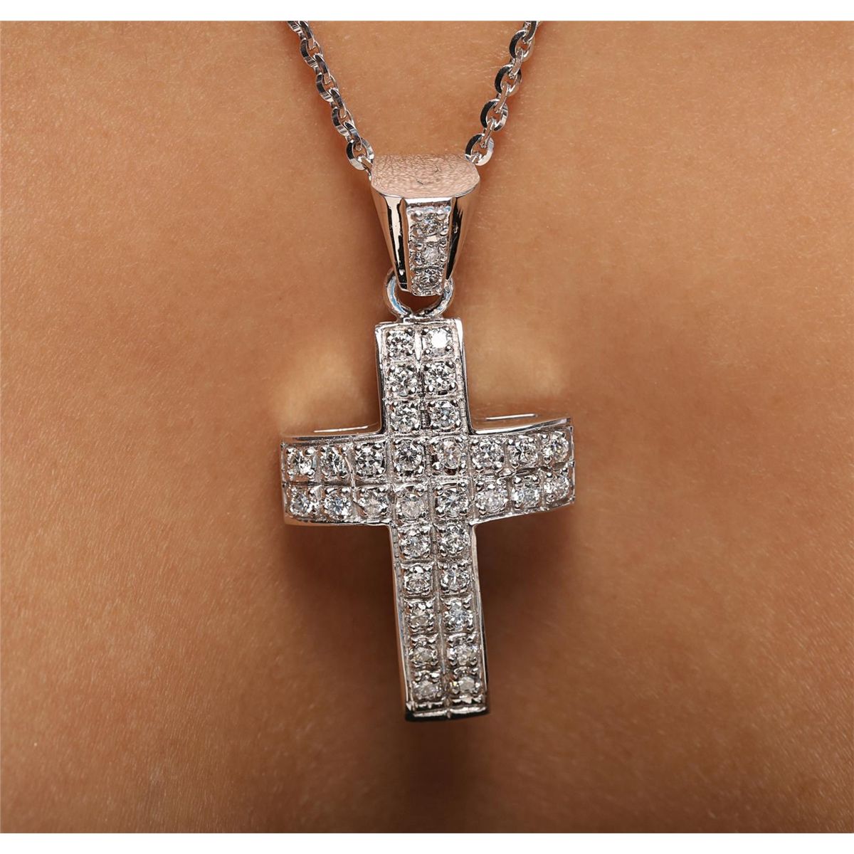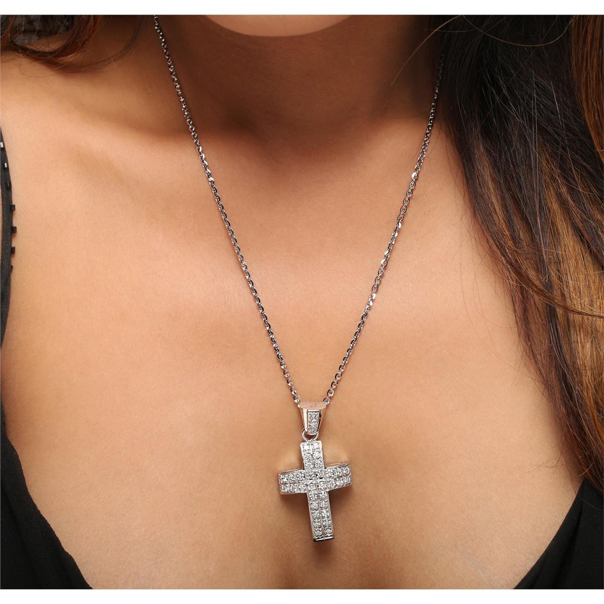 One electronically tested 14KT white gold ladies combination cast & assembled cross pendant & chain 18.0 long, large cable link with a lobster claw clasp with a bright polish finish. Identified with markings of 585. Condition is new. Containing: Thirty-Five prong set round brilliant cut diamonds, measuring 2.20 - 2.20 x 1.32mm (depth est.) approximate total weight of 35 Stones = 1.36ct. Clarity: SI-2. Color: H - J, Cut is Good. All diamonds are graded in the mounting, unless otherwise stated. Total Weight of Diamonds 1.36ct. Total Weight of Pendant & Chain 21.30 grams. GGL Appraised at $8,340.00.