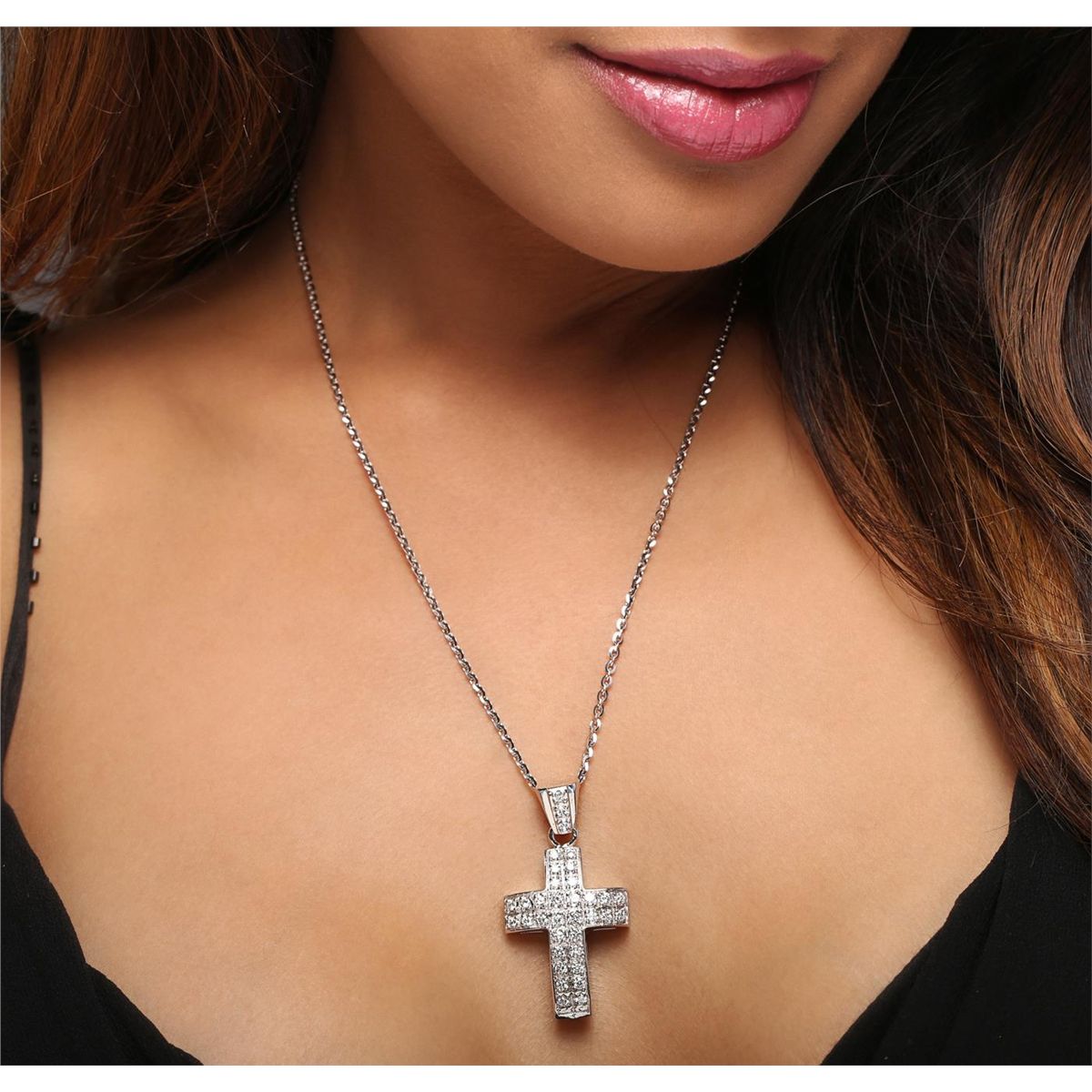 One electronically tested 14KT white gold ladies combination cast & assembled cross pendant & chain 18.0 long, large cable link with a lobster claw clasp with a bright polish finish. Identified with markings of 585. Condition is new. Containing: Thirty-Five prong set round brilliant cut diamonds, measuring 2.20 - 2.20 x 1.32mm (depth est.) approximate total weight of 35 Stones = 1.36ct. Clarity: SI-2. Color: H - J, Cut is Good. All diamonds are graded in the mounting, unless otherwise stated. Total Weight of Diamonds 1.36ct. Total Weight of Pendant & Chain 21.30 grams. GGL Appraised at $8,340.00.