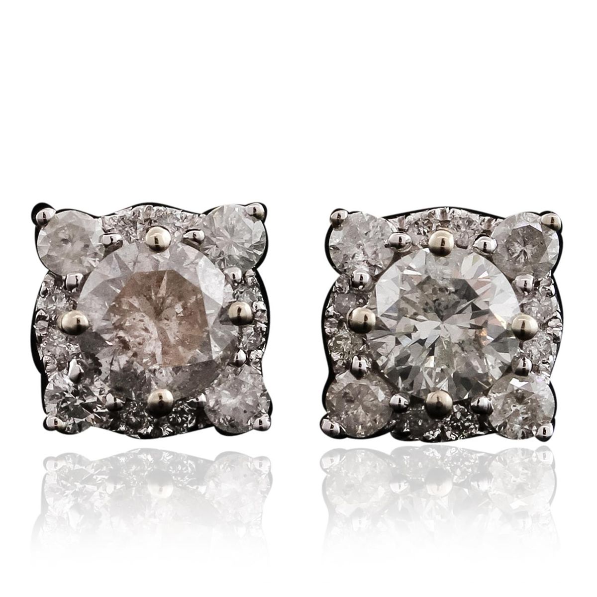 One pair electronically tested 14KT white gold ladies cast & assembled diamond cluster earrings with standard backs. Each earring features a round brilliant center set with four smaller diamonds, above a gallery of small round brilliants. Condition is new, good workmanship. Containing: Two prong set round brilliant cut diamonds, measuring 5.10 - 5.00 x 3.08mm (depth est.) approximate total weight of 2 Stones = 1.00ct. Graded in the setting. Clarity: I-2. Color: I - J Eight prong set round brilliant cut diamonds, measuring 2.20 - 2.10 x 1.31mm (depth est.) approximate total weight of 8 Stones = 0.30ct. Graded in the setting. Clarity: I-1 to I-2. Color: I - J Sixteen prong set round brilliant cut diamonds, measuring 1.00 - 1.00 x 0.60mm (depth est.) approximate total weight of 16 Stones = 0.06ct. Graded in the setting. Clarity: I-1 to I-2. Color: H - I. Total Weight of Diamonds 1.36ct. Total Weight of Earrings 2.38gm. AIG Appraised at $5,300.00.