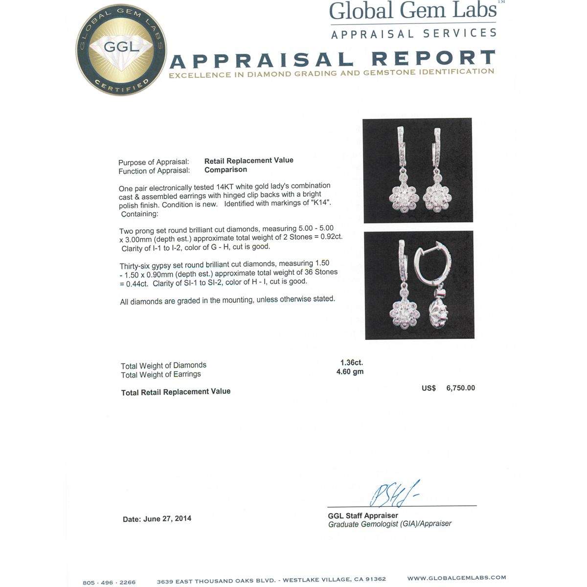 One pair electronically tested 14KT white gold Ladies combination cast & assembled earrings with hinged clip backs with a bright polish finish. Condition is new. Identified with markings of "K14". Containing: Two prong set round brilliant cut diamonds, measuring 5.00 - 5.00 x 3.00mm (depth est.) approximate total weight of 2 Stones = 0.92ct. Clarity: I-1 to I-2. Color: G - H, Cut is Good. Thirty-Six gypsy set round brilliant cut diamonds, measuring 1.50 - 1.50 x 0.90mm (depth est.) approximate total weight of 36 Stones = 0.44ct. Clarity: SI-1 to SI-2. Color: H - I, Cut is Good. All diamonds are graded in the mounting, unless otherwise stated. Total Weight of Diamonds 1.36ct. Total Weight of Earrings 4.60 grams. GGL Appraised at $6,750.00.