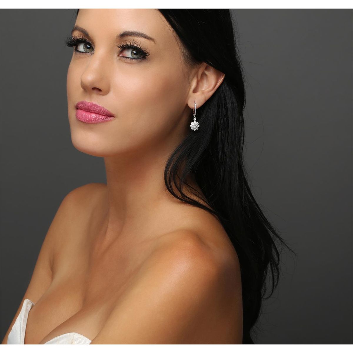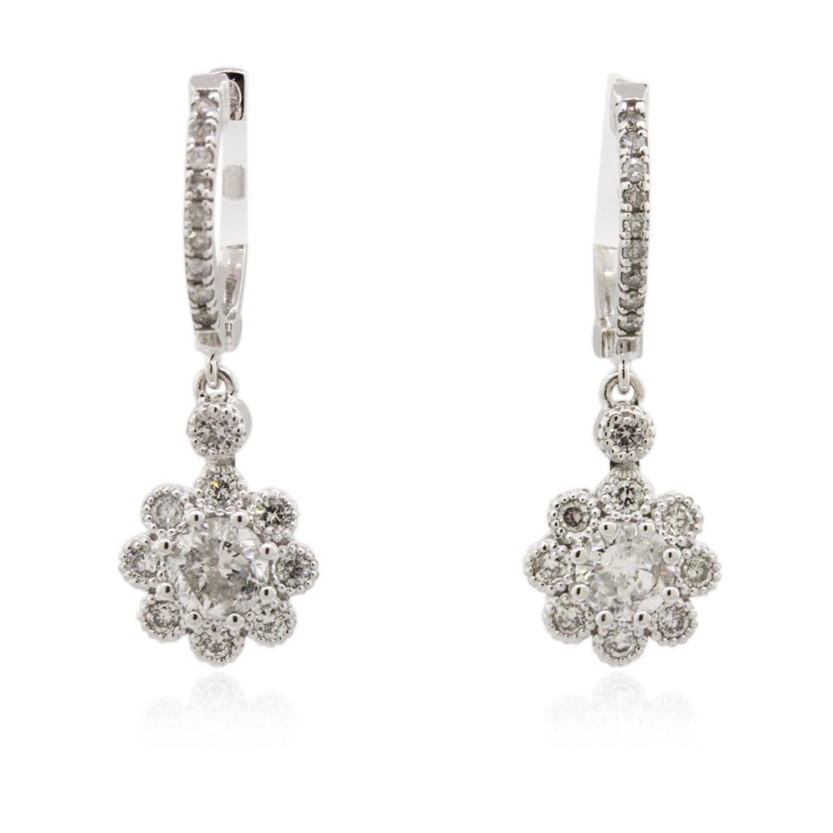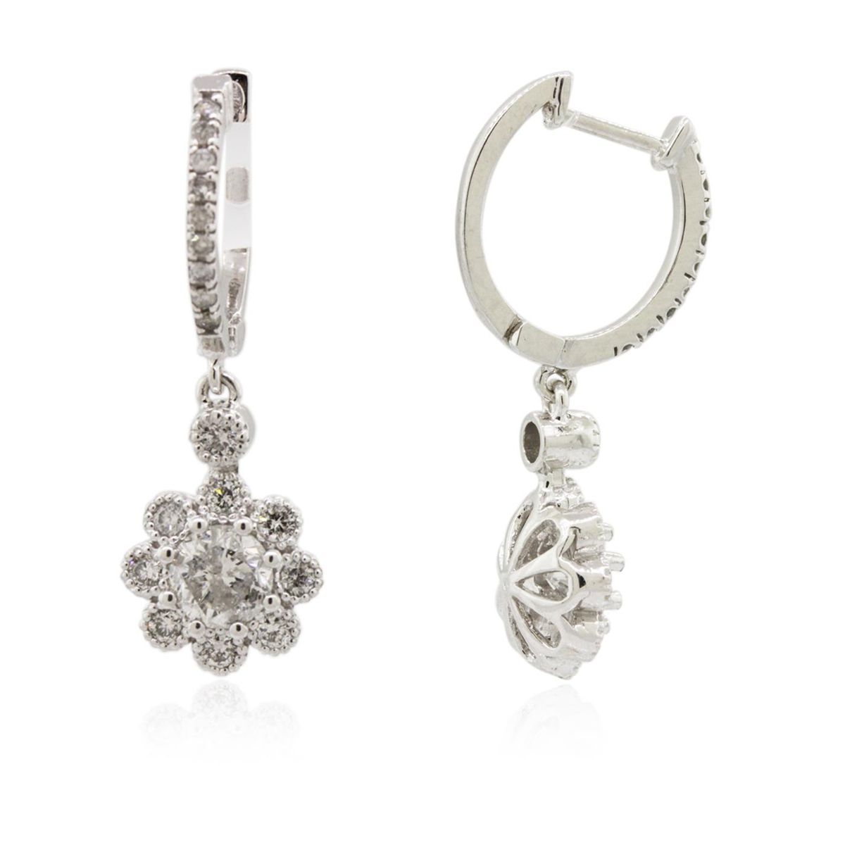 One pair electronically tested 14KT white gold Ladies combination cast & assembled earrings with hinged clip backs with a bright polish finish. Condition is new. Identified with markings of "K14". Containing: Two prong set round brilliant cut diamonds, measuring 5.00 - 5.00 x 3.00mm (depth est.) approximate total weight of 2 Stones = 0.92ct. Clarity: I-1 to I-2. Color: G - H, Cut is Good. Thirty-Six gypsy set round brilliant cut diamonds, measuring 1.50 - 1.50 x 0.90mm (depth est.) approximate total weight of 36 Stones = 0.44ct. Clarity: SI-1 to SI-2. Color: H - I, Cut is Good. All diamonds are graded in the mounting, unless otherwise stated. Total Weight of Diamonds 1.36ct. Total Weight of Earrings 4.60 grams. GGL Appraised at $6,750.00.