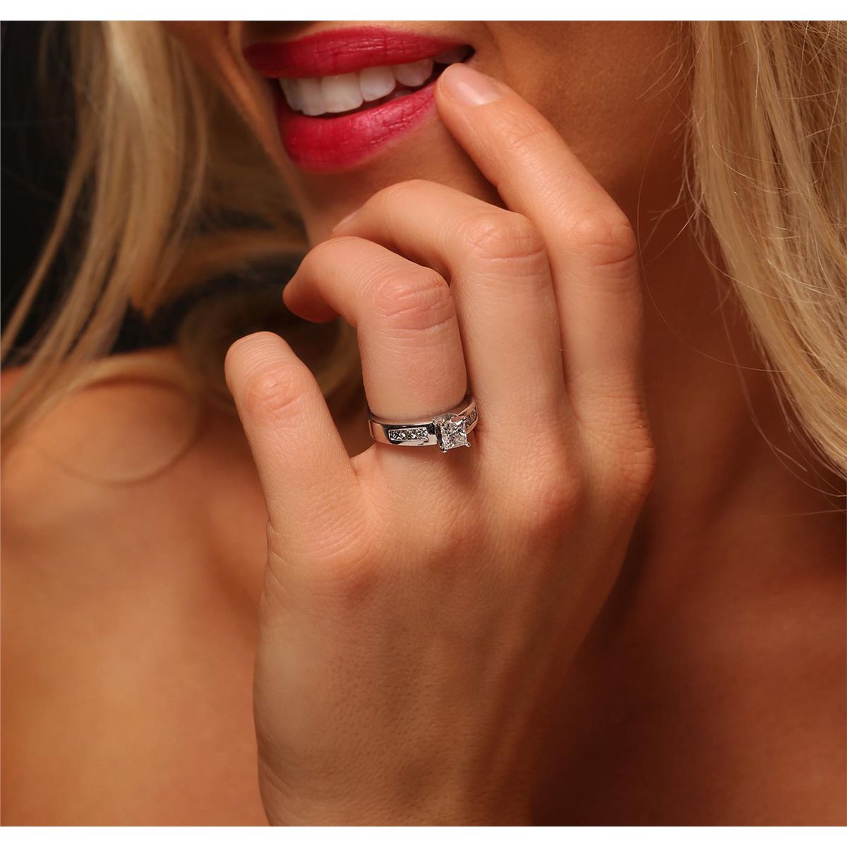 One electronically tested 14KT white gold ladies cast & assembled diamond unity ring with a bright polish finish. Condition is new, good workmanship. The featured diamond is supported by diamond set shoulders, completed by a two and one-half millimeter wide band. Identified with markings of "14K". Containing: One prong set princess cut diamond, measuring 4.50 x 4.45 x 4.00mm (depth est.) approximate weight of 0.71ct with a faint blue fluorescence. Graded in the setting. Clarity: I-1. Color: 89.9%. Table 76.4%. Six channel set princess cut diamonds, measuring 2.50 x 2.40 x 1.80mm (depth est.) approximate. Total Weight of 6 Stones = 0.65ct. Graded in the setting. Clarity: VS-1 to VS-2. Color: G - H. Total Weight of Diamonds 1.36ct. Total Weight of Ring 4.87 grams. AIG Appraised at $8,680.00.