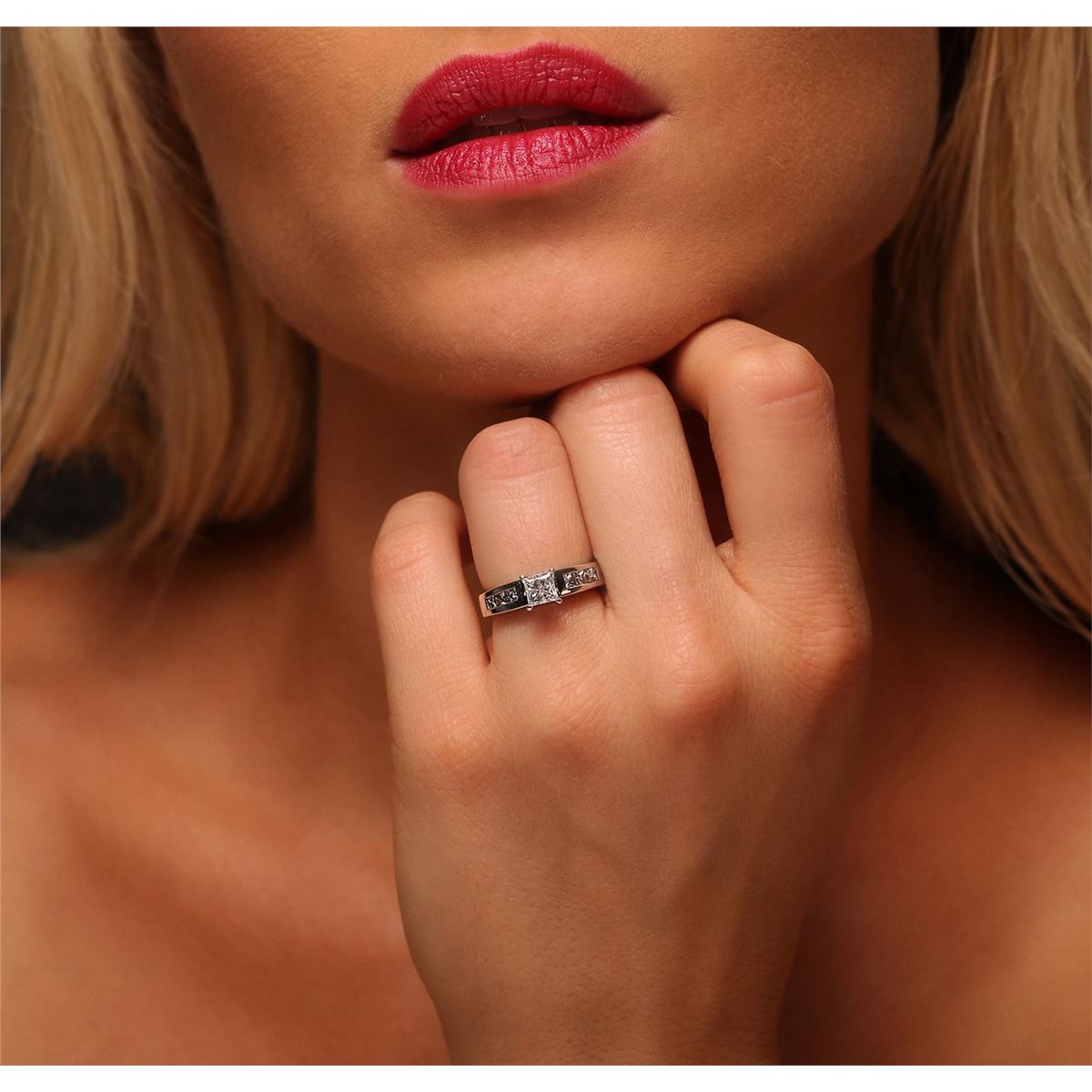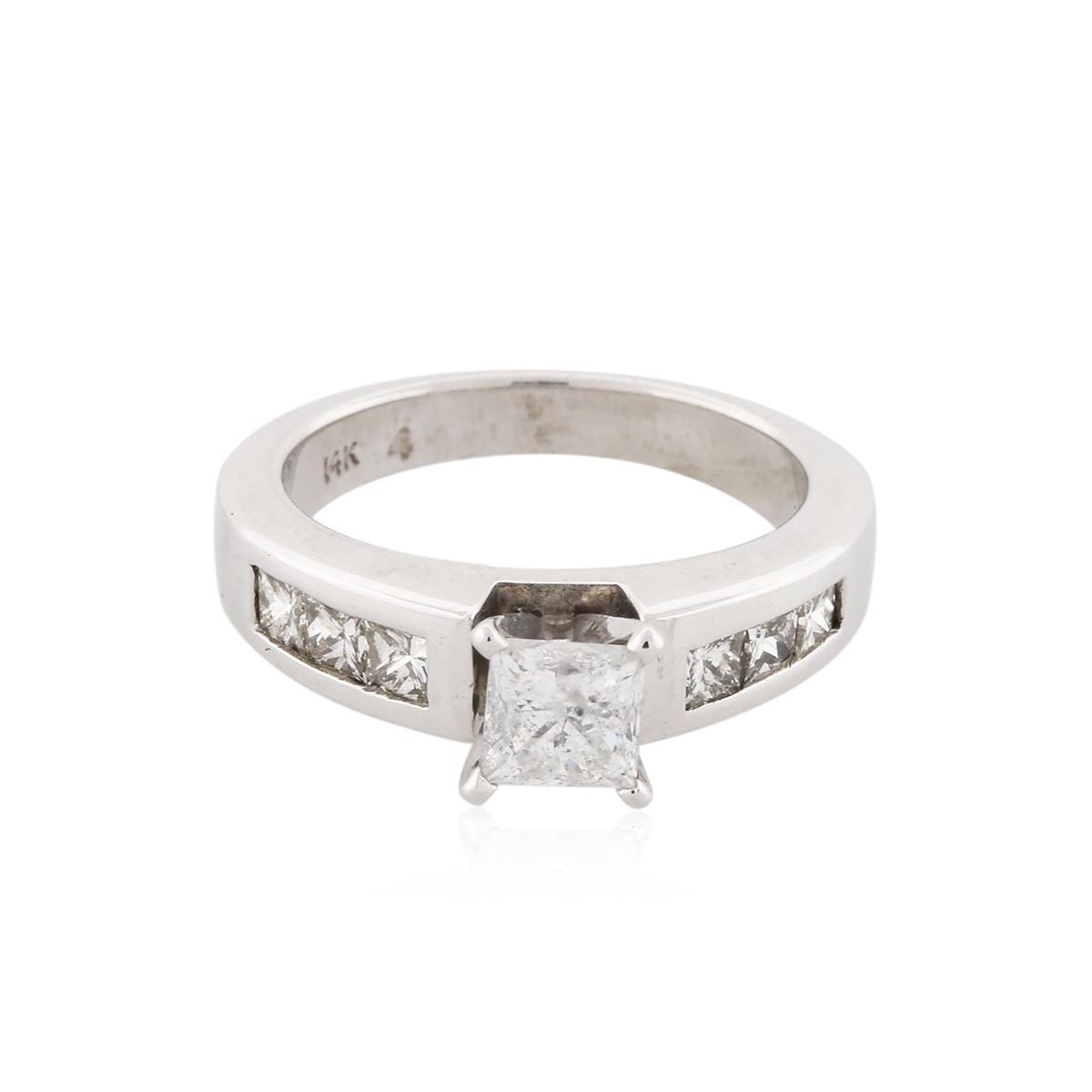 One electronically tested 14KT white gold ladies cast & assembled diamond unity ring with a bright polish finish. Condition is new, good workmanship. The featured diamond is supported by diamond set shoulders, completed by a two and one-half millimeter wide band. Identified with markings of "14K". Containing: One prong set princess cut diamond, measuring 4.50 x 4.45 x 4.00mm (depth est.) approximate weight of 0.71ct with a faint blue fluorescence. Graded in the setting. Clarity: I-1. Color: 89.9%. Table 76.4%. Six channel set princess cut diamonds, measuring 2.50 x 2.40 x 1.80mm (depth est.) approximate. Total Weight of 6 Stones = 0.65ct. Graded in the setting. Clarity: VS-1 to VS-2. Color: G - H. Total Weight of Diamonds 1.36ct. Total Weight of Ring 4.87 grams. AIG Appraised at $8,680.00.