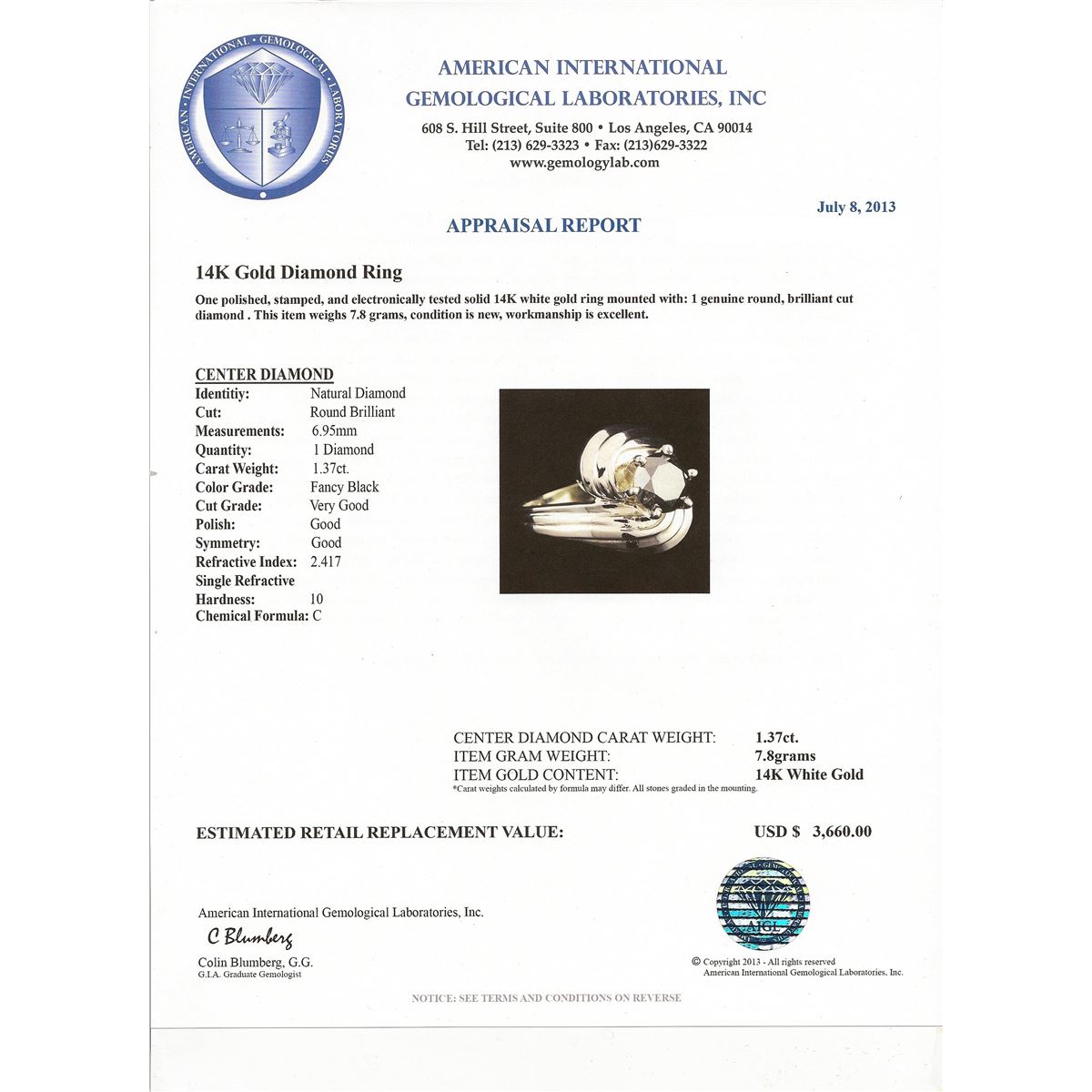 One polished, stamped, and electronically tested solid 14KT white gold ring featuring: 1 genuine round, brilliant cut diamond with a total weight of 1.37ct. This item weighs 7.8 grams, condition is new, workmanship is excellent. AIGL Appraised at $3,660.00.