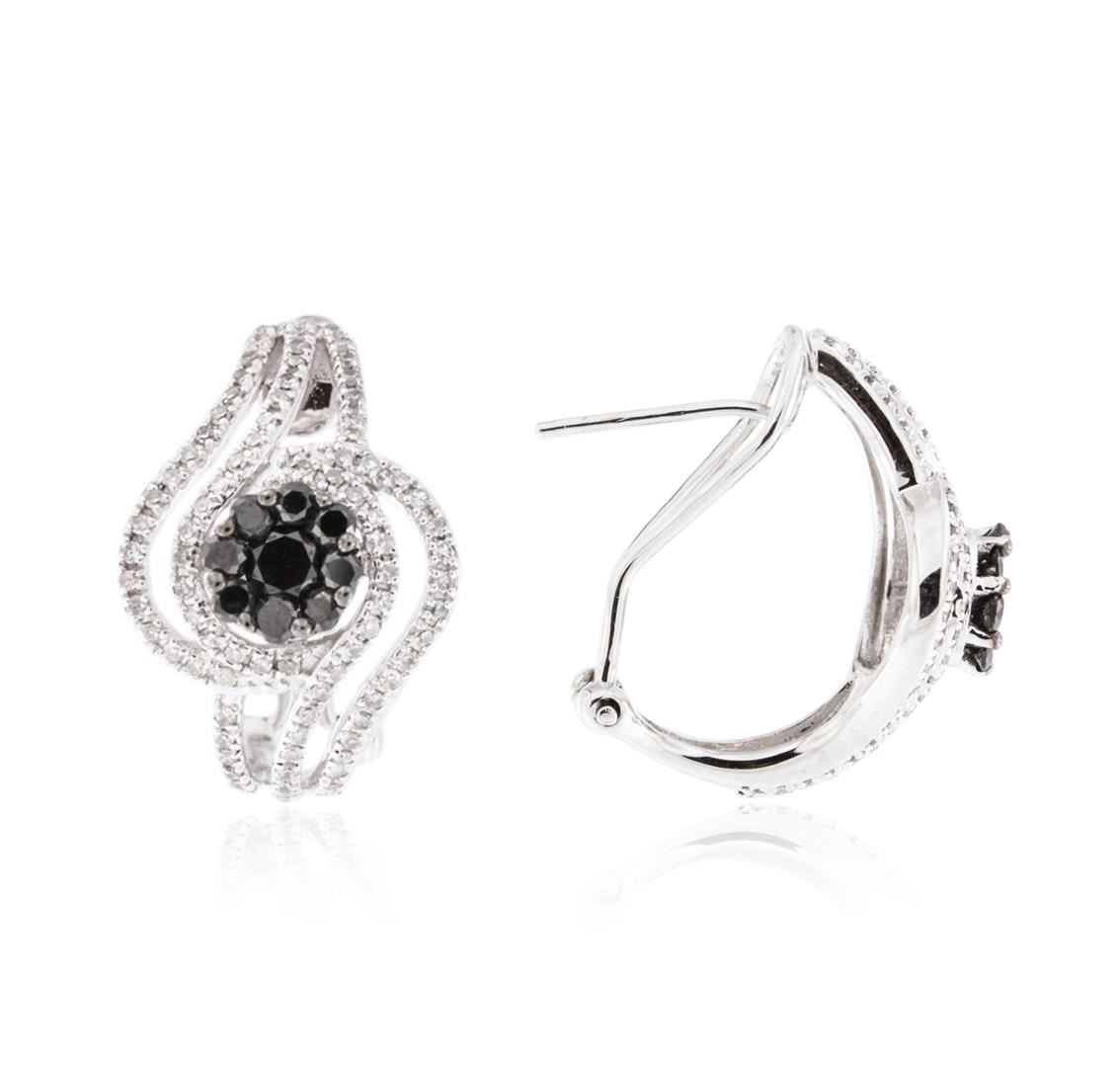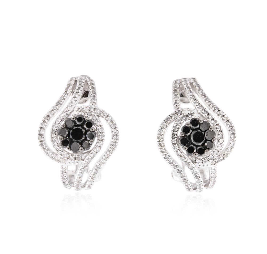 One pair of earrings featuring: 14KT white gold containing white and black diamonds with a total weight of 1.37ct. Total weight of item 6.9 grams.