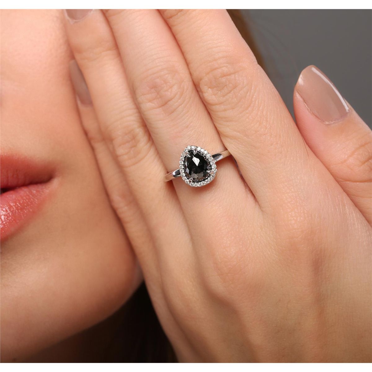 One white gold ring stamped 14k containing one natural pear rose cut fancy black diamond, enhanced for color, with a total weight of 1.26ct. The ring also contains 26 round brilliant cut side stones that are J-K color, SI3-I1 clarity with a total weight of 0.11ct. Total weight of the ring is 2.90 grams. EGL Appraised at $2,260.00.