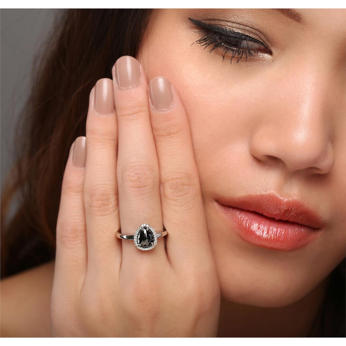 One white gold ring stamped 14k containing one natural pear rose cut fancy black diamond, enhanced for color, with a total weight of 1.26ct. The ring also contains 26 round brilliant cut side stones that are J-K color, SI3-I1 clarity with a total weight of 0.11ct. Total weight of the ring is 2.90 grams. EGL Appraised at $2,260.00.