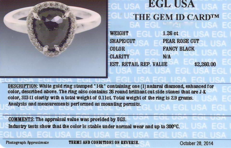 One white gold ring stamped 14k containing one natural pear rose cut fancy black diamond, enhanced for color, with a total weight of 1.26ct. The ring also contains 26 round brilliant cut side stones that are J-K color, SI3-I1 clarity with a total weight of 0.11ct. Total weight of the ring is 2.90 grams. EGL Appraised at $2,260.00.