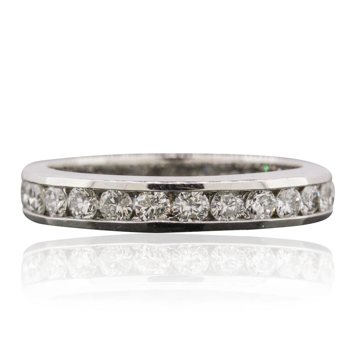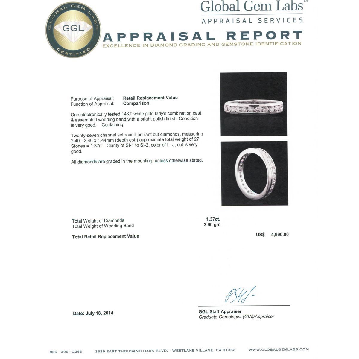 One electronically tested 14KT white gold Ladies combination cast & assembled wedding band with a bright polish finish. Condition is very good. Containing: Twenty-Seven channel set round brilliant cut diamonds, measuring 2.40 - 2.40 x 1.44mm (depth est.) approximate. Total Weight of 27 Stones = 1.37ct. Clarity: SI-1 to SI-2. Color: I - J, Cut is Very Good. All diamonds are graded in the mounting, unless otherwise stated. Total Weight of Diamonds 1.37ct. Total Weight of Wedding Band 3.90 grams.. GGL Appraised at $4,990.00.