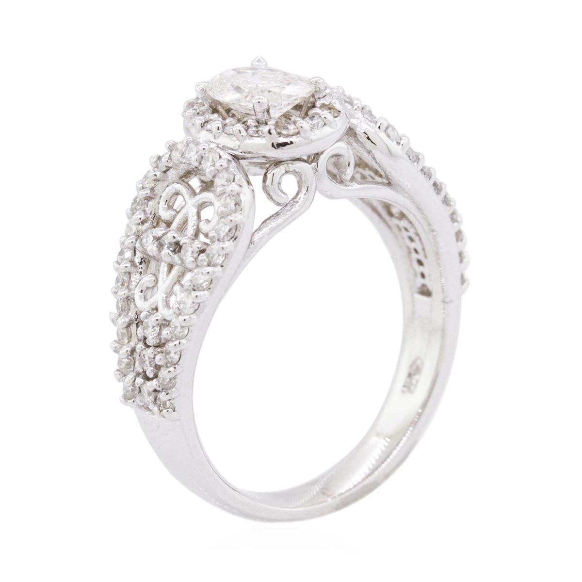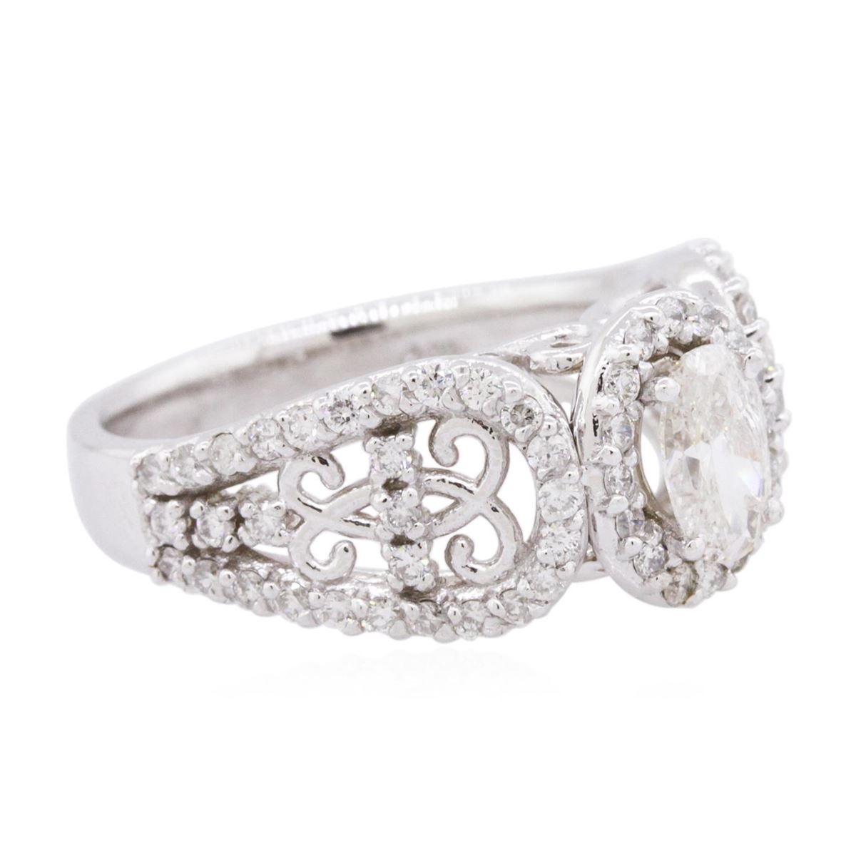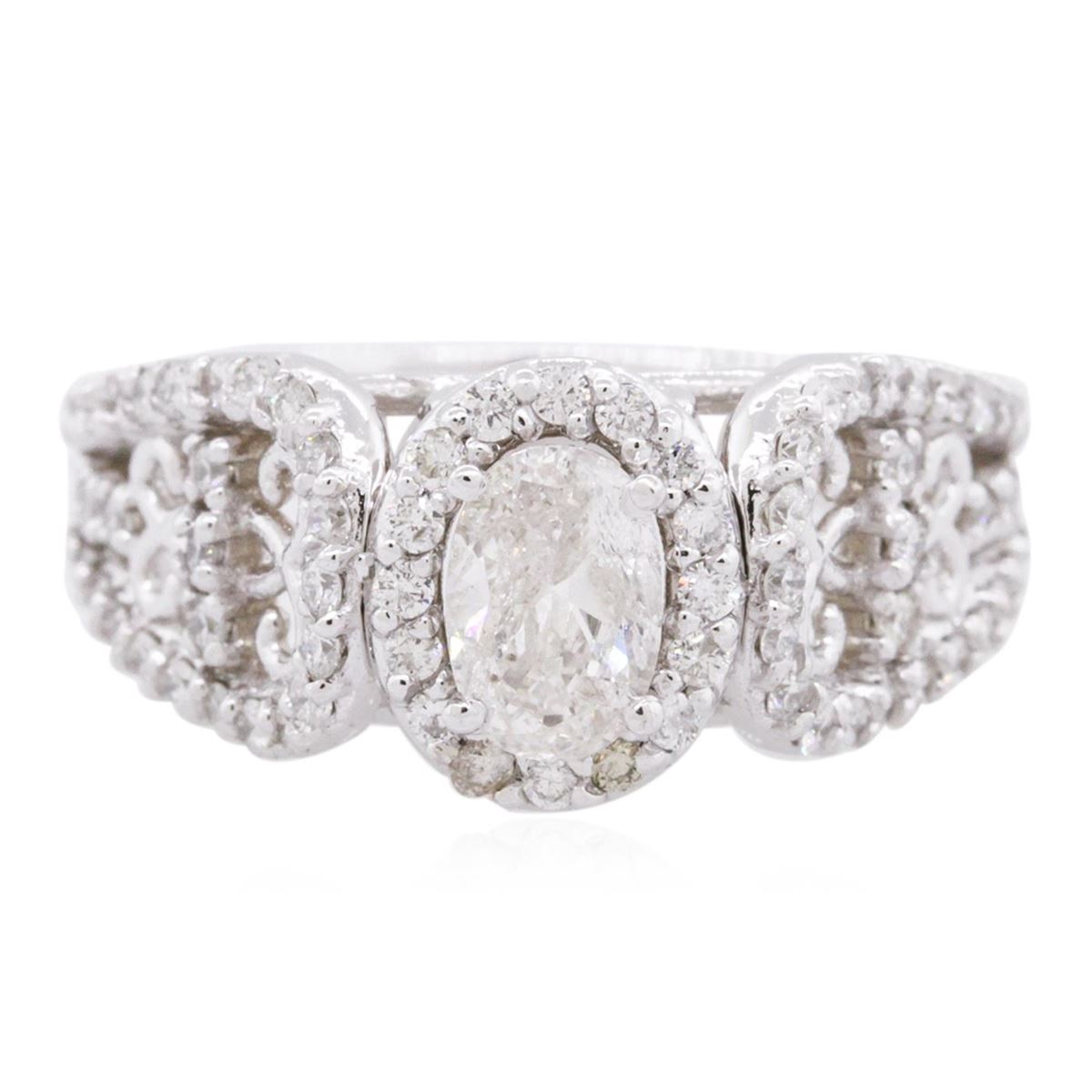 One electronically tested 14KT white gold ladies cast diamond unity ring with a bright polish finish. The featured diamond is set within a diamond bezel supported by diamond set shoulders, completed by a three millimeter wide band. Identified with markings of "K14". Condition is new, good workmanship. Containing: One prong set oval shaped cut diamond, measuring 6.80 x 4.55 x 2.55mm (depth est.) approximate weight of 0.61ct with a faint blue fluorescence. Graded in the setting. Clarity: I-2. Color: I. Depth 56.0%. Table 63.7%. Seventy-Four prong set round brilliant cut diamonds, measuring 1.40 - 1.30 x 0.81mm (depth est.) approximate total weight of 74 Stones = 0.76ct. Graded in the setting. Clarity: SI-1 to I-1. Color: G - I. Total Weight of Diamonds 1.37ct. Total Weight of Ring 6.06 grams. AIG Appraised at $5,865.00.